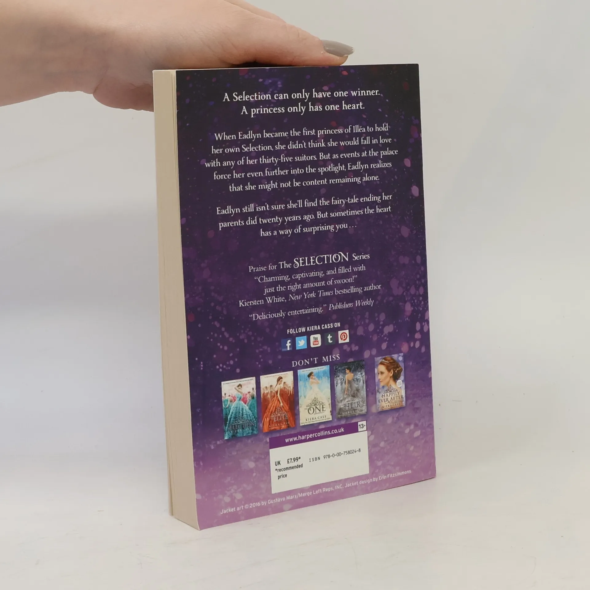 35 suitors entered the Selection. Only 1 will win her heart. The fifth and final captivating novel in Kiera Cass's #1 New York Times bestselling Selection series! In The Heir, a new era dawned in the world of The Selection. Twenty years have passed since America Singer and Prince Maxon fell in love, and their daughter is the first princess to hold a Selection of her own. Eadlyn didn't think she would find a real partner among the Selection's thirty-five suitors, let alone true love. But sometimes the heart has a way of surprising you... and now Eadlyn must make a choice that feels more difficult - and more important - than she ever expected.
