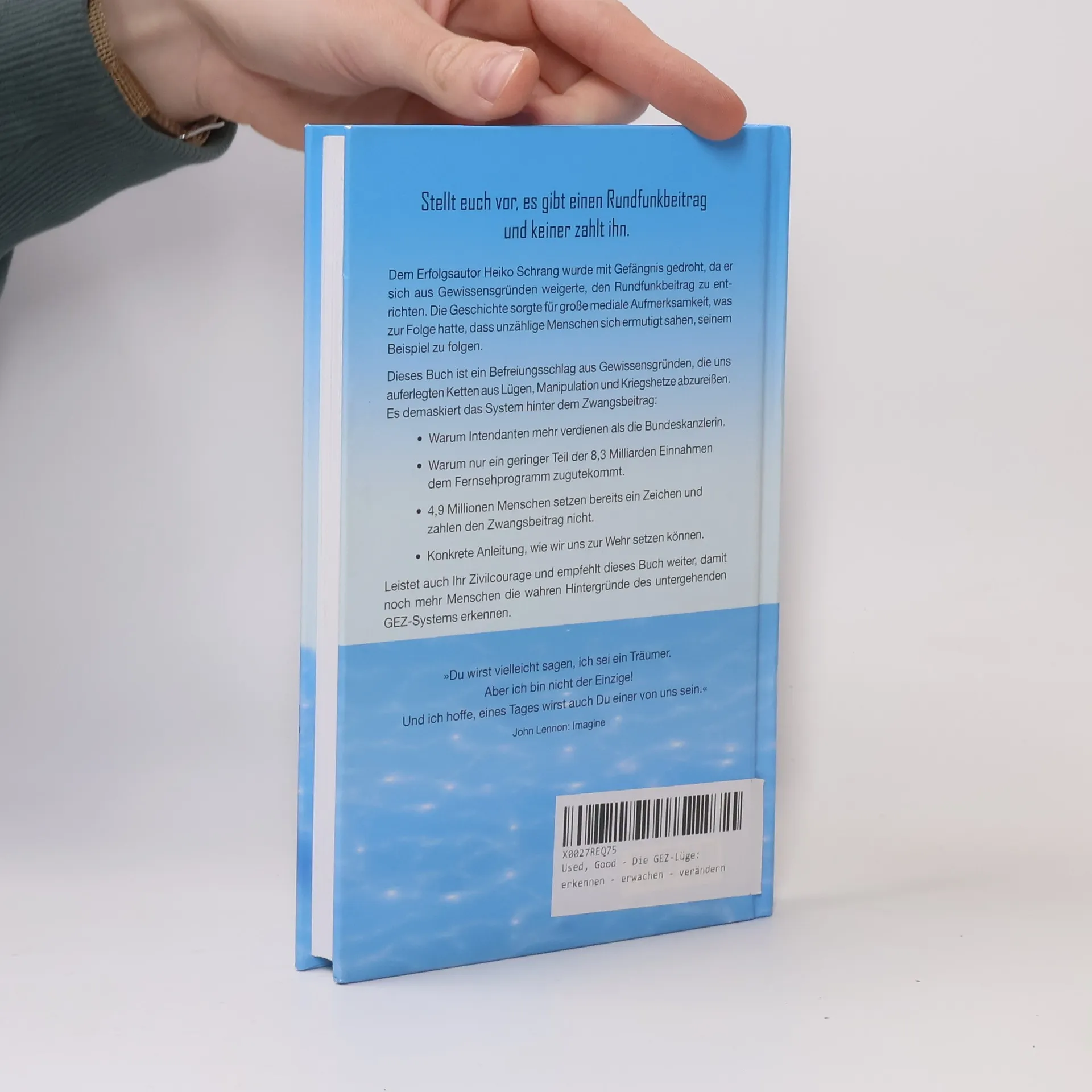 Stellt euch vor, es gibt einen Rundfunkbeitrag und keiner zahlt ihn. Dem Erfolgsautor Heiko Schrang wurde mit Gefängnis gedroht, da er sich aus Gewissensgründen weigerte, den Rundfunkbeitrag zu entrichten. Die Geschichte sorgte für große mediale Aufmerksamkeit, was zur Folge hatte, dass unzählige Menschen sich ermutigt sahen, seinem Beispiel zu folgen. Dieses Buch ist ein Befreiungsschlag aus Gewissensgründen, die uns auferlegten Ketten aus Lügen, Manipulation und Kriegshetze abzureißen. Es demaskiert das System hinter dem Zwangsbeitrag: - Warum Intendanten mehr verdienen als die Bundeskanzlerin. - Warum nur ein geringer Teil der 8,3 Milliarden Einnahmen dem Fernsehprogramm zugutekommt. - 4,9 Millionen Menschen setzen bereits ein Zeichen und zahlen den Zwangsbeitrag nicht. - Konkrete Anleitung, wie wir uns zur Wehr setzen können. Leistet auch Ihr Zivilcourage und empfehlt dieses Buch weiter, damit noch mehr Menschen die wahren Hintergründe des untergehenden GEZ-Systems erkennen. „Du wirst vielleicht sagen, ich sei ein Träumer. Aber ich bin nicht der Einzige! Und ich hoffe, eines Tages wirst auch Du einer von uns sein.“ (John Lennon: Imagine) Dieses Buch ist ein Aufruf zur Zivilcourage!
