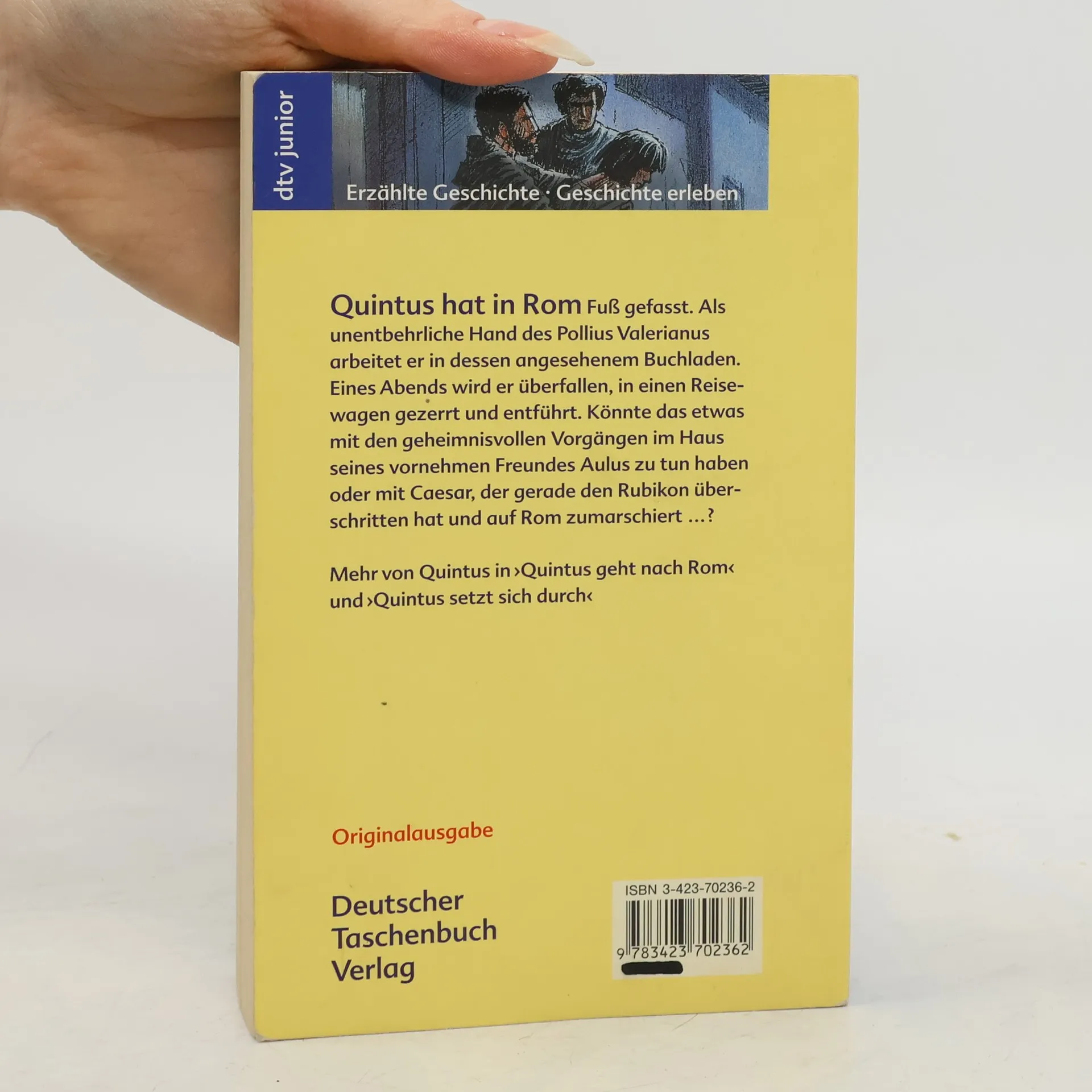 Quintus hat in Rom Fuß gefasst. Als unentbehrliche Hand des Pollius Valerianus arbeitet er in dessen angesehenem Buchladen. Eines Abends wird er überfallen, in einen Reisewagen gezerrt und entführt. Könnte das etwas mit den geheimnisvollen Vorgängen im Haus seines vornehmen Freundes Aulus zu tun haben oder mit Caesar, der Gerade den Rubikon überschritten hat und auf Rom zumaschiert? Mehr von Quintus bei dtv junior in ›Quintus geht nach Rom‹ und ›Quintus setzt sich durch‹.