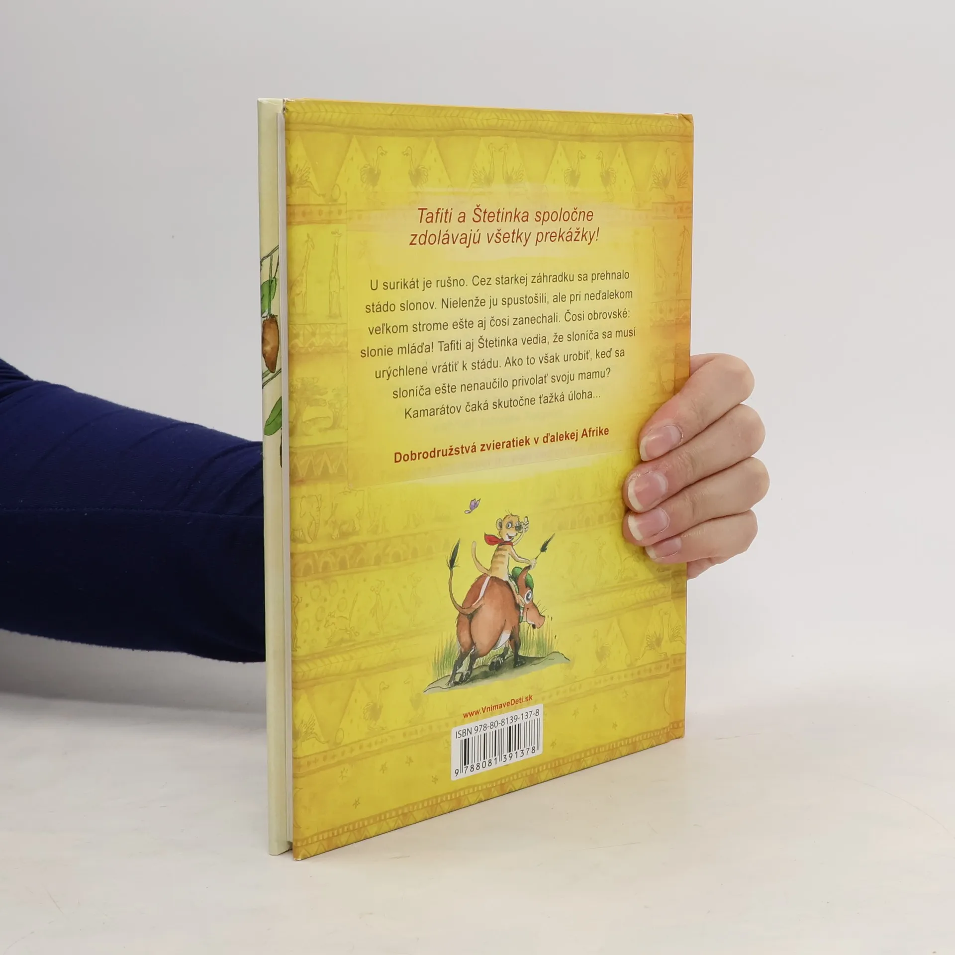 Voľné pokračovanie obľúbenej série Tafi ti má svoje tretie pokračovanie. V príbehu o roztomilej surikate sa deti tentokrát zoznámia s malým sloním mláďatkom, ktoré sa stratilo svojej mame. Stádo slonov zmizlo niekde v ďalekej savane a malý Tafi ti a jeho kamarát prasiatko Štetinka sa rozhodli nájsť spôsob, ako prilákať sloniu maminku späť ku svojmu mláďatku. Ako však dovidieť do diaľky, keď sú surikaty také drobné tvory? Ako zakričať dosť nahlas, aby ich tenké hlasy počuli aj na druhom konci krajiny? Sám sloník je ešte malý a jeho trúbenie je príliš slabé na to, aby k sebe privolal svoju rodinu. Ibaže by im niekto v tejto neľahkej situácii pomohol... Deti spoznajú v príbehu nových zvieracích obyvateľov Afriky a zažijú ďalšie napínavé dobrodružstvo s malou dávkou napätia a milého humoru.