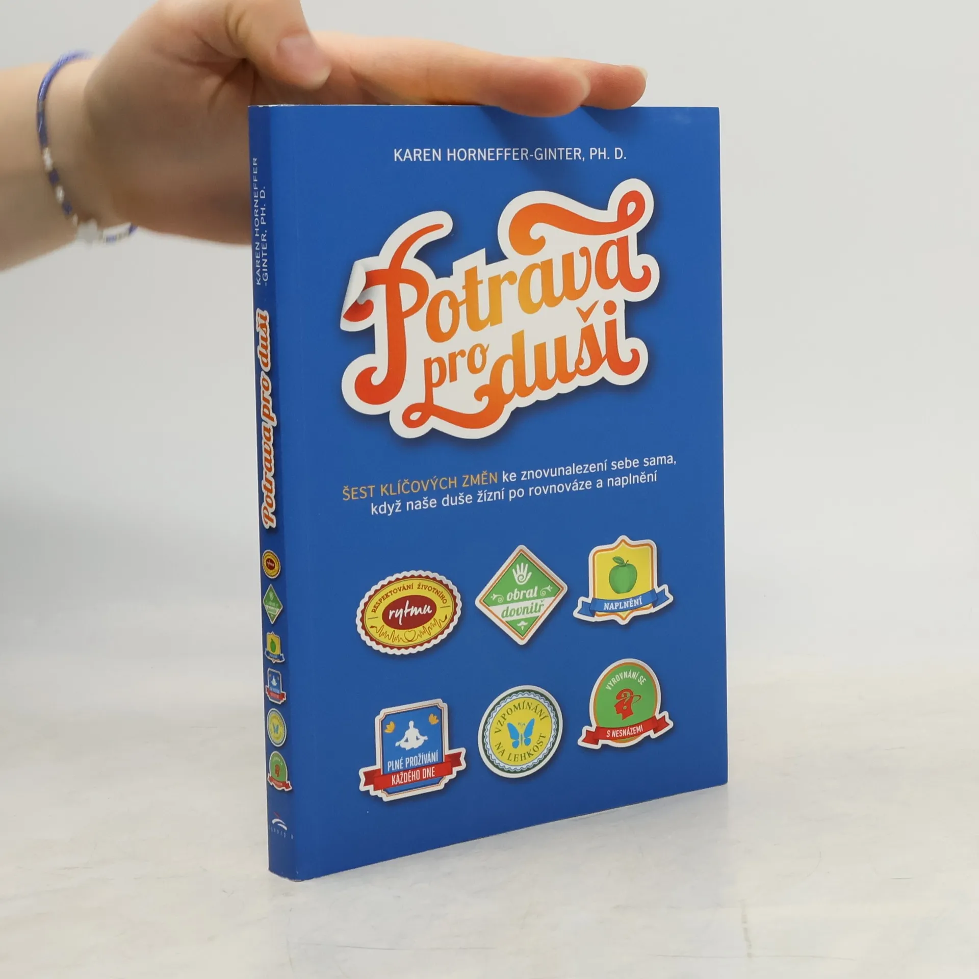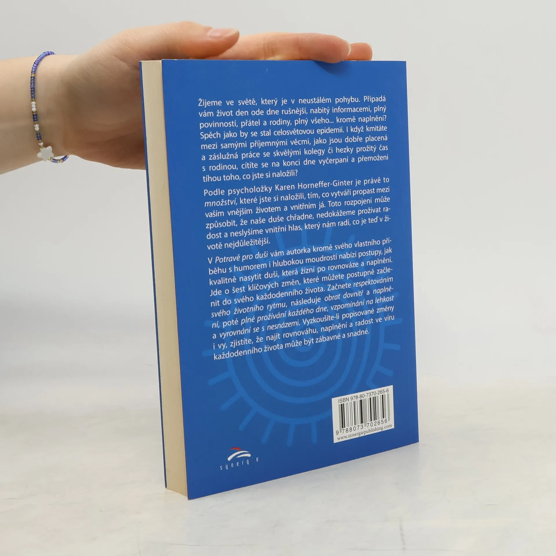 Žijeme ve světě, který je v neustálém pohybu. Připadá vám život den ode dne rušnější, nabitý informacemi, plný povinností, přátel a rodiny, plný všeho... kromě naplnění? Spěch jako by se stal celosvětovou epidemií. I když kmitáte mezi samými příjemnými věcmi, jako jsou dobře placená a záslužná práce se skvělými kolegy či hezky prožitý čas s rodinou, cítíte se na konci dne vyčerpaní a přemoženi tíhou toho, co jste si naložili? Podle psycholožky Karen Horneffer-Ginter je právě to množství, které jste si naložili, tím, co vytváří propast mezi vaším vnějším životem a vnitřním já. Toto rozpojení může způsobit, že naše duše chřadne, nedokážeme prožívat radost a neslyšíme vnitřní hlas, který nám radí, co je teď v životě nejdůležitější. V Potravě pro duši vám autorka kromě svého vlastního příběhu s humorem i hlubokou moudrostí nabízí postupy, jak kvalitně nasytit duši, která žízní po rovnováze a naplnění. Jde o šest klíčových změn, které můžete postupně začlenit do svého každodenního života. Začnete respektováním svého životního rytmu, následuje obrat dovnitř a naplnění, poté plné prožívání každého dne, vzpomínání na lehkost a vyrovnání se s nesnázemi. Vyzkoušíte-li popisované změny i vy, zjistíte, že najít rovnováhu, naplnění a radost ve víru každodenního života může být zábavné a snadné.