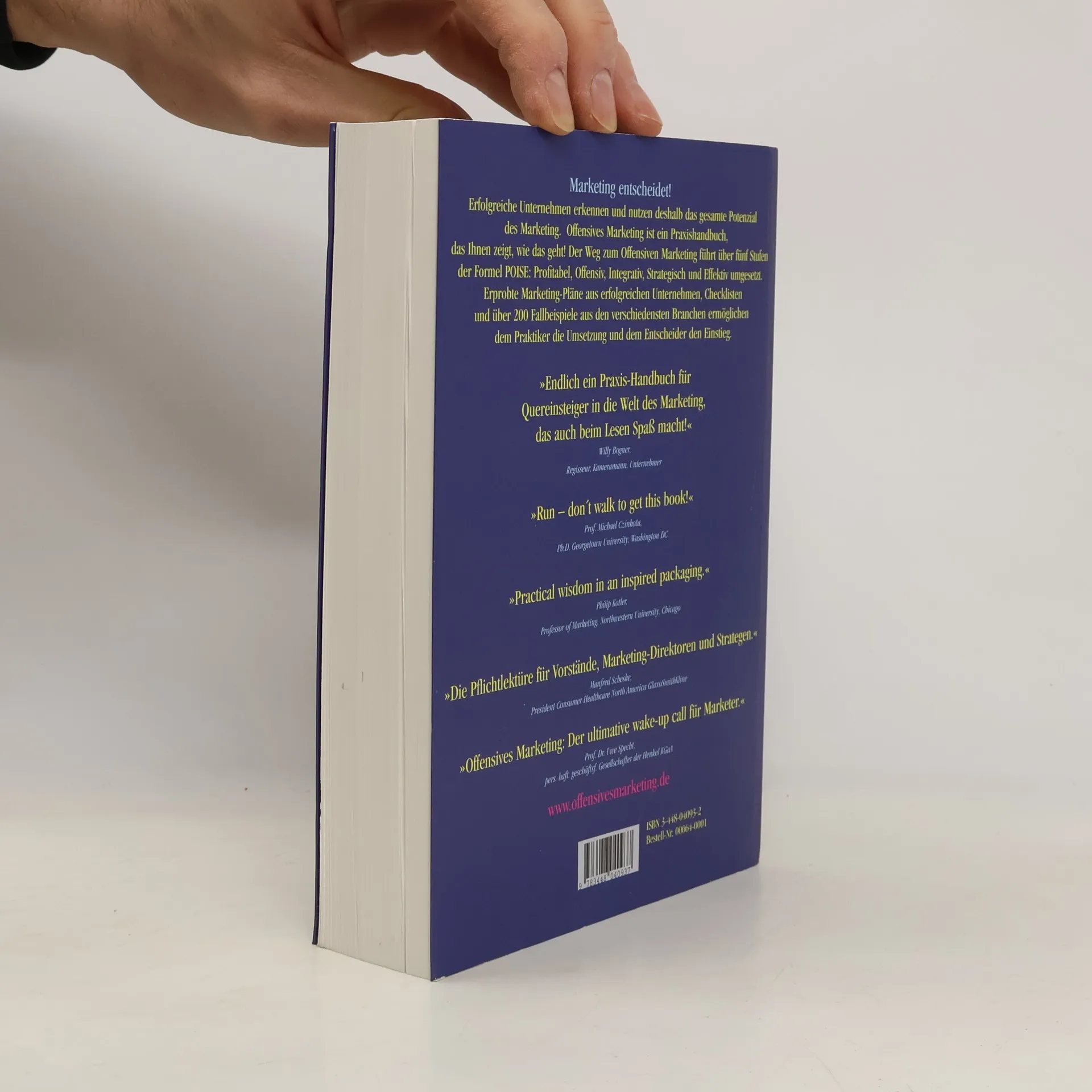 Erfolgreiche Unternehmen nutzen das gesamte Potenzial des Marketings. Offensives Marketing ist ein Praxishandbuch, das Ihnen zeigt, wie das geht! Der Weg zum Offensiven Marketing führt wird die fünf Stufen der Formel P-O-I-S-E umgesetzt: Profitabel, offensiv, integrativ, strategisch und effektiv. Offensives Marketing ist ein neuer und umfangreicher Wegweiser durch die faszinierende Welt des Marketings, voll interessanter Perspektiven, mit Lösungen zur Bewältigung moderner Führungs- und Managementaufgaben. Offensives Marketing ist ein Praxishandbuch mit vielen anregenden Beispielen. Für Studenten ist es die ideale Ergänzung zur Studiumslektüre. Wie Offensives Marketing angewendet wird, zeigt der Wegweiser „P-O-I-S-E“. Erprobte Marketing-Pläne aus erfolgreichen Unternehmen, über 200 Fallbeispiele aus den verschiedensten Branchen und zahlreiche Checklisten ermöglichen die sofortige Umsetzung.