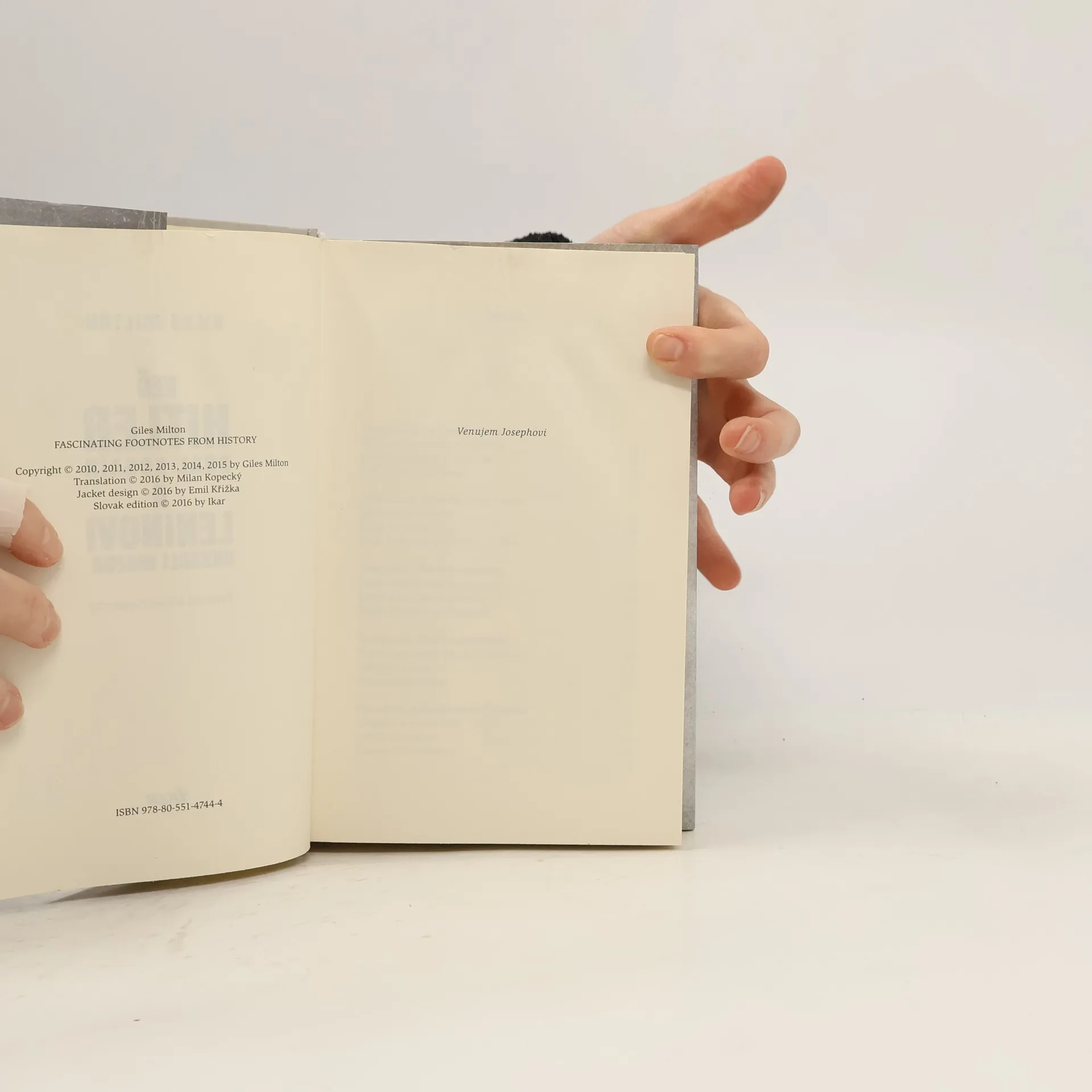 Vedeli ste, že Hitler užíval kokaín? Že Stalin vykradol banku? Že telo Charlieho Chaplina po jeho smrti ukradli a požadovali zaň výkupné? Giles Milton je majster beletrizovanej histórie. Jeho Bizarné historky z dejín, napísané osobitým, pútavým štýlom, ponúkajú stovku fascinujúcich historiek, čriepkov histórie, ktoré pôsobia ako výplody spisovateľovej fantázie, ale každé slovo na nich je pravdivé. Hrdinami historiek sú osobnosti ako Hiroo Onoda, posledný japonský vojak, ktorý bojoval v druhej svetovej vojne ešte v roku 1974, Agatha Christie, ktorá sa v roku 1926 na jedenásť dní záhadne stratila, alebo Werner Franz, stevard, ktorý prežil pád Hindenburgu, keď vzducholoď v roku 1937 zachvátili plamene. Bizarné historky z dejín prinášajú aj odpoveď na to, kto zjedol posledného dronta, kto v skutočnosti zabil Rasputina a prečo má seržant Stubby štyri nohy. Týmito faktograficky precíznymi historkami Giles Milton ukazuje v novom svetle rozličné neslávne udalosti a mnohé rázovité postavy (a zvieratá) z dejín, ktoré spoločne tvoria pestrú galériu špiónov, lotrov, kanibalov, dobrodruhov a otrokov naprieč dvadsiatimi storočiami a šiestimi svetadielmi. Z anglického originálu Fascinating Footnotes from History
