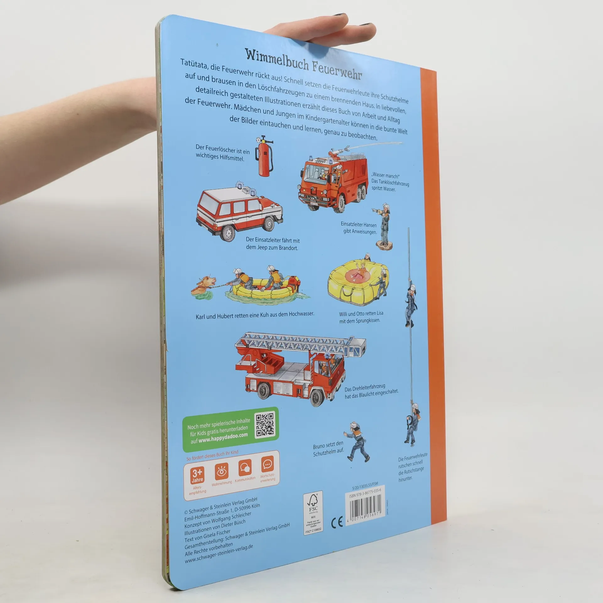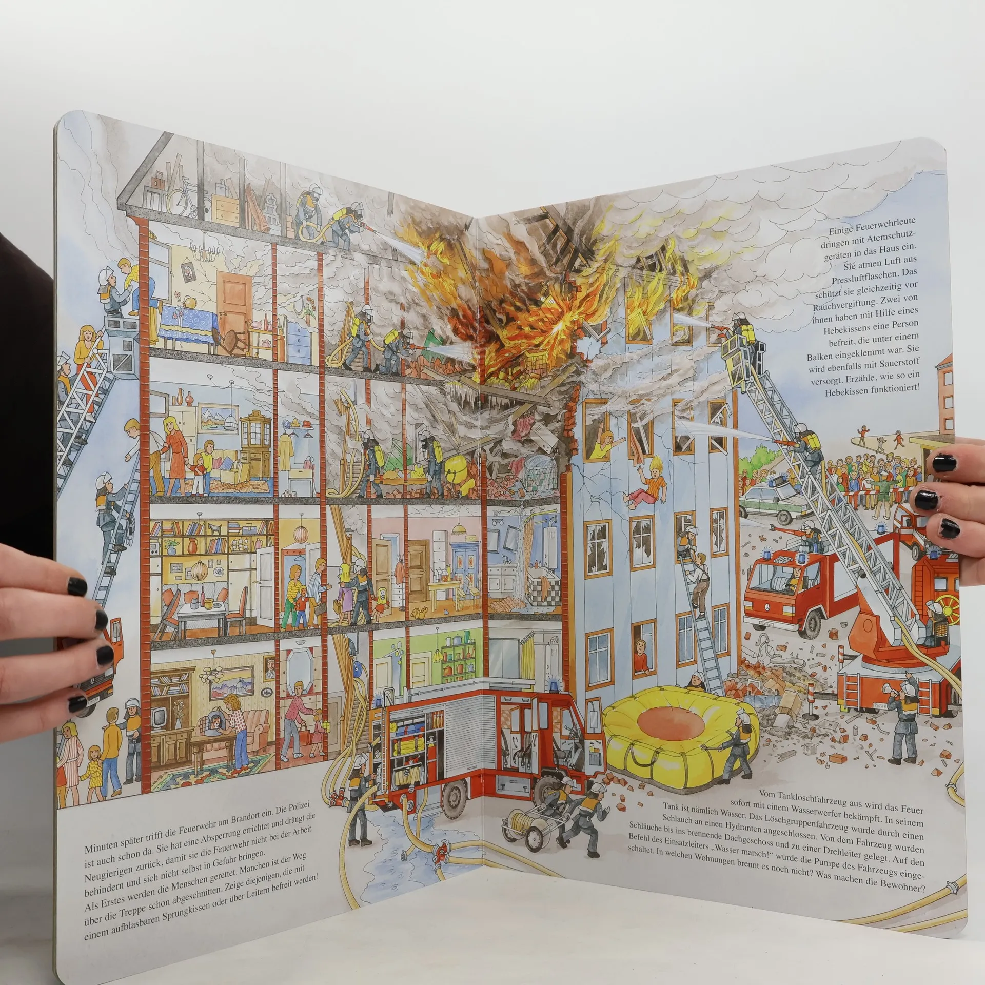 Tatütata, die Feuerwehr rückt aus! Schnell setzen die Feuerwehrleute ihre Schutzhelme auf und brausen in den Löschfahrzeugen zu einem brennenden Haus. In liebevollen, detailreich gestalteten Illustrationen erzählt dieses Buch von Arbeit und Alltag der Feuerwehr. Mädchen und Jungen im Kindergartenalter können in die bunte Welt der Bilder eintauchen und lernen, genau zu beobachten