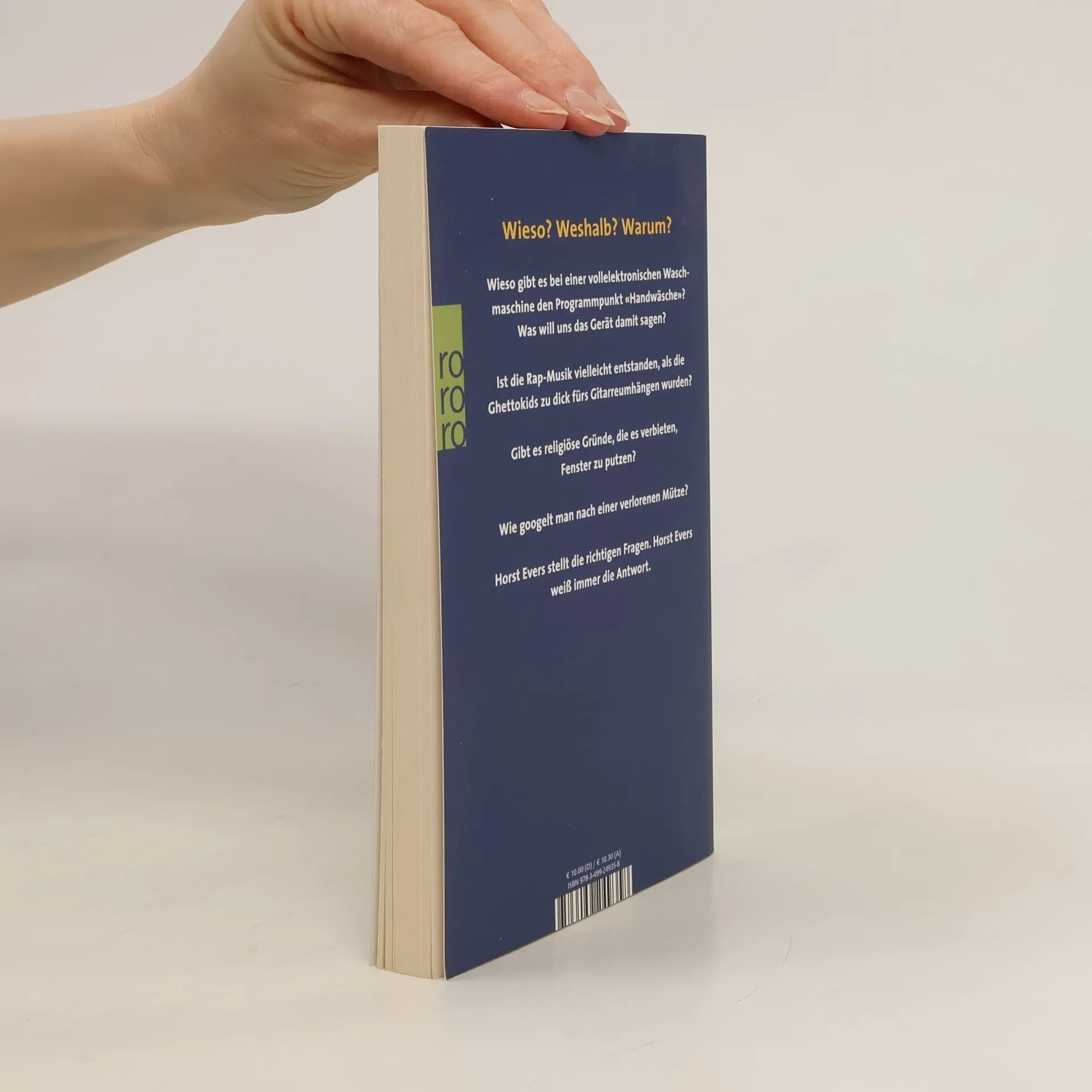 Wieso? Weshalb? Warum? Wieso gibt es bei einer vollelektronischen Wasch-maschine den Programmpunkt «Handwäsche»? Was will uns das Gerät damit sagen? Ist die Rap-Musik vielleicht entstanden, als die Ghettokids zu dick fürs Gitarreumhängen wurden? Gibt es religiöse Gründe, die es verbieten, Fenster zu putzen? Wie googelt man nach einer verlorenen Mütze? Horst Evers stellt die richtigen Fragen. Horst Evers weiß immer die Antwort.