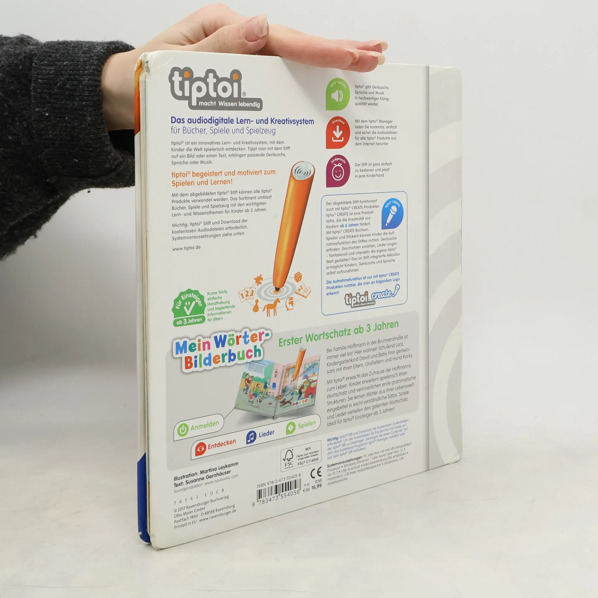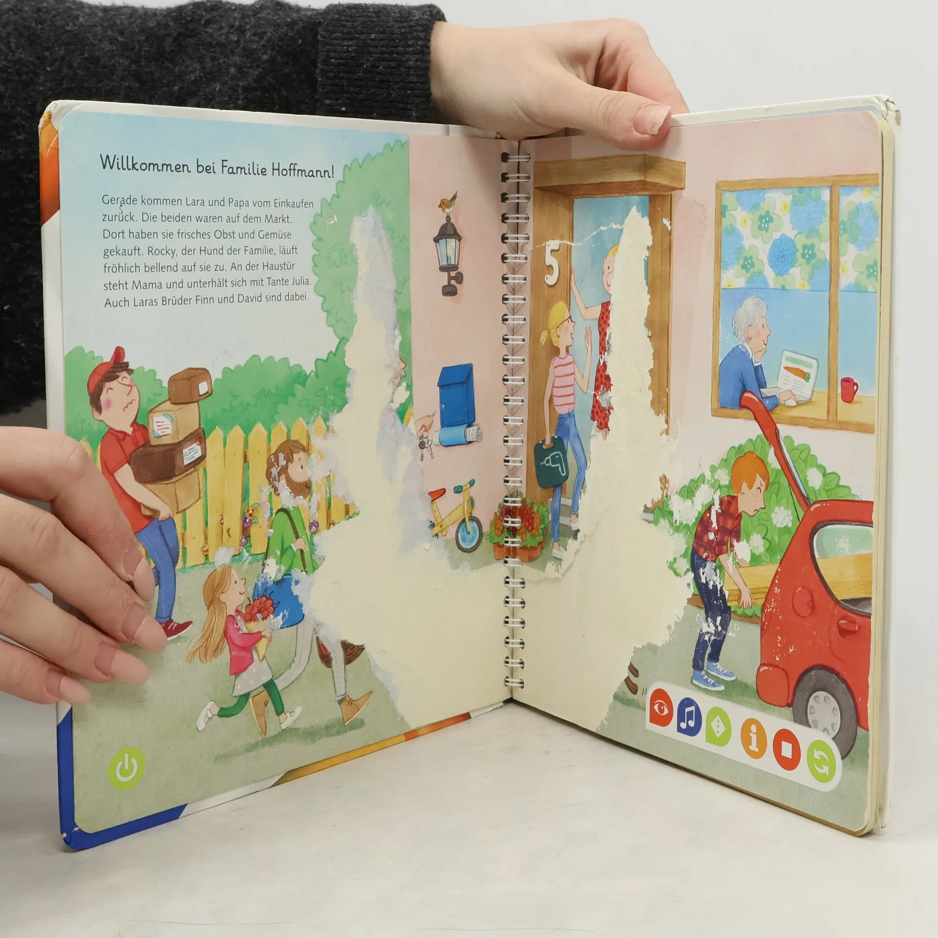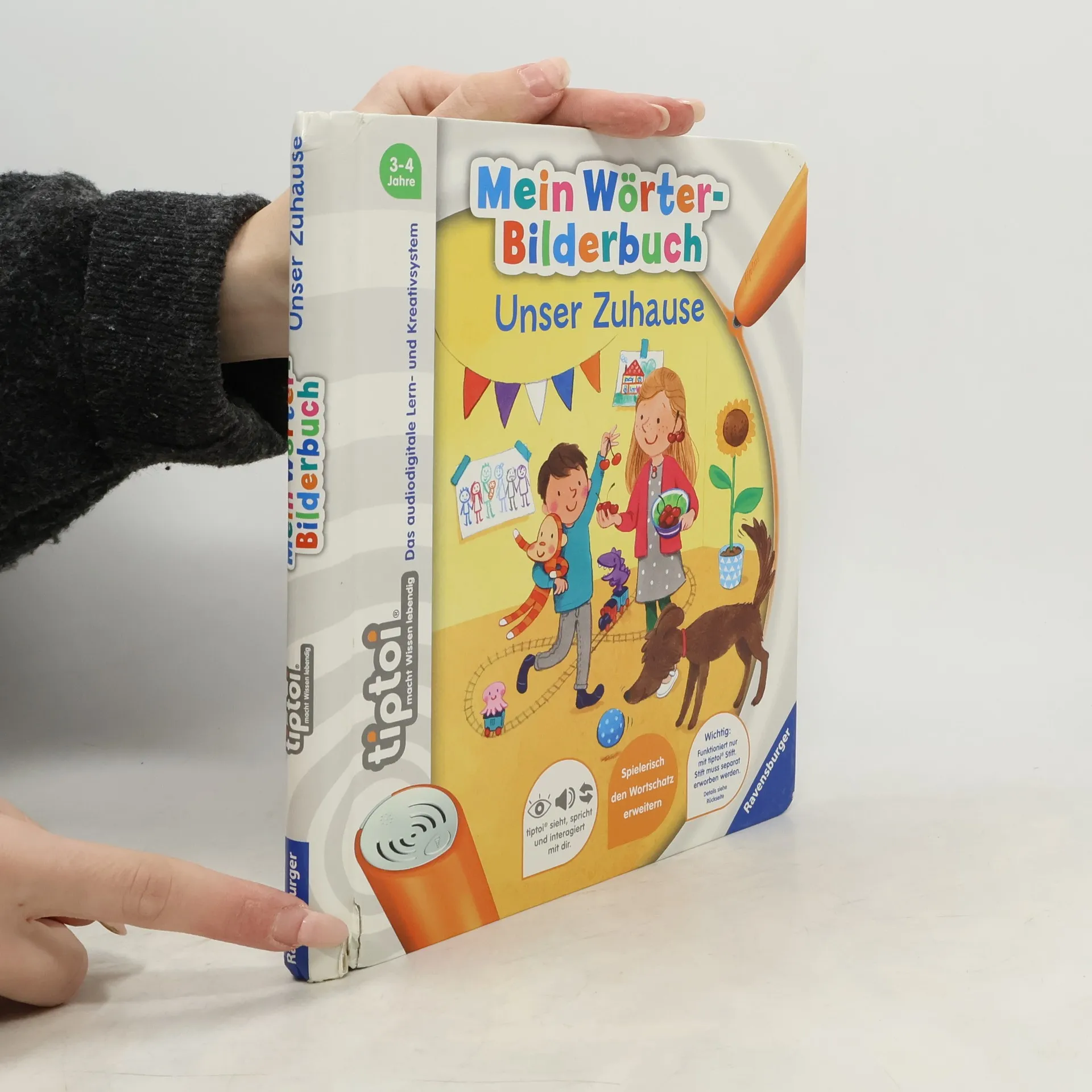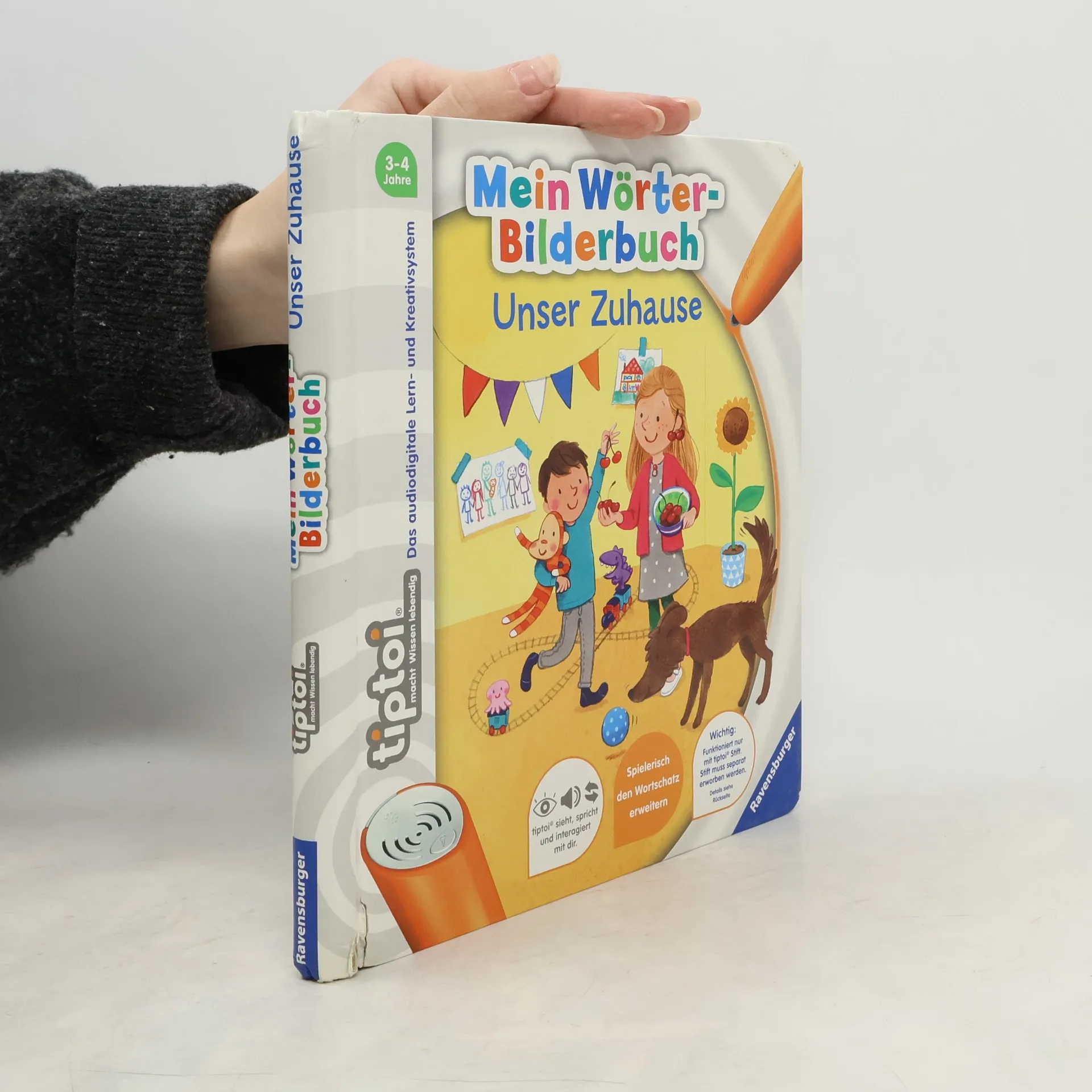 Wörterlernen leicht gemacht: spielerischer Spracherwerb! Willkommen bei uns Zuhause! Hier wohnen Schulkind Lara, Kindergartenkind David und Baby Finn gemeinsam mit ihren Eltern, Großeltern und Hund Rocky. Mit tiptoi erwacht das Zuhause der Hoffmanns zum Leben. Was gibt es in der Küche zu entdecken? Welche Farben hat das Spielzeug? Was macht man vor dem Zubettgehen? Kinder erweitern spielerisch ihren Wortschatz und verinnerlichen erste grammatische Strukturen. Spiele und Lieder vertiefen den gelernten Wortschatz. Mit der Reihe tiptoi Mein Wörter-Bilderbuch bauen Kinder spielerisch ihren Wortschatz auf und erweitern diesen selbstständig. Die kurzen, leicht verständlichen Texte eignen sich ideal für Kinder ab 3 Jahren. Jedes Buch zeigt den Kindern bekannte Szenen und Situationen und vermittelt viele vertraute Begriffe aus dem direkten Umfeld und der Erfahrungswelt der Kinder. Überall gibt es spannende Sätze, zahlreiche Dialoge und lustige Geräusche zu entdecken. Dabei sind die einzelnen Begriffe in ganze Sätze eingebunden, um den Kindern erste grammatische Strukturen zu vermitteln. In jedem Buch wird das Gelernte durch kindgerechte und abwechslungsreiche Spiele mit Lösungskontrolle abgefragt und vertieft. Neukomponierte Lieder und liebevolle Geschichten motivieren zum spielerischen Wörterlernen. tiptoi-Stift nicht enthalten. Muss separat erworben werden.