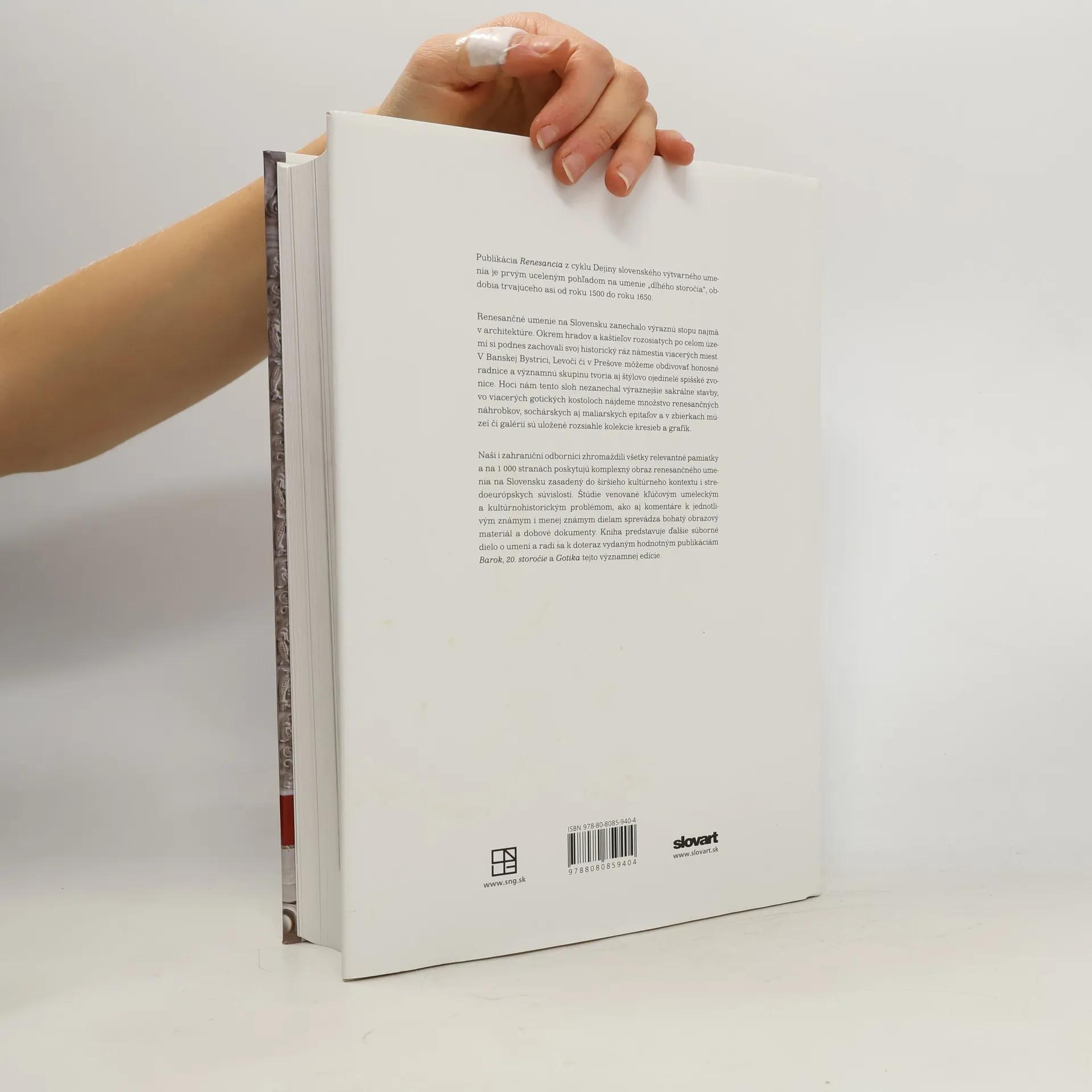 Obsiahla publikácia Renesancia z cyklu Dejiny slovenského výtvarného umenia je prvým uceleným pohľadom na umenie „dlhého storočia“, od konca 15. do polovice 17. storočia. Renesančné umenie na Slovensku zanechalo výraznú stopu v architektúre. Námestia viacerých miest, napríklad Levoče či Prešova si podnes zachovali svoj historický ráz, významnú skupinu tvoria radnice a spišské zvonice, rovnako ako po celom Slovensku „rozosiate“ renesančné kaštiele. V mnohých gotických kostoloch sa dochovalo množstvo renesančných náhrobkov, sochárskych i maliarskych epitafov a poskromne sa v kostoloch objavujú už aj manieristické oltáre. Domáci i zahraniční autori zhromaždili v publikácii všetky relevantné pamiatky tohto obdobia, analyzujú známe, menej známe i neznáme diela, podávajú vyčerpávajúci a komplexný obraz v širšom kultúrnom kontexte a stredoeurópskych súvislostiach. Kniha Renesancia je určená širokej kultúrnej obci, jej bohatú textovú a obrazovú časť (takmer 800 reprodukcií) dopĺňa poznámkový aparát, bibliografia, tabuľky, mapy a registre. Po predchádzajúcich publikáciách – Barok, 20. storočie a Gotika – je Renesancia ďalším, v poradí už štvrtým zväzkom obsiahleho cyklu Dejiny slovenského výtvarného umenia, ktoré pripravuje Slovenská národná galéria v spolupráci s Vydavateľstvom SLOVART.