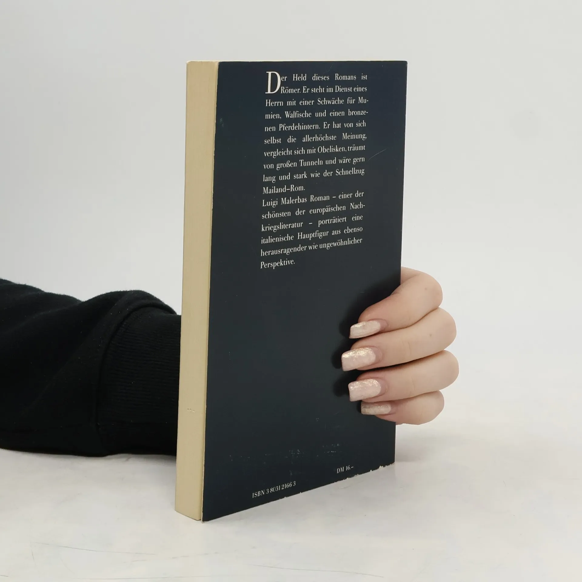 Der Held dieses Romans ist Römer. Er steht im Dienst eines Herrn mit einer Schwäche für Mumien, Walfische und einen bronzenen Pferdehintern. Er hat von sich selbst die allerhöchste Meinung, vergleicht sich mit Obelisken, träumt von großen Tunneln und wäre gern lang und stark wie der Schnellzug Mailand-Rom. Luigi Malerbas Roman porträtiert eine italienische Hauptfigur aus ebenso herausragender wie ungewöhnlicher Perspektive.