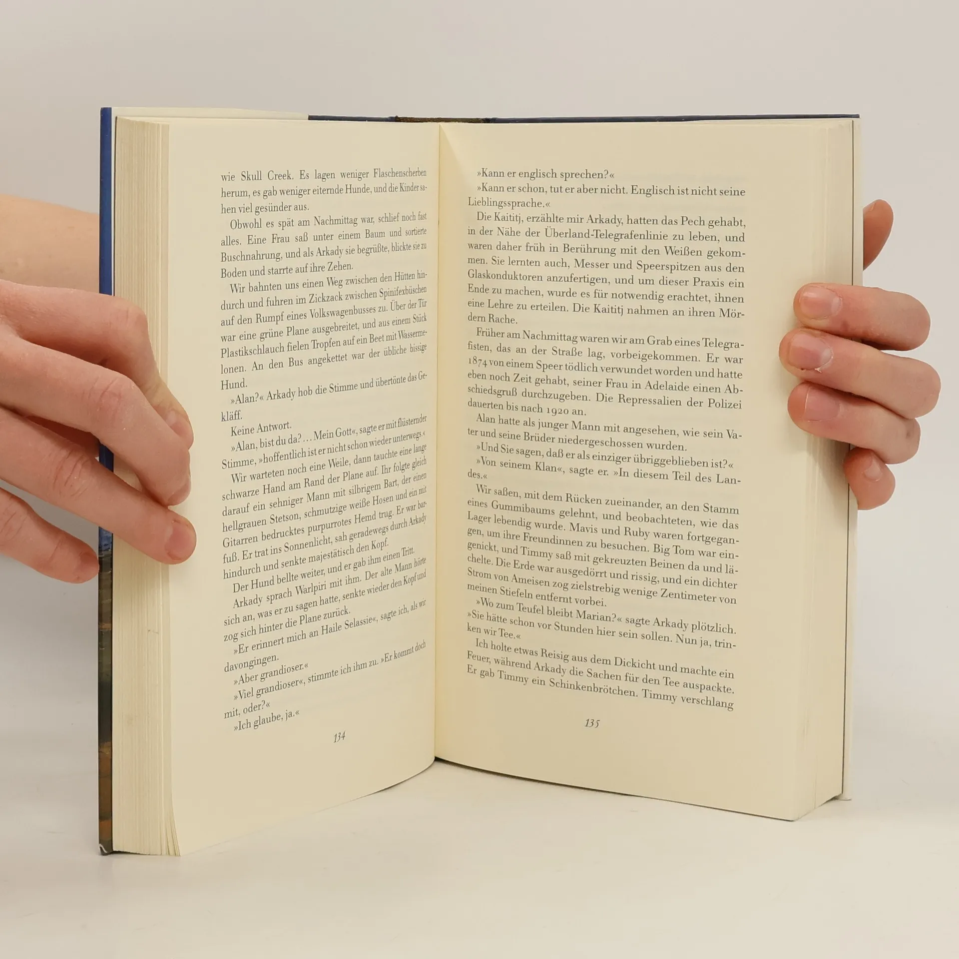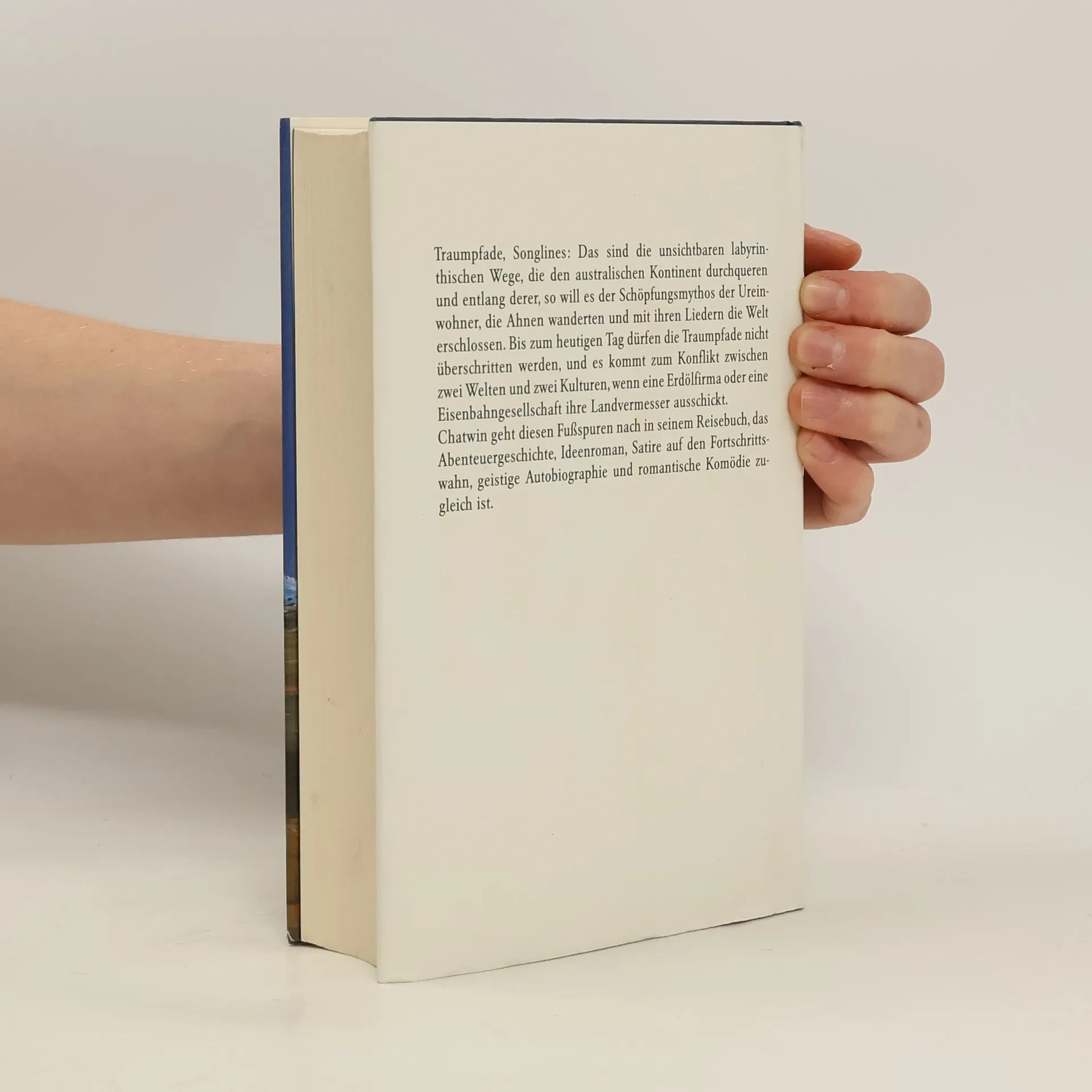 Traumpfade, Songlines: das sind die unsichtbaren labyrinthischen Wege, die den australischen Kontinent durchqueren und entlang denen die Ahnen der Ureinwohner wanderten, die mit ihren Liedern die Welt erschlossen. Bis heute dürfen die Traumpfade nicht überschritten werden, und es kommt zum Konflikt zwischen zwei Welten, wenn eine Eisenbahngesellschaft ihre Landvermesser ausschickt. In seinem Reisebuch, das Ideenroman, Abenteuergeschichte, Satire auf den Fortschrittswahn und geistige Autobiographie zugleich ist, schildert Bruce Chatwin eine Reise durch Australien. Der Roman ist durchzogen von grandiosen Landschaftsbeschreibungen, leuchtenden Details und Reflexionen, die alle in ein Hohelied auf den Menschen münden.