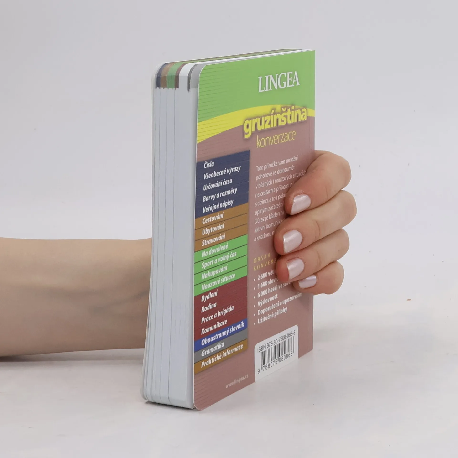 Pokud plánujete cestu do Gruzie, neměli byste zapomenout na vhodnou konverzaci, neboť gruzínské písmo je pro nás exotické. Gruzínci se projevují ve vztahu k návštěvníkům velmi srdečně, přátelsky a nesmírně pohostinně. Hlavními památkami jsou středověké kláštery a kostely, vyhlášené je také gruzínské víno. 2 600 vět a frází, 1 600 slovíček v tématech 6 000 hesel ve slovníku (pouze v knize) Doporučení a upozornění Přepis výslovnosti všech frází 19 stran gramatiky 9 stran praktických informací o zemi