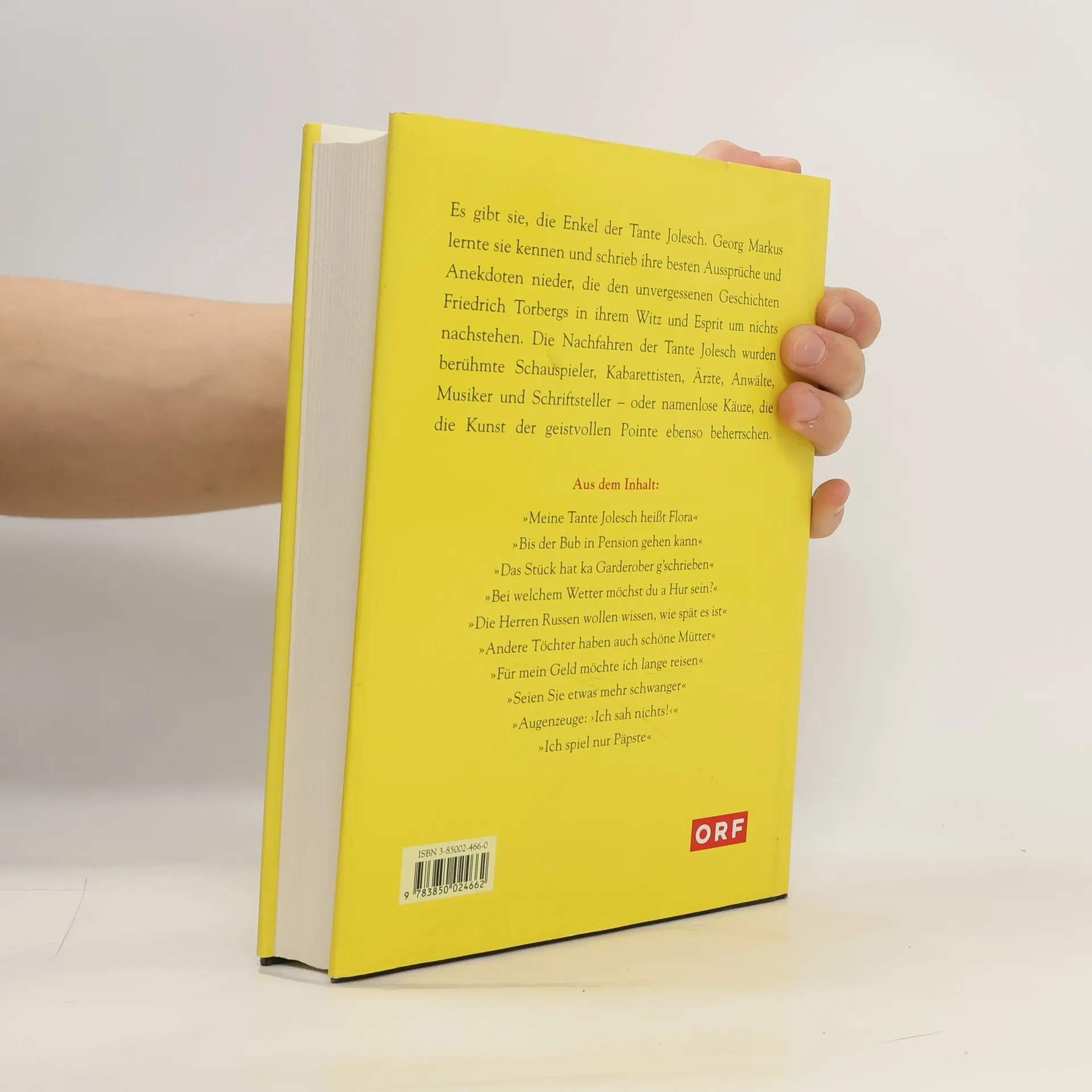 Es gibt sie, die Enkel der Tante Jolesch. Georg Markus lernte sie kennen und schrieb ihre besten Aussprüche und Anekdoten nieder, die den unvergessenen Geschichten Friedrich Torbergs in ihrem Witz und Esprit um nichts nachstehen. Die Nachfahren der Tante Jolesch wurden berühmte Schauspieler, Kabarettisten, Ärzte, Anwälte, Musiker und Schriftsteller - oder namenlose Käuze, die die Kunst der geistvollen Pointe ebenso beherrschen.Friedrich Torberg hat mit der "Tante Jolesch" auf einzigartige Weise den "Untergang des Abendlandes in Anekdoten" geschildert. Georg Markus lernte die Enkel kennen, die der Tante Jolesch und ihren Zeitgenossen an Witz und Esprit um nichts Die Enkel der Tante Jolesch sind Originale, die Krieg und Emigration überlebt hatten und berühmte Schauspieler, Kabarettisten, Musiker, Anwälte und Schriftsteller wurden. Aber auch unbekannte Typen, die man in der "Eden" oder in Wiener Cafés treffen konnte. Anhand geistvoller Anekdoten und Ausprüche dieser Generation zeichnet Georg Markus die Atmosphäre und den Humor der Nachkriegszeit bis zum Ende des 20. Jahrhunderts nach.