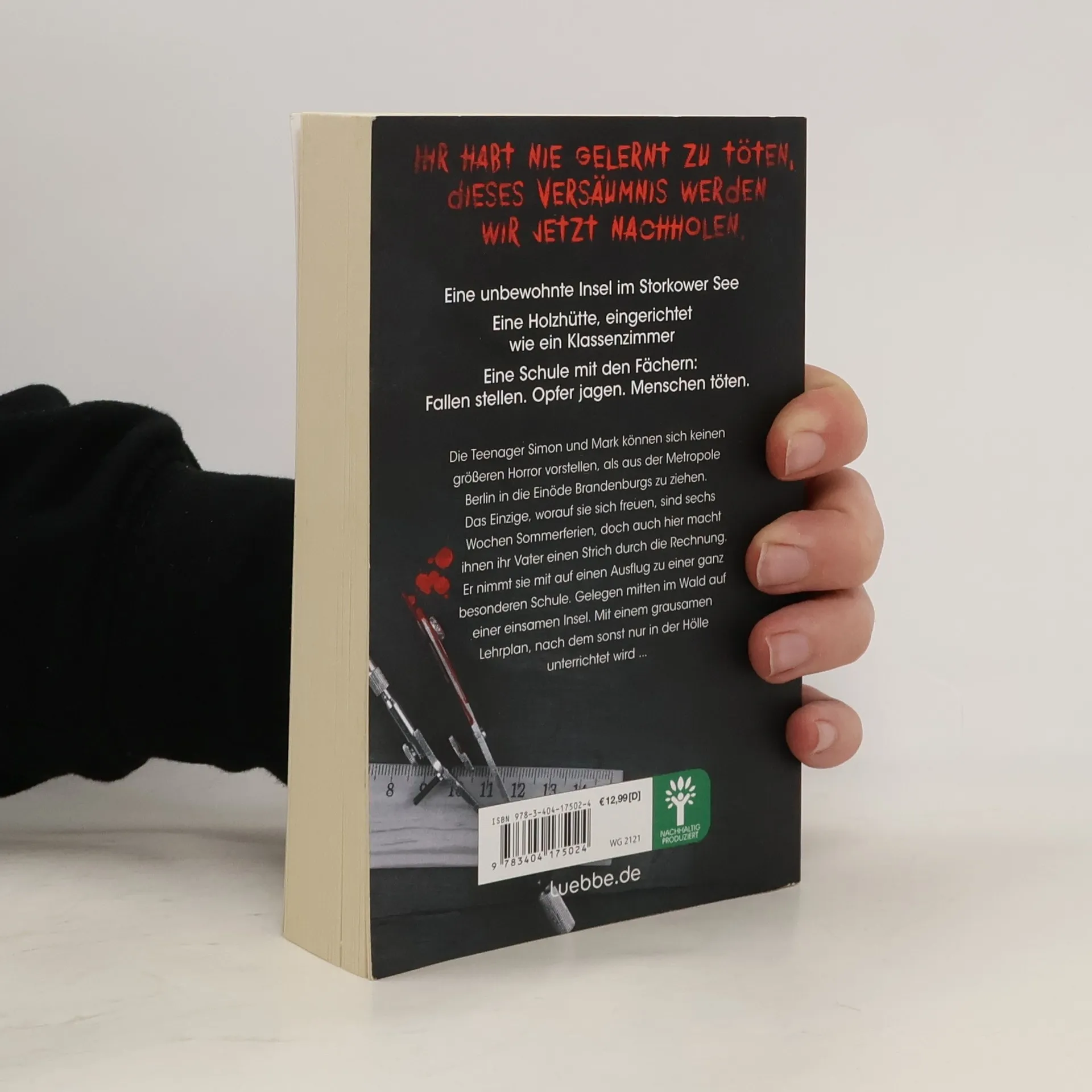 Eine unbewohnte Insel im Storkower See Eine Holzhütte, eingerichtet wie ein Klassenzimmer Eine Schule mit den Fächern: Fallen stellen. Opfer jagen. Menschen töten. Die Teenager Simon und Mark können sich keinen größeren Horror vorstellen, als aus der Metropole Berlin in die Einöde Brandenburgs zu ziehen. Das Einzige, worauf sie sich freuen, sind sechs Wochen Sommerferien, doch auch hier macht ihnen ihr Vater einen Strich durch die Rechnung. Er nimmt sie mit auf einen Ausflug zu einer ganz besonderen Schule. Gelegen mitten im Wald auf einer einsamen Insel. Mit einem grausamen Lehrplan, nach dem sonst nur in der Hölle unterrichtet wird ...