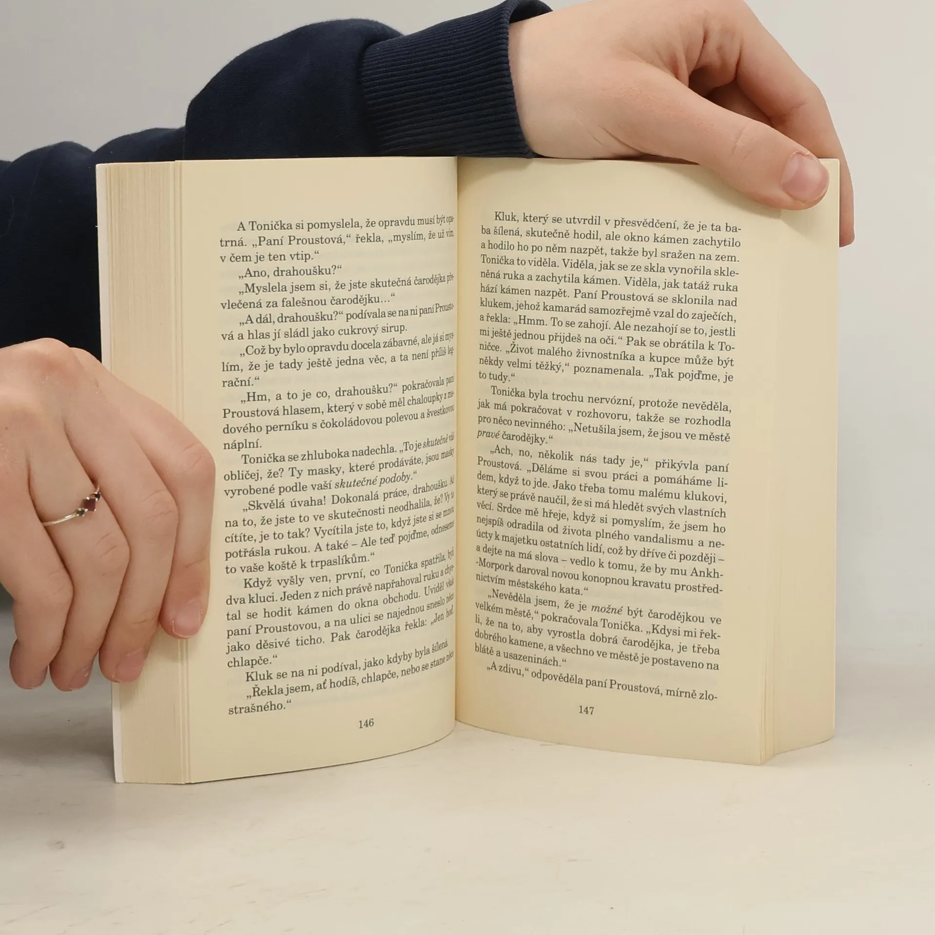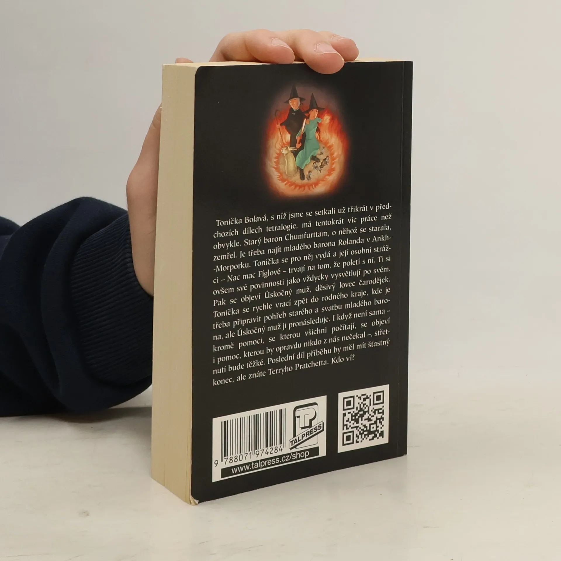 Tonička Bolavá, s níž jsme se setkali už třikrát v předchozích dílech tetralogie, má tentokrát víc práce než obvykle. Starý baron Chumfurttam, o něhož se starala, zemřel. Je třeba najít mladého barona Rolanda v Ankh-Morporku. Tonička se pro něj vydá a její osobní strážci – Nac mac Fíglové – trvají na tom, že poletí s ní. Ti si ovšem své povinnosti jako vždycky vysvětlují po svém. Pak se objeví Úskočný muž, děsivý lovec čarodějek. Tonička se rychle vrací zpět do rodného kraje, kde je třeba připravit pohřeb starého a svatbu mladého barona, ale Úskočný muž ji pronásleduje. I když není sama – kromě pomoci, se kterou všichni počítají, se objeví i pomoc, kterou by opravdu nikdo z nás nečekal –, střetnutí bude těžké. Poslední díl příběhu by měl mít šťastný konec, ale znáte Terryho Pratchetta. Kdo ví?