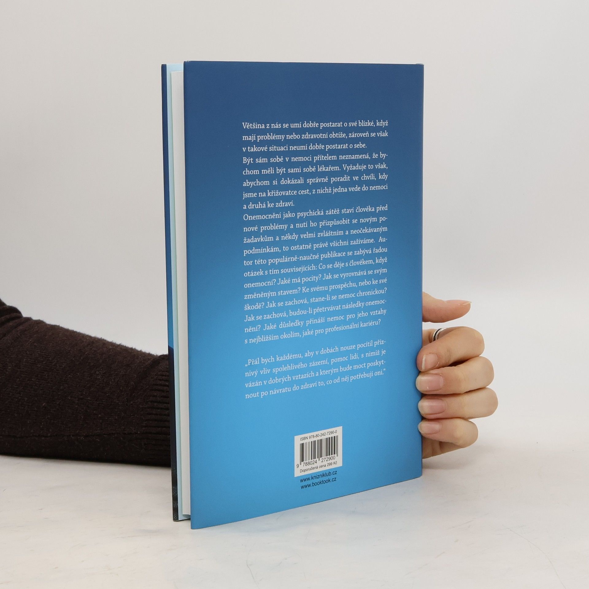 Většina z nás se umí dobře postarat o své blízké, když mají problémy nebo zdravotní obtíže, zároveň se však v takové situaci neumí dobře postarat o sebe. Být sám sobě v nemoci přítelem neznamená, že bychom měli být sami sobě lékařem. Vyžaduje to však, abychom si dokázali správně poradit ve chvíli, kdy jsme na křižovatce cest, z nichž jedna vede do nemoci a druhá ke zdraví. Onemocnění jako psychická zátěž staví člověka před nové problémy a nutí ho přizpůsobit se novým požadavkům a někdy velmi zvláštním a neočekávaným podmínkám, to ostatně právě všichni zažíváme. Autor této populárně naučné publikace se zabývá řadou otázek s tím souvisejících: Co se děje s člověkem, když onemocní? Jaké má pocity? Jak se vyrovnává se svým změněným stavem? Ke svému prospěchu, nebo ke své škodě? Jak se zachová, stane-li se nemoc chronickou? Jak se zachová, budou-li přetrvávat následky onemocnění? Jaké důsledky přináší nemoc pro jeho vztahy s nejbližším okolím, jaké pro profesionální kariéru? „Přál bych každému, aby v dobách nouze pocítil příznivý vliv spolehlivého zázemí, pomoc lidí, s nimiž je vázán v dobrých vztazích a kterým bude moct poskytnout po návratu do zdraví to, co od něj potřebují oni.“
