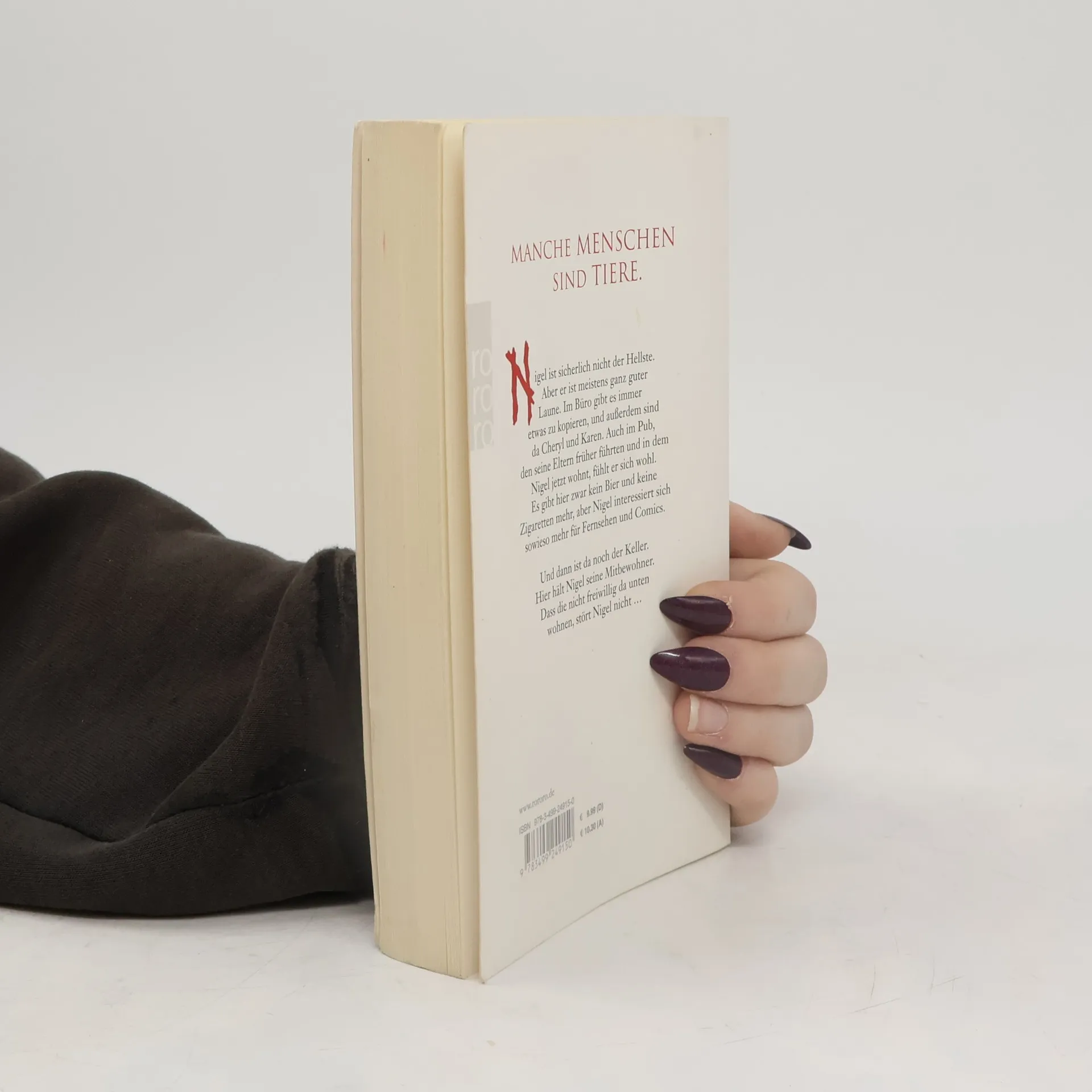 Manche Menschen sind Tiere.Nigel ist sicherlich nicht der Hellste. Aber er ist meistens ganz guter Laune. Im Büro gibt es immer etwas zu kopieren, und außerdem sind da Cheryl und Karen. Auch im Pub, den seine Eltern früher führten und in dem Nigel jetzt wohnt, fühlt er sich wohl. Es gibt hier zwar kein Bier und keine Zigaretten mehr, aber Nigel interessiert sich sowieso mehr für Fernsehen und Comics.Und dann ist da noch der Keller. Hier hält Nigel seine Mitbewohner. Dass die nicht freiwillig da unten wohnen, stört Nigel nicht …