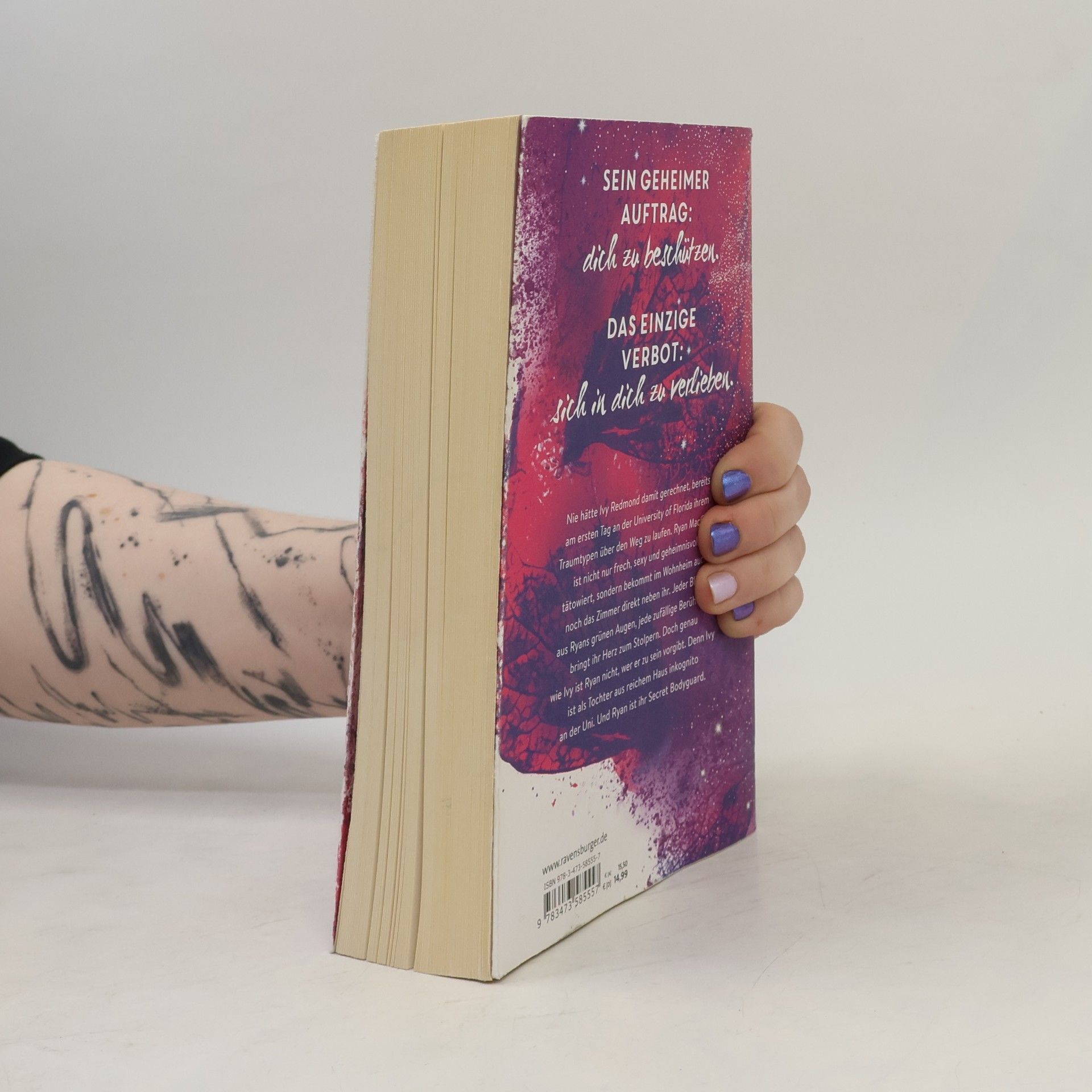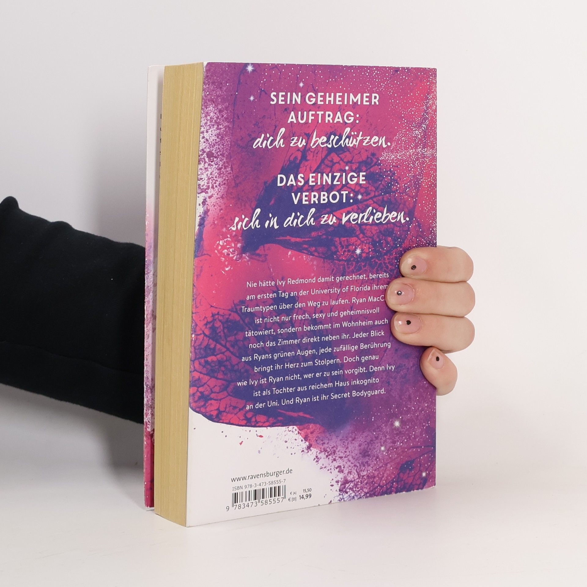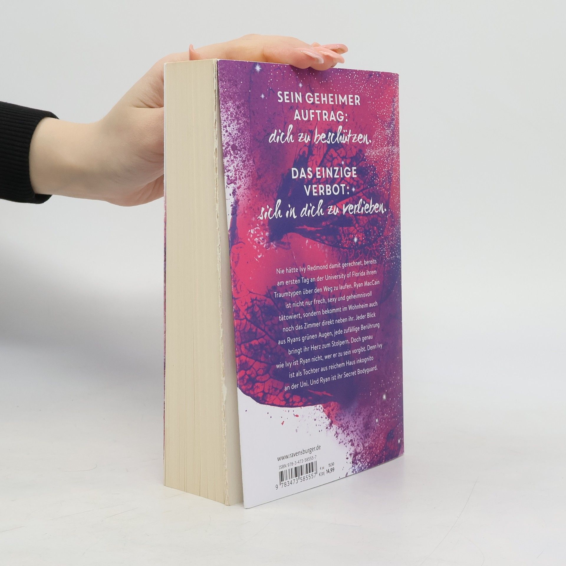 Charmant. Unverschämt sexy. Prickelnd. Bodyguard-Romance at its best. Sein geheimer Auftrag: Dich zu beschützen. Das einzige Verbot: Sich in dich zu verlieben. Ivy Redmond trifft am ersten Tag an der University of Central Florida auf ihren Traumtypen, Ryan MacCain. Er ist nicht nur frech und sexy, sondern auch geheimnisvoll tätowiert und wohnt direkt neben ihr im Wohnheim. Jeder Blick aus seinen grünen Augen und jede zufällige Berührung lässt ihr Herz schneller schlagen. Doch sowohl Ivy als auch Ryan haben Geheimnisse. Ivy ist inkognito an der Uni, da sie aus reichem Haus stammt, und Ryan ist ihr Secret Bodyguard. In einer knisternden Szene wird die Spannung zwischen den beiden deutlich. Ivy spürt Ryans sehnsüchtigen Blick, während sie sich mit der Zunge über die Lippen fährt. Trotz des Verbots, sich zu verlieben, kann Ryan nicht widerstehen. Er gesteht, dass die Wahrscheinlichkeit hoch ist, dass er nicht mehr von ihr lassen kann, wenn er einmal anfängt. Ivy, verführt von der Nähe und der Anziehung, bittet ihn schließlich, sie zu küssen – nur noch einmal. Die Situation wird brenzlig, besonders wenn Ivys Vater auftaucht.