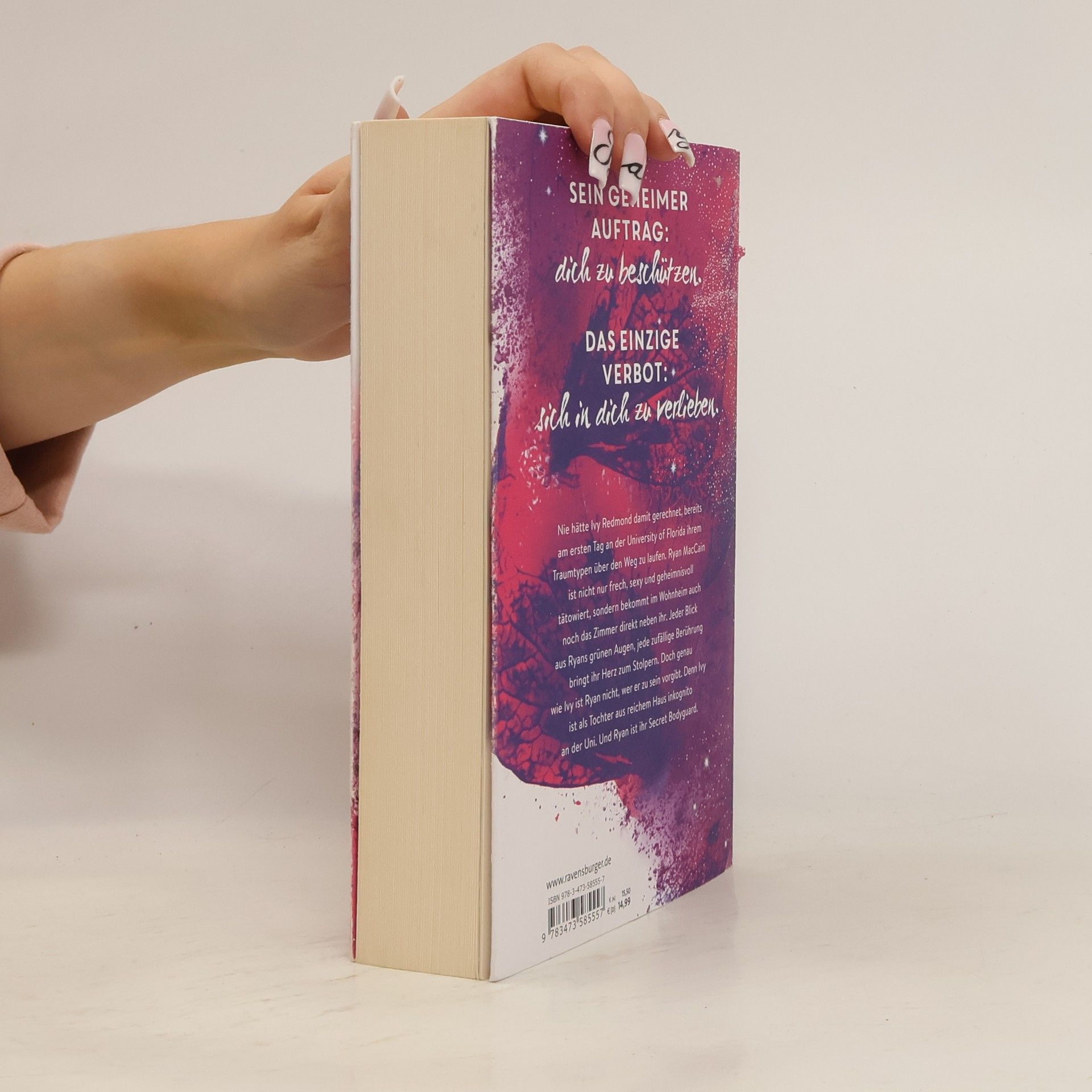 Charmant. Unverschämt sexy. Prickelnd. Bodyguard-Romance at its best. Sein geheimer Auftrag: Dich zu beschützen. Das einzige Verbot: Sich in dich zu verlieben. Ivy Redmond trifft am ersten Tag an der University of Central Florida auf ihren Traumtypen, Ryan MacCain. Er ist nicht nur frech und sexy, sondern auch geheimnisvoll tätowiert und wohnt direkt neben ihr im Wohnheim. Jeder Blick aus seinen grünen Augen und jede zufällige Berührung lässt ihr Herz schneller schlagen. Doch sowohl Ivy als auch Ryan haben Geheimnisse. Ivy ist inkognito an der Uni, da sie aus reichem Haus stammt, und Ryan ist ihr Secret Bodyguard. In einer knisternden Szene wird die Spannung zwischen den beiden deutlich. Ivy spürt Ryans sehnsüchtigen Blick, während sie sich mit der Zunge über die Lippen fährt. Trotz des Verbots, sich zu verlieben, kann Ryan nicht widerstehen. Er gesteht, dass die Wahrscheinlichkeit hoch ist, dass er nicht mehr von ihr lassen kann, wenn er einmal anfängt. Ivy, verführt von der Nähe und der Anziehung, bittet ihn schließlich, sie zu küssen – nur noch einmal. Die Situation wird brenzlig, besonders wenn Ivys Vater auftaucht.