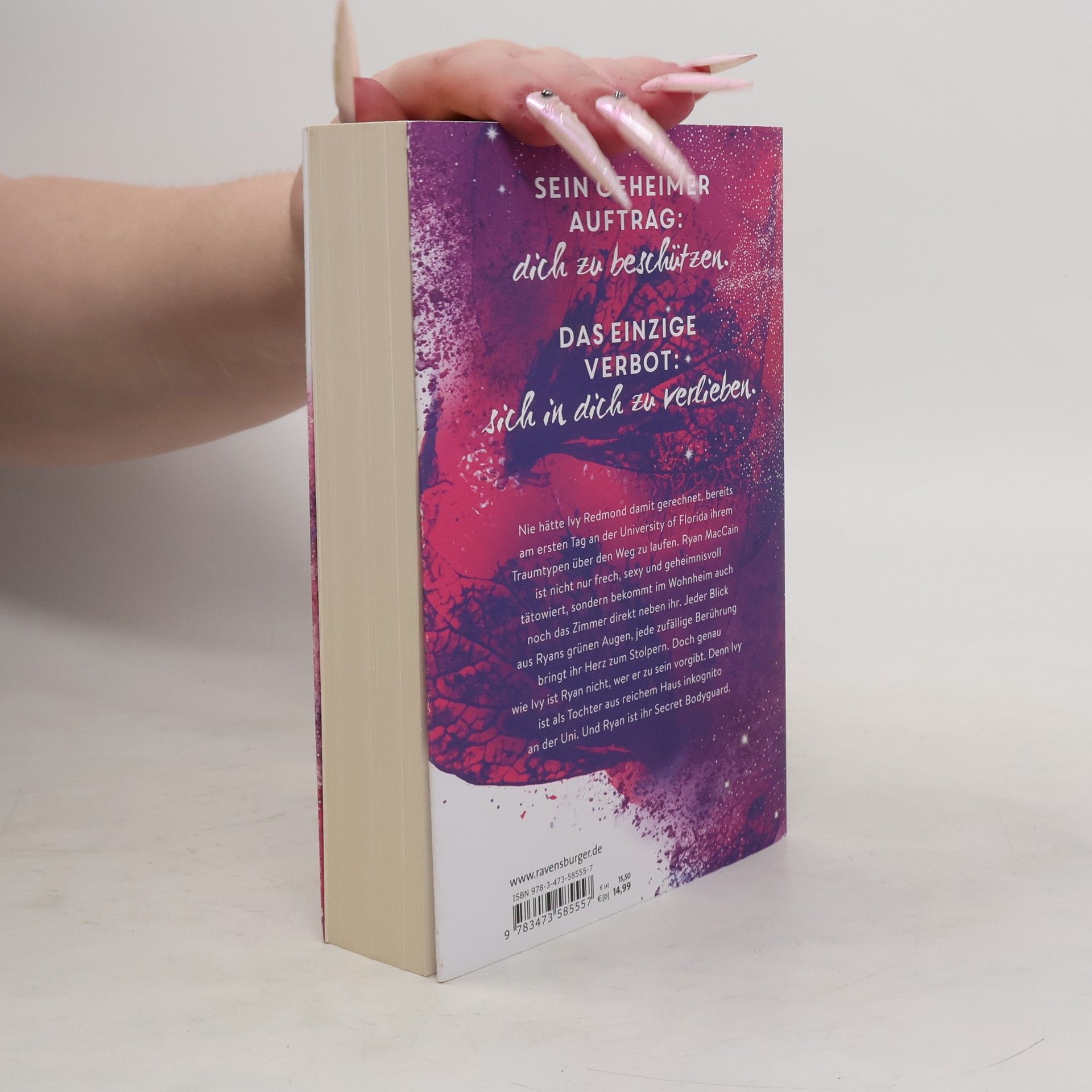 Charmant. Unverschämt sexy. Prickelnd. Bodyguard-Romance at its best. Sein geheimer Auftrag: Dich zu beschützen. Das einzige Verbot: Sich in dich zu verlieben. Ivy Redmond trifft am ersten Tag an der University of Central Florida auf ihren Traumtypen, Ryan MacCain. Er ist nicht nur frech und sexy, sondern auch geheimnisvoll tätowiert und wohnt direkt neben ihr im Wohnheim. Jeder Blick aus seinen grünen Augen und jede zufällige Berührung lässt ihr Herz schneller schlagen. Doch sowohl Ivy als auch Ryan haben Geheimnisse. Ivy ist inkognito an der Uni, da sie aus reichem Haus stammt, und Ryan ist ihr Secret Bodyguard. In einer knisternden Szene wird die Spannung zwischen den beiden deutlich. Ivy spürt Ryans sehnsüchtigen Blick, während sie sich mit der Zunge über die Lippen fährt. Trotz des Verbots, sich zu verlieben, kann Ryan nicht widerstehen. Er gesteht, dass die Wahrscheinlichkeit hoch ist, dass er nicht mehr von ihr lassen kann, wenn er einmal anfängt. Ivy, verführt von der Nähe und der Anziehung, bittet ihn schließlich, sie zu küssen – nur noch einmal. Die Situation wird brenzlig, besonders wenn Ivys Vater auftaucht.