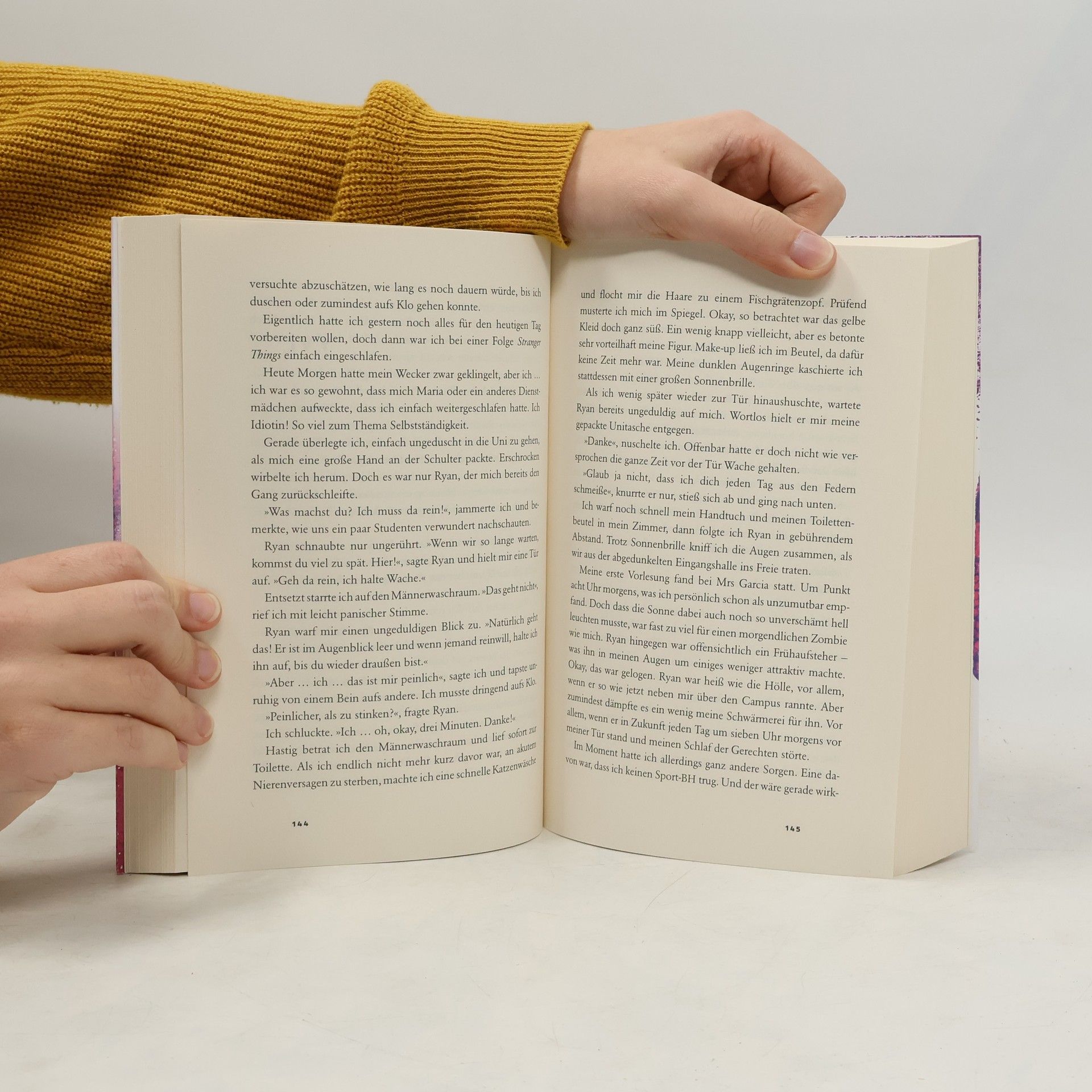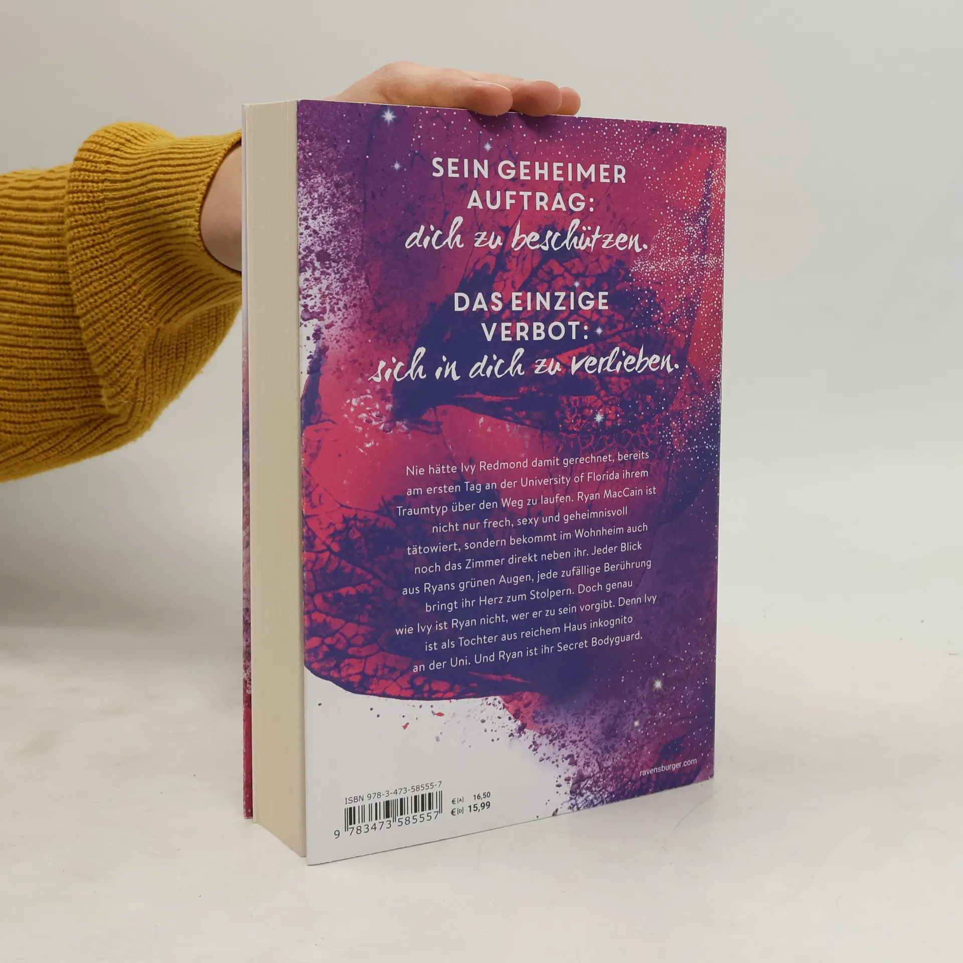 Charmant. Unverschämt sexy. Prickelnd. Bodyguard-Romance at its best. Sein geheimer Auftrag: Dich zu beschützen. Das einzige Verbot: Sich in dich zu verlieben. Ivy Redmond trifft am ersten Tag an der University of Central Florida auf ihren Traumtypen, Ryan MacCain. Er ist nicht nur frech und sexy, sondern auch geheimnisvoll tätowiert und wohnt direkt neben ihr im Wohnheim. Jeder Blick aus seinen grünen Augen und jede zufällige Berührung lässt ihr Herz schneller schlagen. Doch sowohl Ivy als auch Ryan haben Geheimnisse. Ivy ist inkognito an der Uni, da sie aus reichem Haus stammt, und Ryan ist ihr Secret Bodyguard. In einer knisternden Szene wird die Spannung zwischen den beiden deutlich. Ivy spürt Ryans sehnsüchtigen Blick, während sie sich mit der Zunge über die Lippen fährt. Trotz des Verbots, sich zu verlieben, kann Ryan nicht widerstehen. Er gesteht, dass die Wahrscheinlichkeit hoch ist, dass er nicht mehr von ihr lassen kann, wenn er einmal anfängt. Ivy, verführt von der Nähe und der Anziehung, bittet ihn schließlich, sie zu küssen – nur noch einmal. Die Situation wird brenzlig, besonders wenn Ivys Vater auftaucht.