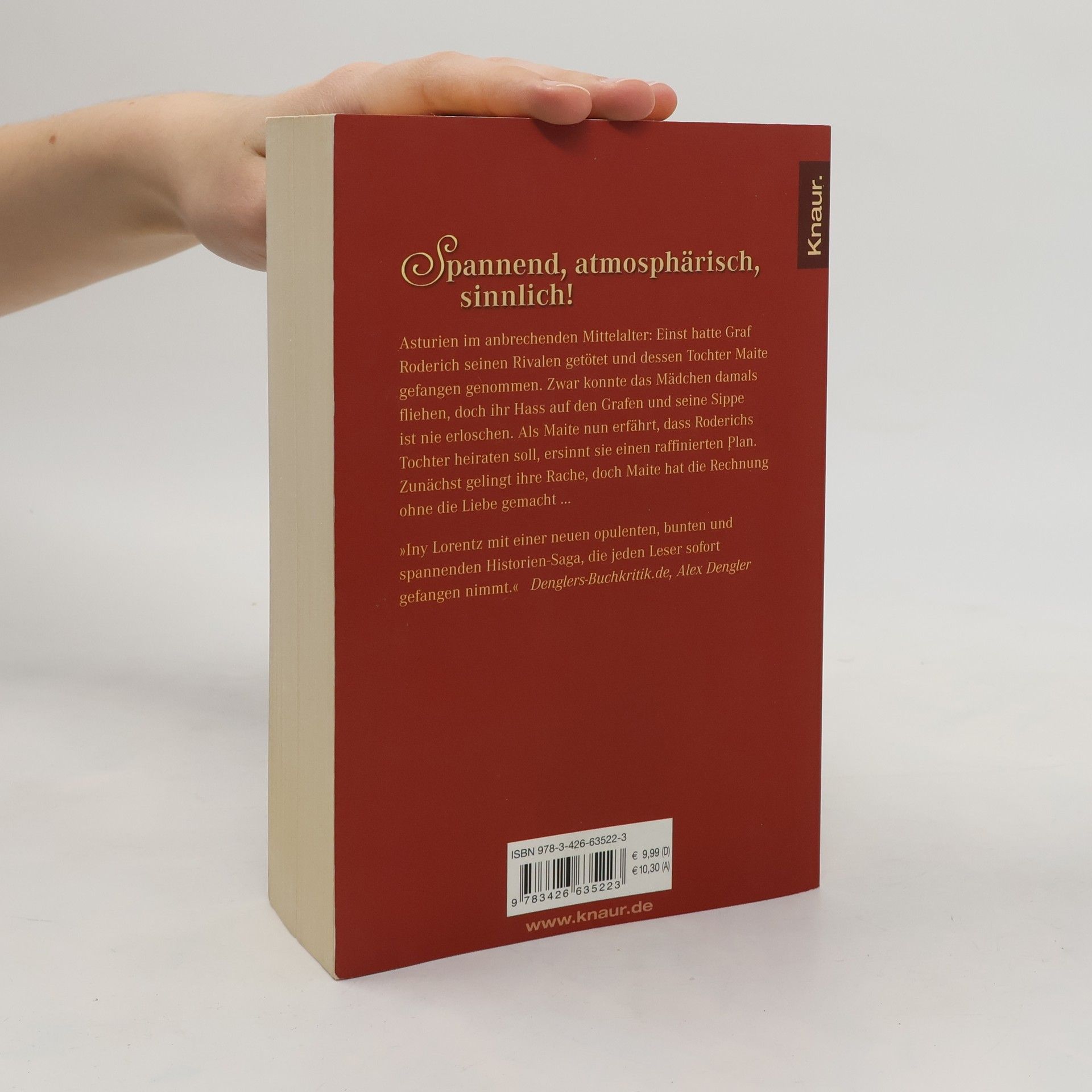 Asturien im frühen Mittelalter: Einst hatte Graf Roderich einen Rivalen getötet und dessen Tochter Maite entführt. Zwar konnte das Mädchen fliehen, doch ihr Hass auf den Grafen und seine Sippe ist nie erloschen. Als Maite nun erfährt, dass die Tochter dieses Grafen heiraten soll, ersinnt sie einen raffinierten Racheplan. Doch Maite hat die Rechnung ohne die Liebe gemacht …»Iny Lorentz mit einer opulenten, bunten und spannenden Historien-Saga, die jeden Leser sofort gefangen nimmt. Das Autorenehepaar Iny Lorentz erzählt ganz besonders, so zügig und gleichzeitig so voller Details und lebendiger Figuren. Das schafft kaum jemand anderes im historischen Roman.« Denglers-Buchkritik. de, Alex Dengler