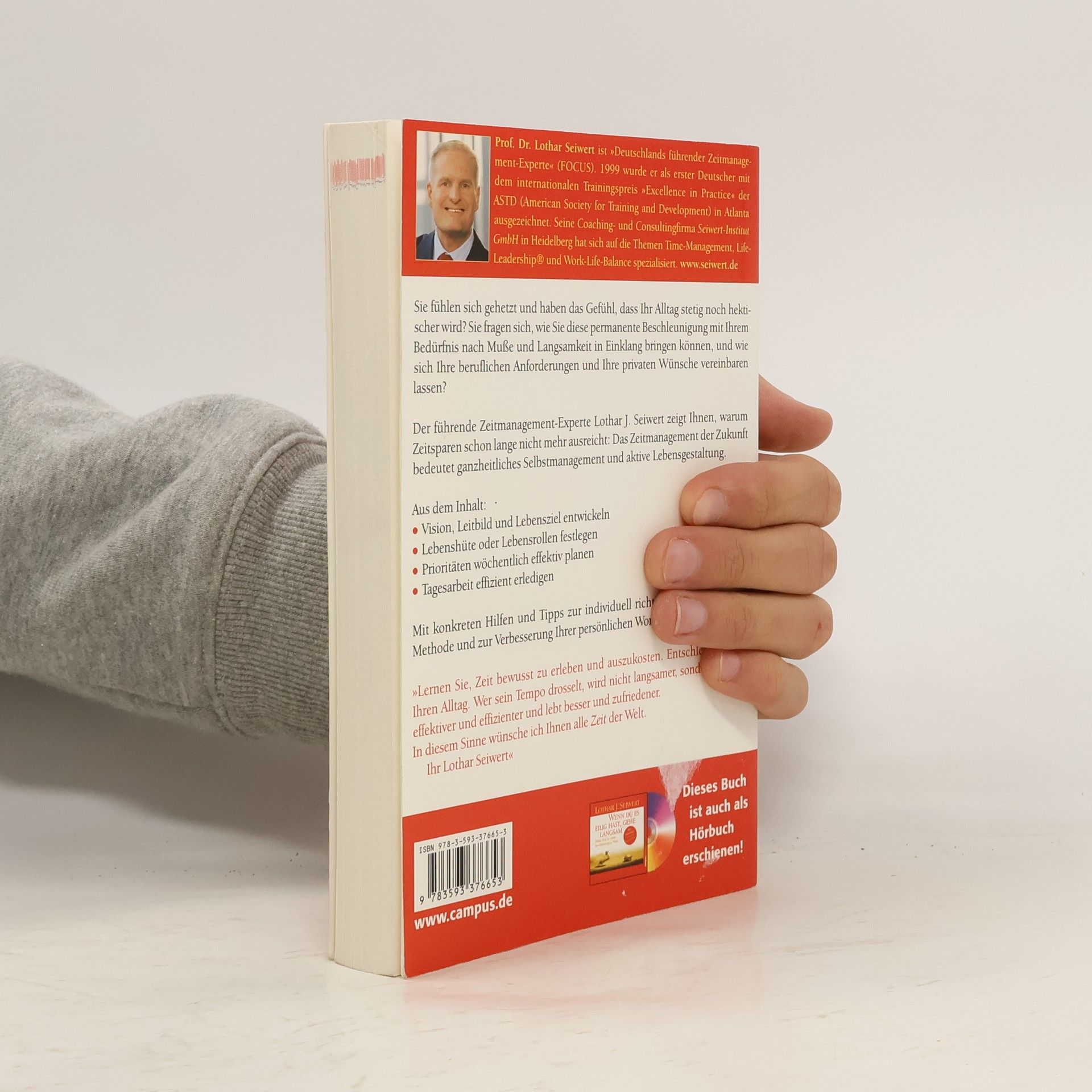Seiwert macht seinen Lesern bewusst, dass unsere Lebenszeit das kostbarste Gut ist, das wir besitzen. In vier Schritten zeigt er, wie wir mit den richtigen Strategien unseren Alltag in den Griff bekommen und zu einer besseren Lebensgestaltung finden: 1. Die Lebensvision entwickeln 2. Die Lebensrollen definieren 3. Eine Prioritätenliste für jede Woche erstellen 4. Tägliche Aufgaben und Routinen im Griff Leben statt gelebt werden, jeden Tag proaktiv gestalten und sich gezielt mehr schöne Momente schaffen – in dem Bewusstsein »Heute ist der erste Tag vom Rest meines Lebens!«