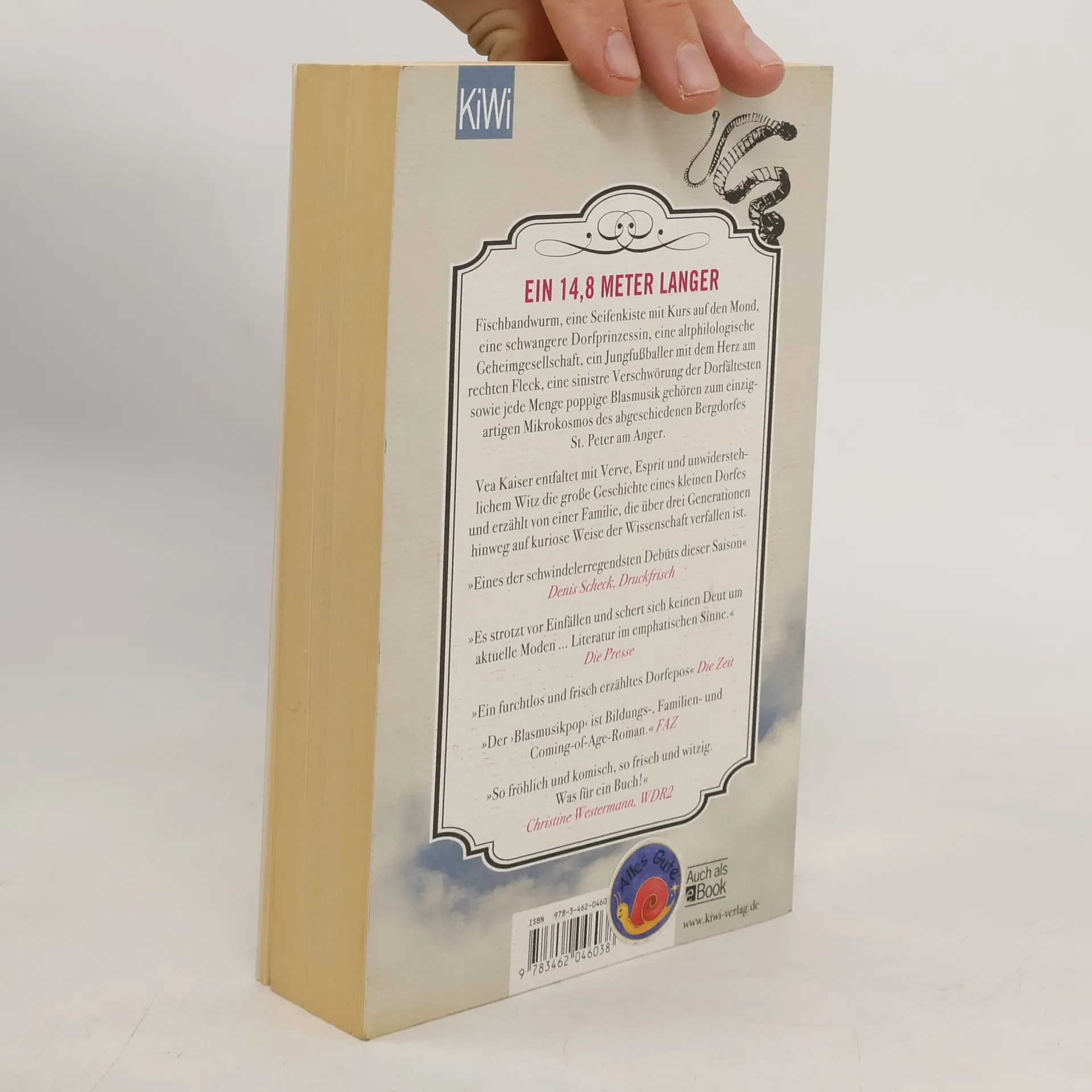 »Ein großer Literaturspaß, ein sehr gelungenes Debüt« Denis Scheck Ein 14,8 Meter langer Fischbandwurm, eine Seifenkiste mit Kurs auf den Mond, ein ungeahnt attraktiver Mönch im Jaguar, ein fallender Engel, eine schwangere Dorfprinzessin, eine altphilologische Geheimgesellschaft, eine nordic-walkende Mütterrunde, ein Jungfußballer mit dem Herz am rechten Fleck, eine sinistre Verschwörung der Dorfältesten sowie jede Menge poppige Blasmusik gehören zum unvergesslichen Mikrokosmos dieses Romans, der durch seine Hingabe an leuchtende Details und skurrile Begebenheiten, durch seinen erzählerischen Furor und seine Vielstimmigkeit besticht. Vea Kaiser entfaltet mit Verve, Esprit und unwiderstehlichem Witz die große Geschichte eines kleinen Dorfes und erzählt von einer Familie, die über drei Generationen hinweg auf kuriose Weise der Wissenschaft verfallen ist. Ein wagemutiges, herausragendes Debüt, das Kritik und Leser gleichermaßen verzaubert hat.