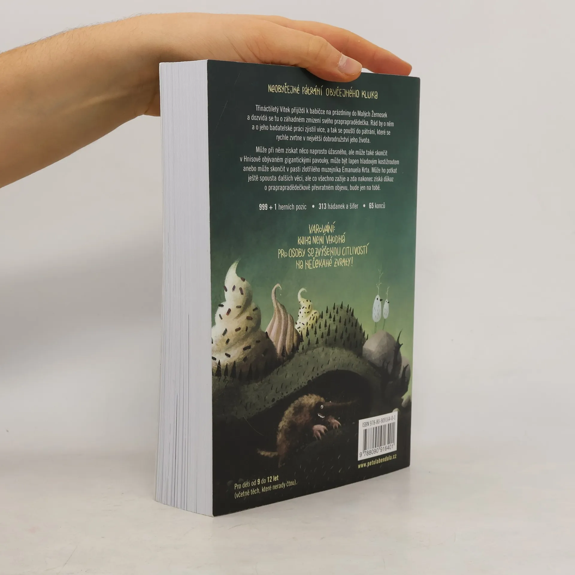 Třináctiletý Vítek přijíždí k babičce na prázdniny do Malých Žernosek a dozvídá se tu o záhadném zmizení svého praprapradědečka. Rád by o něm a o jeho badatelské práci zjistil více, a tak se pouští do pátrání, které se rychle zvrtne v největší dobrodružství jeho života. Může při něm získat něco naprosto úžasného, alemůže také skončit v Hnisově obývaném gigantickými pavouky, může být lapen hladovým kostižroutem anebo může skončit v pasti zlotřilého muzejníka Emanuela Krta. Může ho potkat ještě spousta dalších věcí, ale co všechno zažije a zda nakonec získá důkaz o praprapradědečkově převratném objevu, bude jen na tobě. Varování: Kniha není vhodná pro osoby se zvýšenou citlivostí na nečekané zvraty! Vhodné pro čtenáře a hráče ve věku 9–12(0) let, ale ještě vhodnější pro celou rodinu. Knížku si může užít každý sám, ale díky četným hádankám a šifrám je vhodná i jako společná aktivita pro rodiče s dětmi. I proto jsem se snažila text psát tak, aby bavil i dospělé.