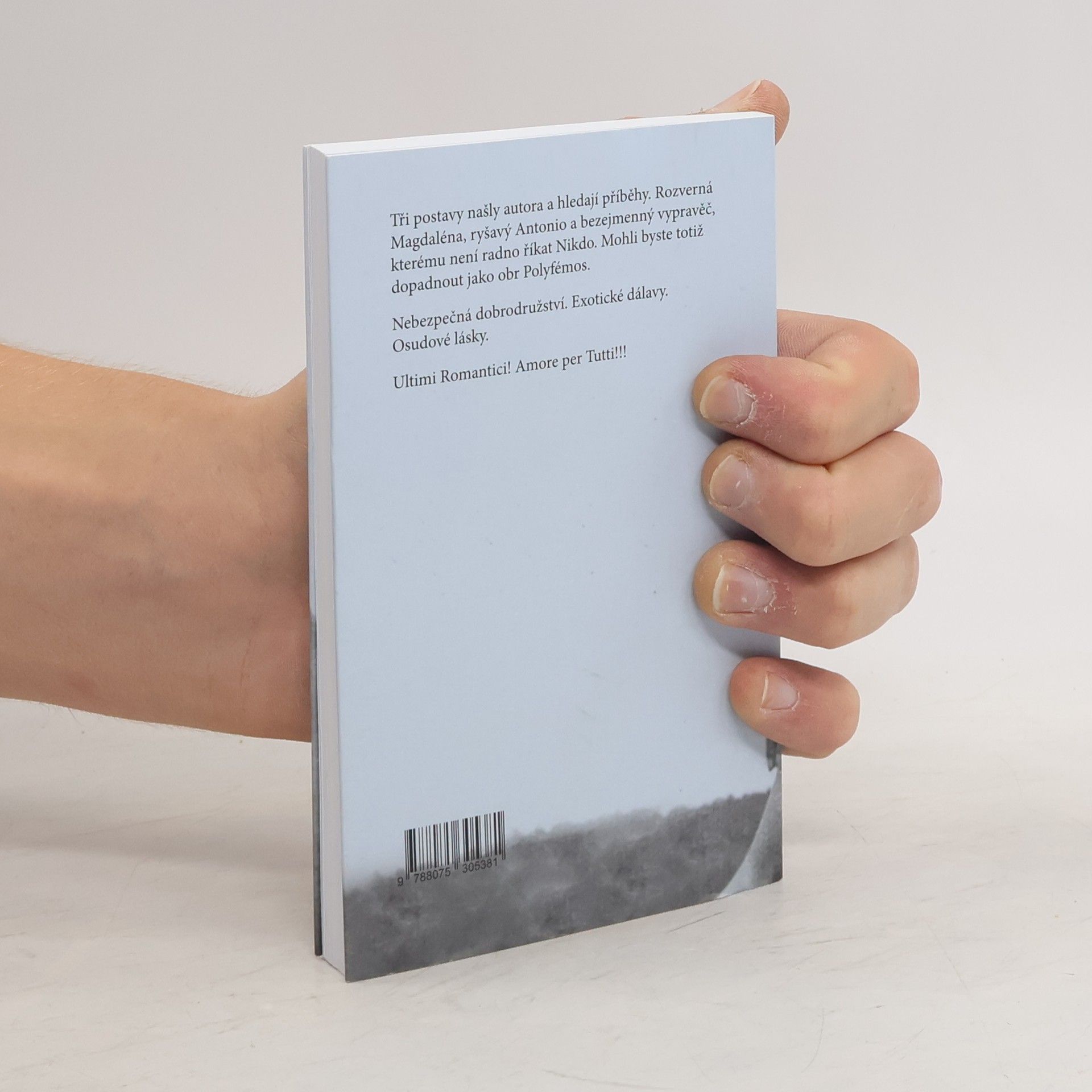 Tři postavy našly autora a hledají příběhy. Rozverná Magdaléna, ryšavý Antonio a bezejmenný vypravěč, kterému není radno říkat Nikdo. Mohli byste totiž dopadnout jako obr Polyfémos. Nebezpečná dobrodružství. Exotické dálavy. Osudové lásky. Ultimi Romantici! Amore per Tutti!!!