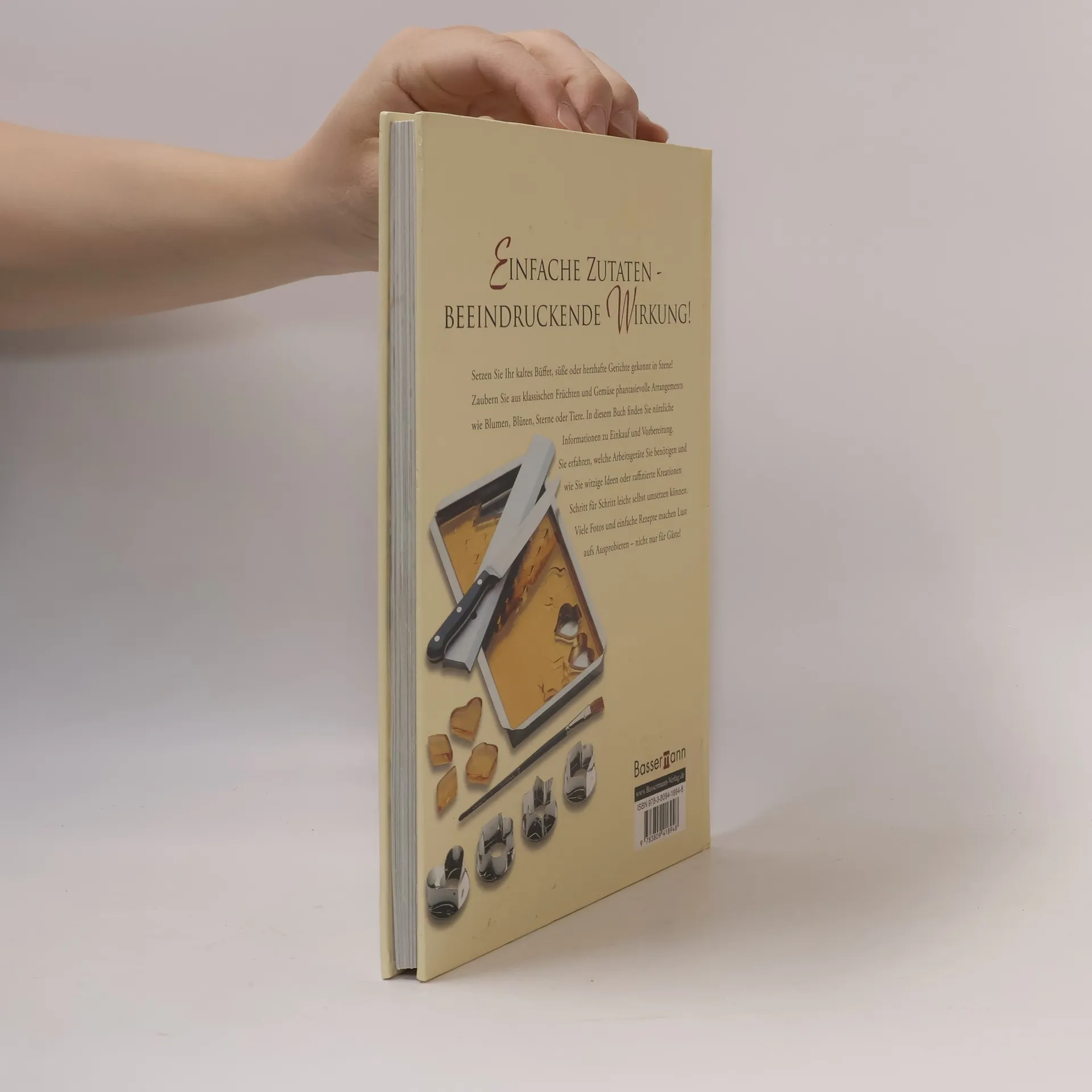 FANTASIEVOLL ANRICHTEN UND DEKORIEREN Die in diesem Buch gezeigten Garnituren und Verzierungen helfen, die Gerichte und Speisen zu verschiedensten Anlässen durch phantasievolle Dekorationen zu verschönern. Und für die schnelle Umsetzung sind die passenden Geräte gleich dabei. • Mit Buntmesser, Kugelausstecher und Kanneliermesser • Drei hochwertige, spülmaschinenfeste Geräte aus rostfreiem Edelstahl • Mehr als 200 Anregungen für das fantasievolle Anrichten und Dekorieren • Alle Früchte und Gemüse werden mit einer Warenkunde vorgestellt