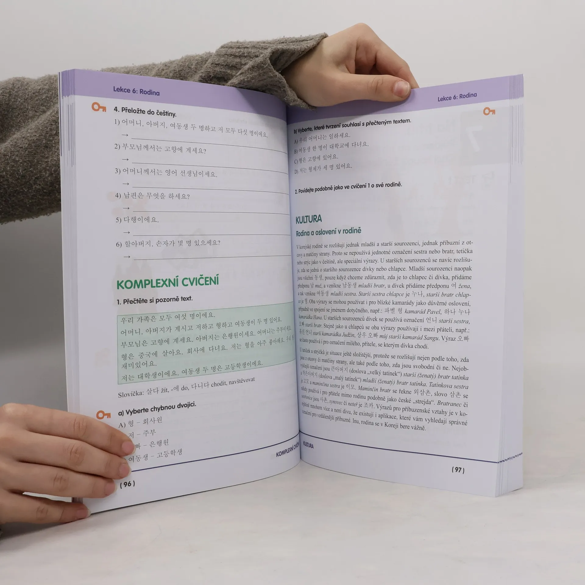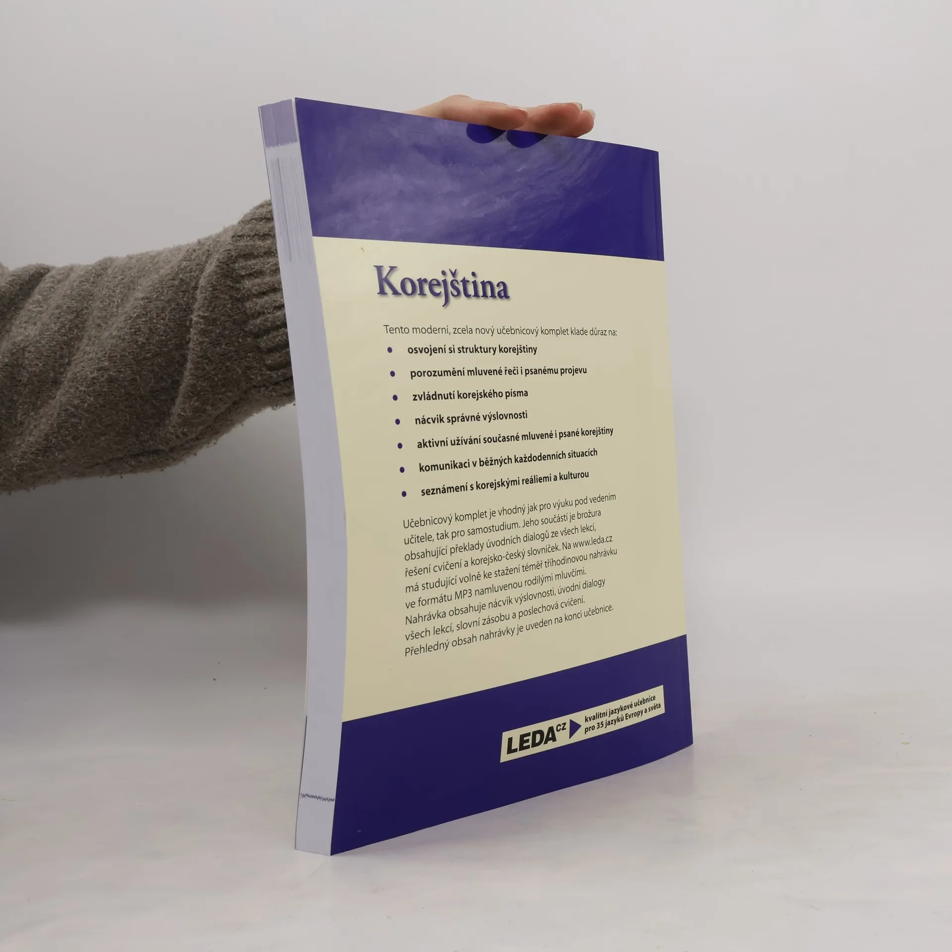 Moderní učebnice zaměřená na porozumění mluvené řeči i psanému projevu, zvládnutí písma, komunikaci v každodenních situacích.Učebnicový komplet je vhodný jak pro výuku pod vedením učitele, tak pro samostudium. Jeho součástí je brožura obsahující překlady úvodních dialogů ze všech lekcí, řešení cvičení a korejsko-český slovníček. Na www.leda.cz má studující volně ke stažení téměř tříhodinovou nahrávku ve formátu MP3 namluvenou rodilými mluvčími.