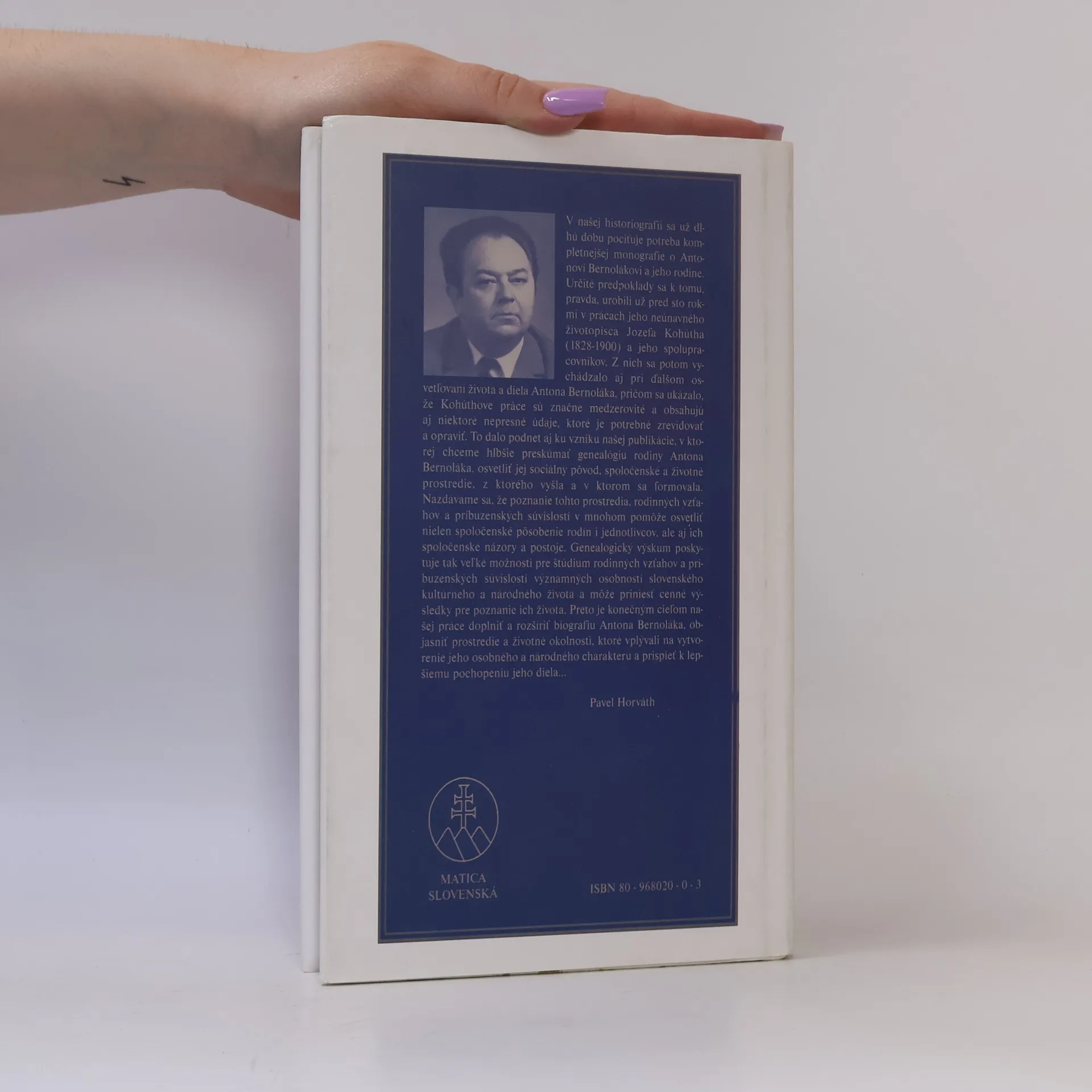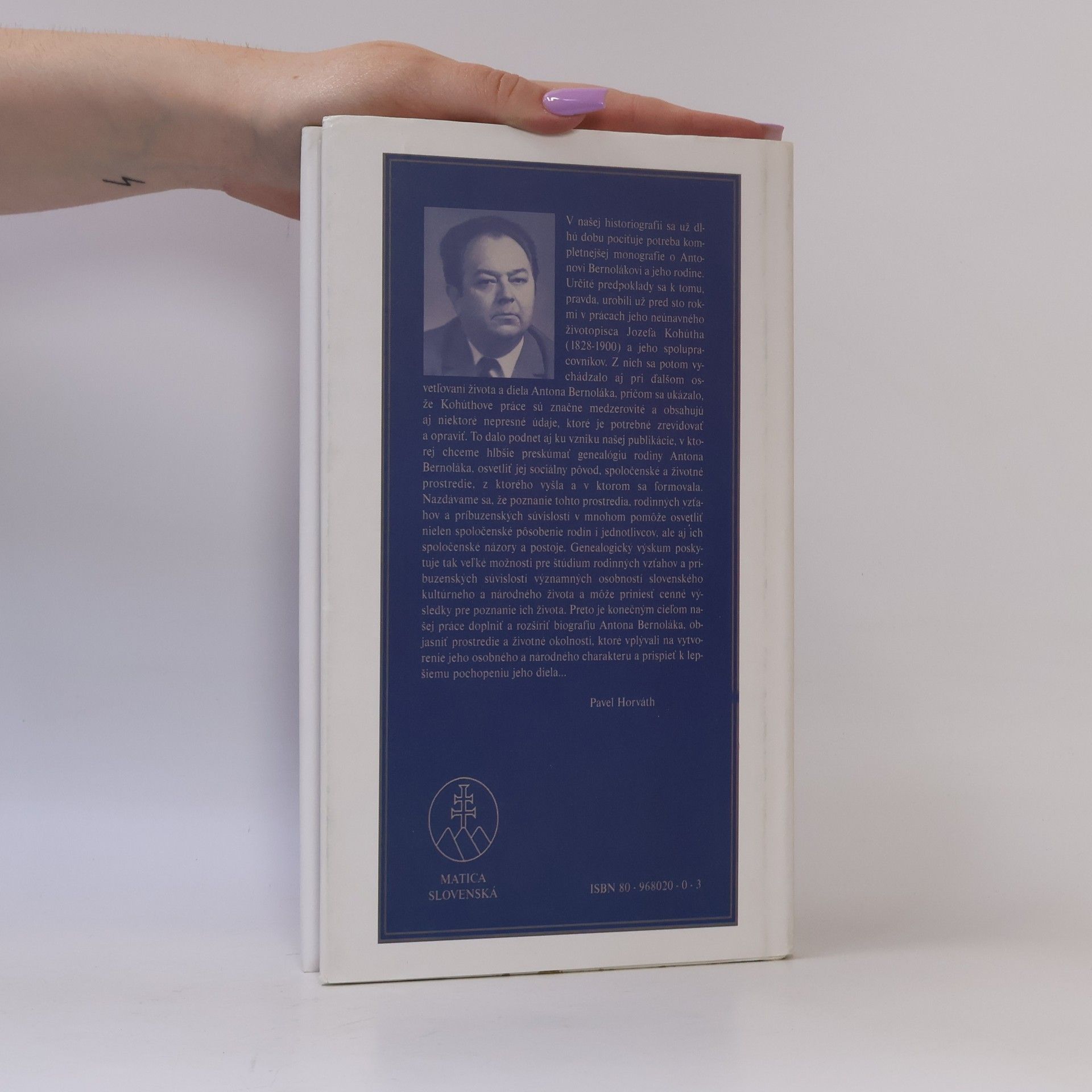 Komplexná monografia o živote a diele Antona Bernoláka - základnej osobnosti slovenského národného vývoja. V knihe sú podrobne zachytené nielen jeho životné osudy a osudy jeho diela, ale aj rodinné prostredie, z ktorého vyšiel, školy, na ktorých sa vzdelával a aj miesta, kde ako kňaz pôsobil v pastorácii alebo v cirkevných funkciách. Okrem toho je venovaná pozornosť aj osobnostnému a národnému profilu Antona Bernoláka, jeho rukopisnej a knižnej pozostalosti, posmrtným osudom jeho diela a nakoniec ucteniu jeho pamiatky vo forme rôznych pamätníkov alebo prejavov v umeleckej literatúre a vo výtvarnom umení.