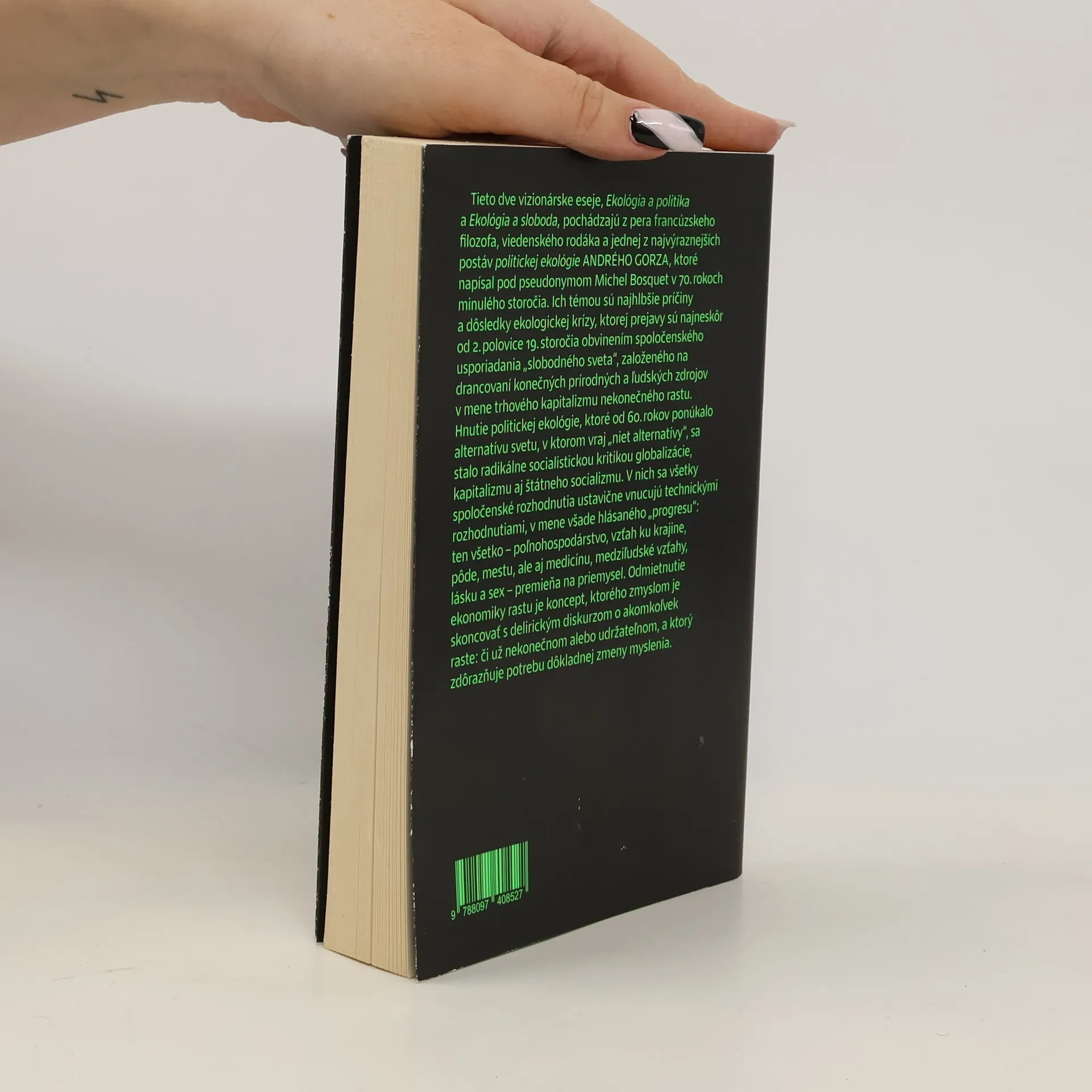 Dve vizionárske eseje obsiahnuté v knihe: Ekológia a politika a Ekológia a sloboda, pochádzajú z pera francúzskeho filozofa, jednej z najvýraznejších postáv politickej ekológie ANDRÉHO GORZA. Napísal ich v 70. rokoch minulého storočia a ich ústrednou témou sú najhlbšie príčiny a dôsledky ekologickej krízy.„Vieme, že náš svet sa skončí; že ak budeme takto pokračovať, život v moriach a riekach zanikne, pôda stratí prirodzenú úrodnosť, vzduch v mestách nás zadusí a život sa stane privilégiom tých, ktorí jediní budú mať právo stať sa vyvolenými exemplármi novej ľudskej rasy, prispôsobenej chemickými procesmi na novú ekologickú niku, ktorú pre ňu synteticky získajú biologickí inžinieri...“(André Gorz)