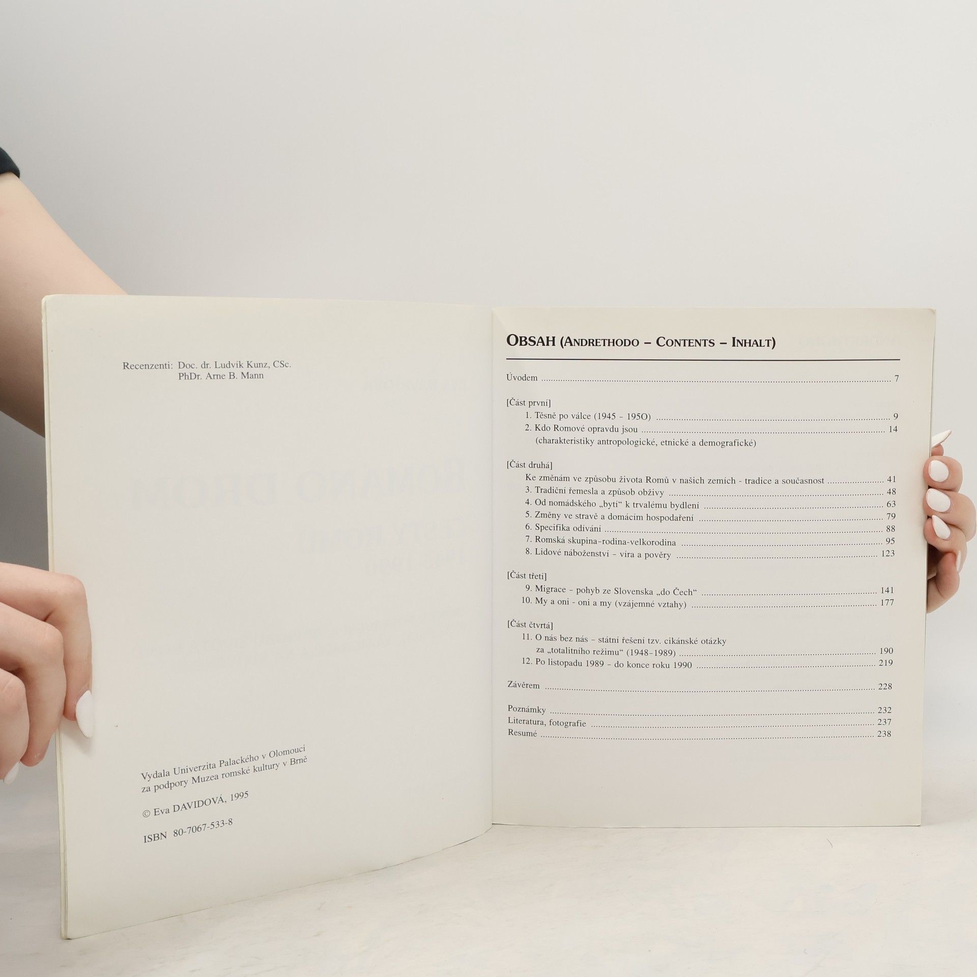 Kniha se zabývá změnami v postavení a způsobu života Romů v Čechách, na Moravě a na Slovensku v letech 1945-1990. Popisuje např. tradiční řemesla a způsob obživy, změny ve stravě a domácím hospodaření, specifika odívání, lidové náboženství, migraci Romů ze Slovenska do České republiky, státní řešení tzv. cikánské otázky za totalitního režimu a situaci Romů od listopadu 1989 do konce roku 1990.
