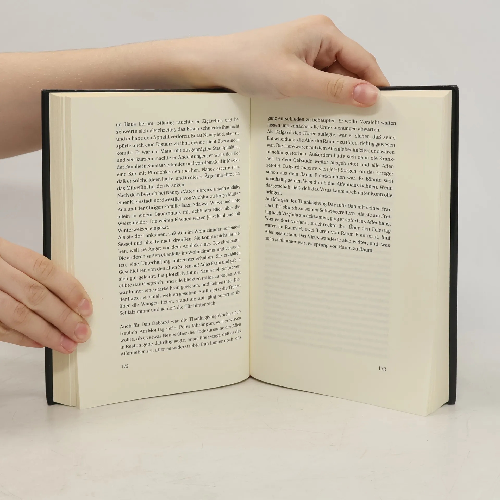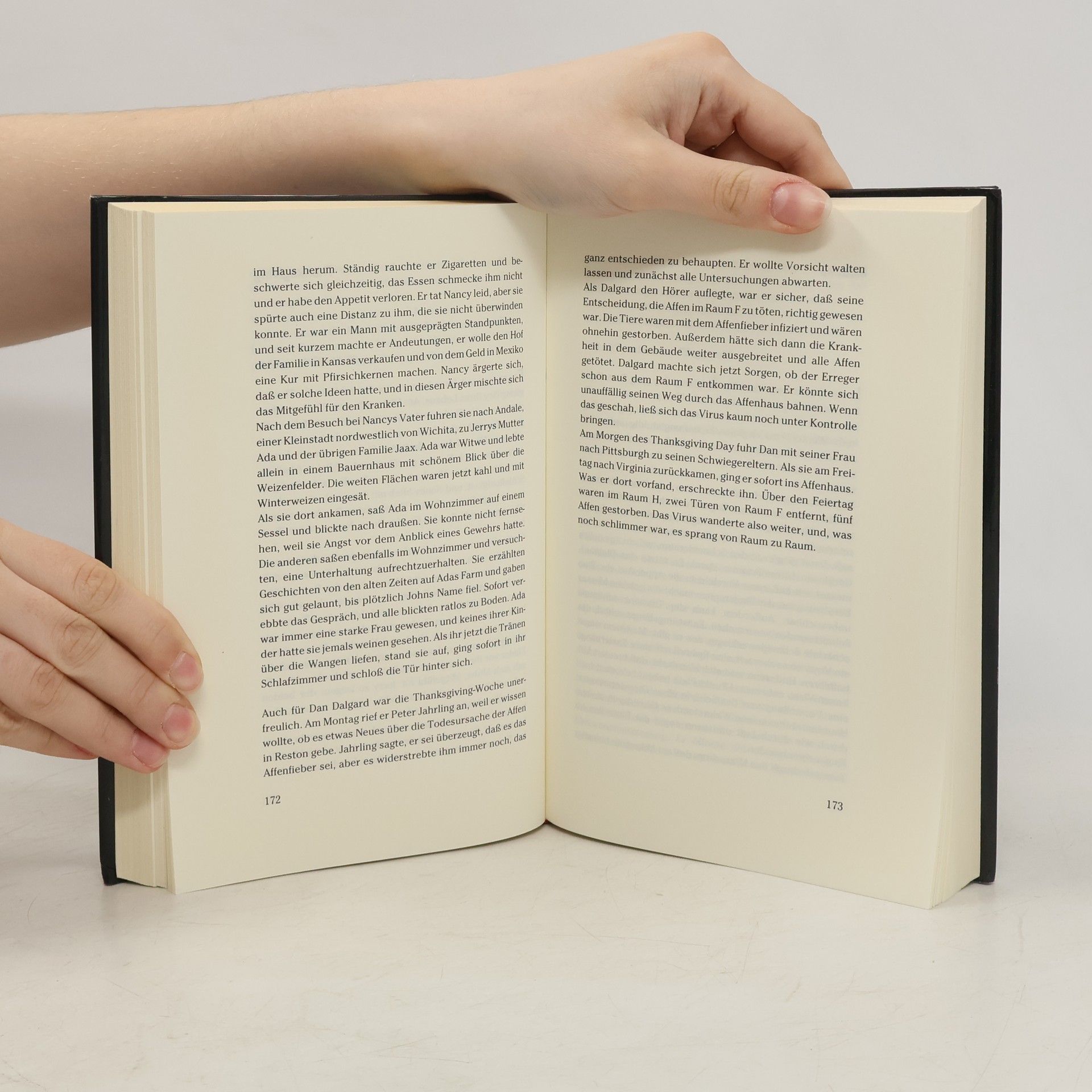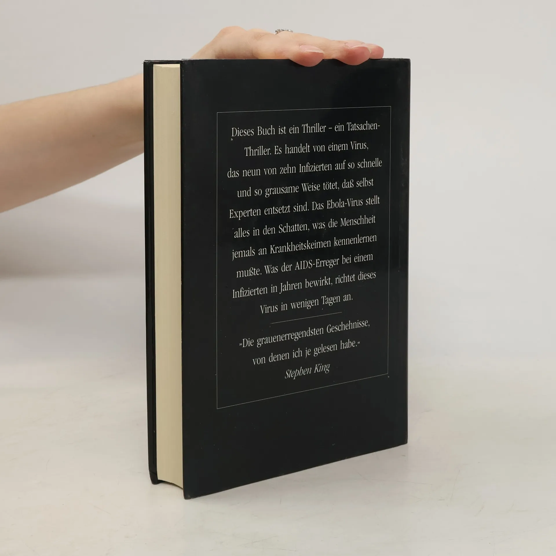 Richard Prestons populärwissenschaftlicher Tatsachen-Thriller liest sich spannender als jeder Horror-Roman. Preston berichtet darin über die ersten Infektionen mit dem Ebola-Virus vor über vierzig Jahren. Sein Tatsachenthriller von 1998 ist immer noch hochaktuell, wie die schreckliche Ebola-Epidemie in Zentralafrika gerade zeigt. Ebola gehört zu den gefährlichsten Killerviren. Diese aus dem Afrikanischen Regenwald stammenden sogenannten „Filoviren“, können einen Menschen auf grausamste Art und Weise töten. Das Virus löst innerhalb weniger Tage die inneren Organe auf, und der Erkrankte verblutet von innen. Das Virus ist zudem extrem ansteckend, und weltweit gibt es immer noch kein wirksames Heilmittel dagegen. Deshalb ist es nicht auszuschließen, dass die Menschheit eines Tages einer Seuche wie Ebola erliegen könnte. Preston schildert, wie der Ebola-Erreger über Affen, die für medizinische Versuche importiert wurden, schließlich nach Amerika kommt. In einem kleinen Labor in Reston, USA, verbreitet er Angst und Schrecken. Als sich die Seuche unter den im Quarantänelager zusammengepferchten Affen ausbreitet, rufen die Betreiber der Anlage die Gesundheitsbehörden zu Hilfe. Bald müssen die Wissenschaftler feststellen, dass sich das Virus inzwischen nicht nur durch Kontakt, sondern auch durch die Luft verbreiten kann.