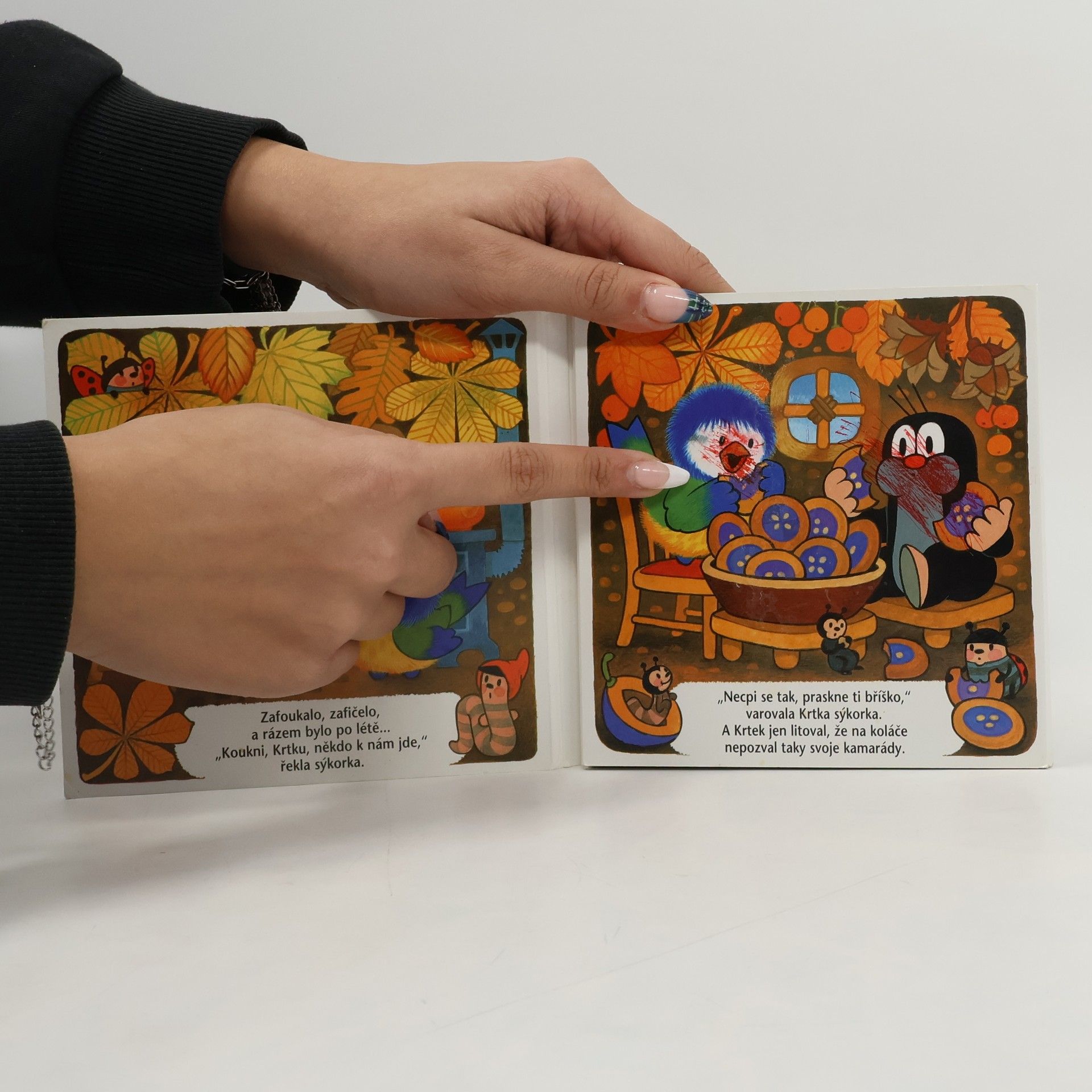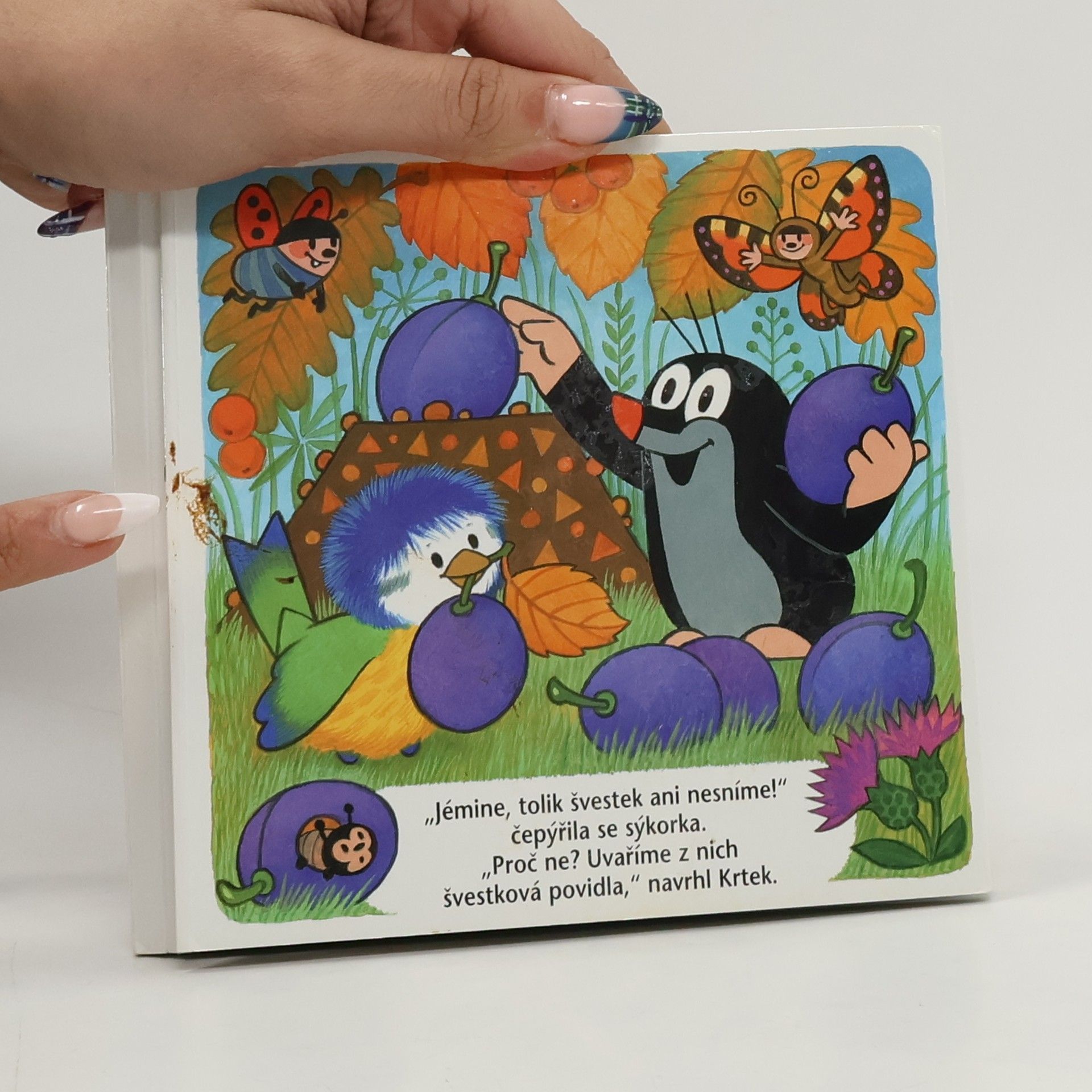 Zafoukalo, zafičelo a byl tu podzim. Na podzim ze stromů nepadá jen listí – když máte domeček pod švestkou, padají vám na domeček i švestky. Když vlétla Krtkovi do krtiny nejdřív jedna, pak druhá a ještě další, začal Krtek přemýšlet, co si s takovou nadílkou počne. Co je nejlepší ze švestek? Přece švestková povidla! A co z povidel? Povidlové koláče! Jak rozhodli, tak udělali. Krtek se sýkorkou navařili povidla, napekli koláče, ale to dá rozum, že je nesnědli sami.