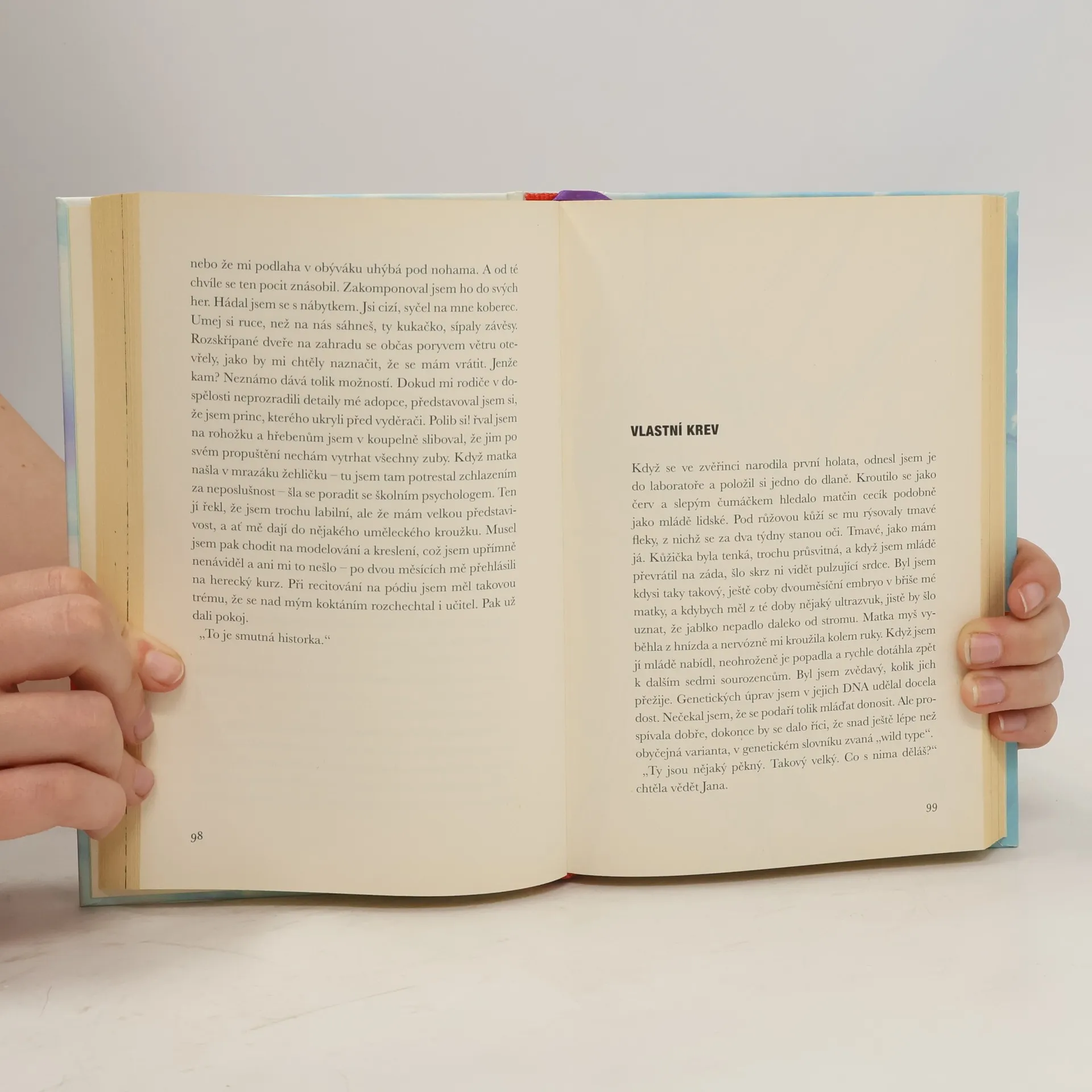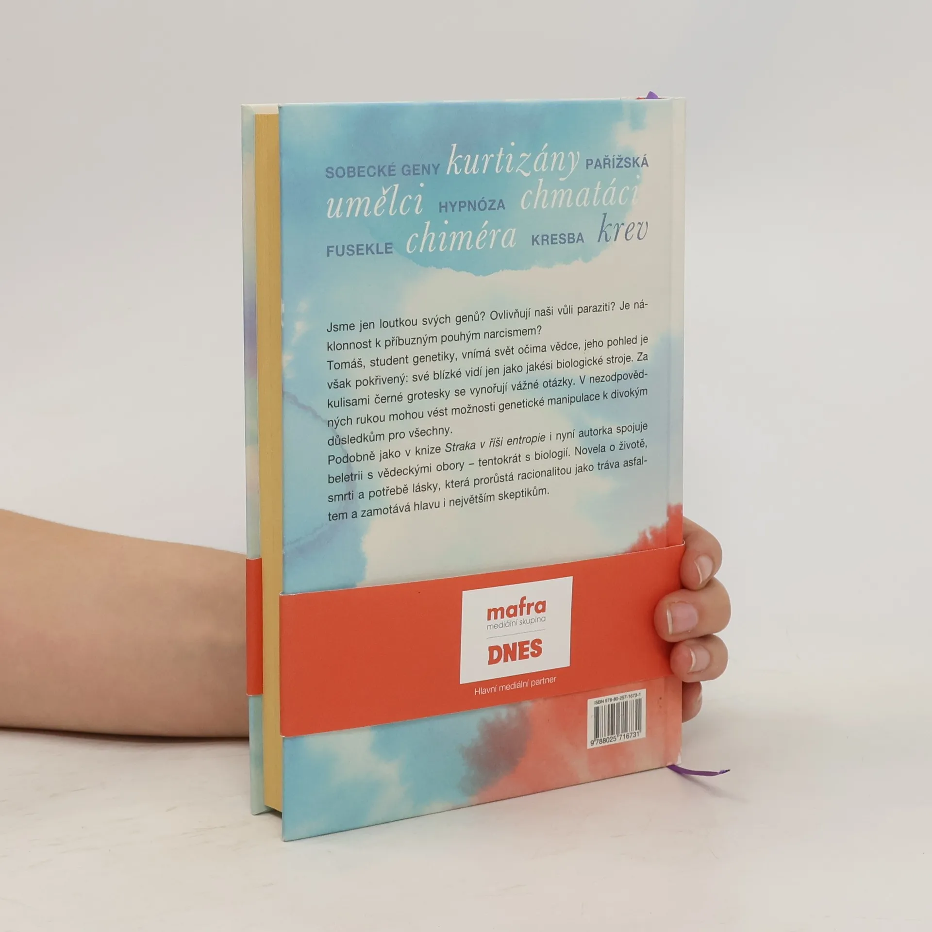 Ve své nové knize autorka opět spojuje beletristický text s vědeckými motivy, které knihu ilustrují a dotvářejí. Tentokrát je jejím tématem biologie. Pod maskou černé komedie se skrývá zkoumání lidské identity, problému, který přinesla dnešní doba nových objevů především v genetice, a s tím související otázky svobodné vůle. Jsme nástrojem vlastních genů? Ovlivňují naše myšlení paraziti? Nebo snad nejvíc vliv společnosti, ve které vyrůstáme? Hlavní hrdina Tomáš je student genetiky vychovaný adoptivními rodiči, pátrající pro vlastních kořenech. Věda formuje jeho pohled na svět, ale tato optika může pokřivovat jeho mezilidské, obzvlášť milostné vztahy.