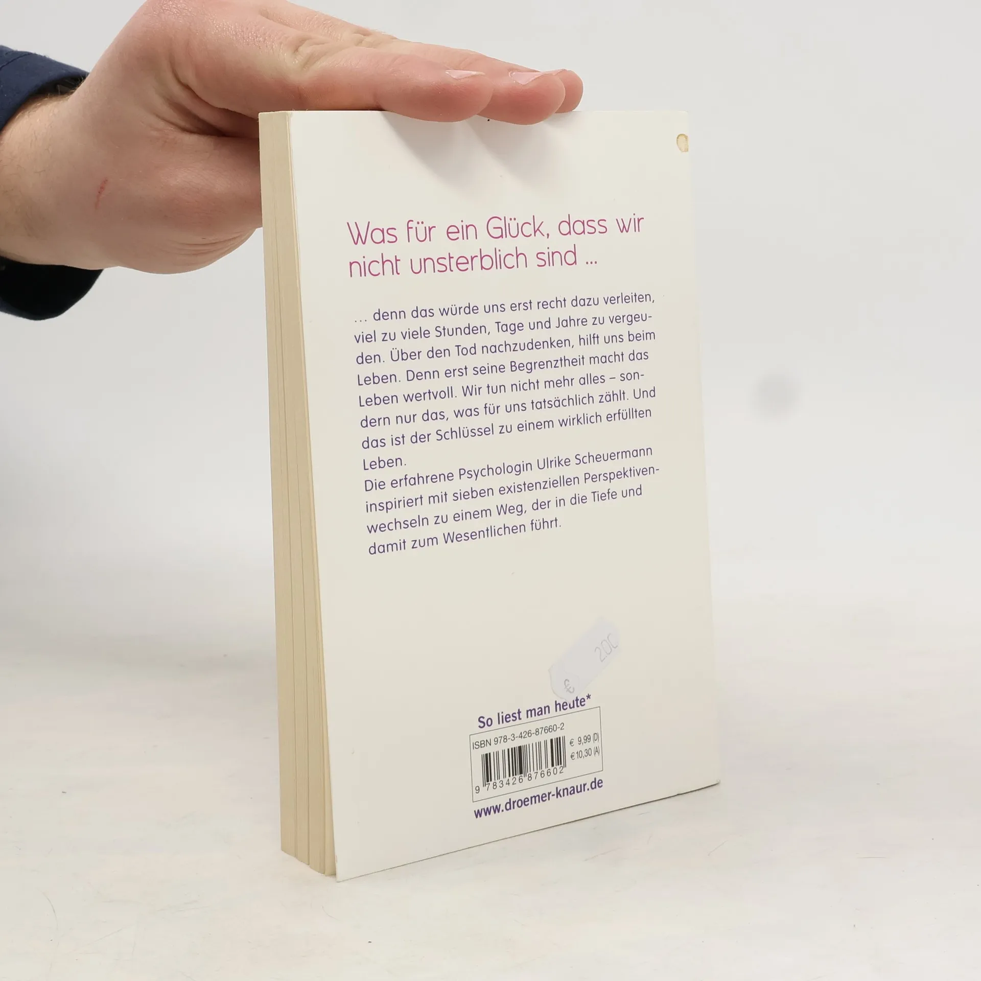 Was für ein Glück, dass wir nicht unsterblich sind ...… denn das würde uns erst recht dazu verleiten, viel zu viele Stunden, Tage, Jahre zu vergeuden. Über den Tod nachzudenken, hilft uns beim Leben. Denn erst die Begrenztheit macht das Leben wertvoll. Wir tun nicht mehr alles – sondern das, was für uns wirklich zählt. Und das ist der Schlüssel zu einem wirklich erfüllten Leben.Die erfahrene Psychologin Ulrike Scheuermann inspiriert mit sieben existenziellen Perspektivenwechseln zu einem Weg, der in die Tiefe und direkt zum Wesentlichen führt. Überarbeitete Neuausgabe des Titels „Das Leben wartet nicht“.