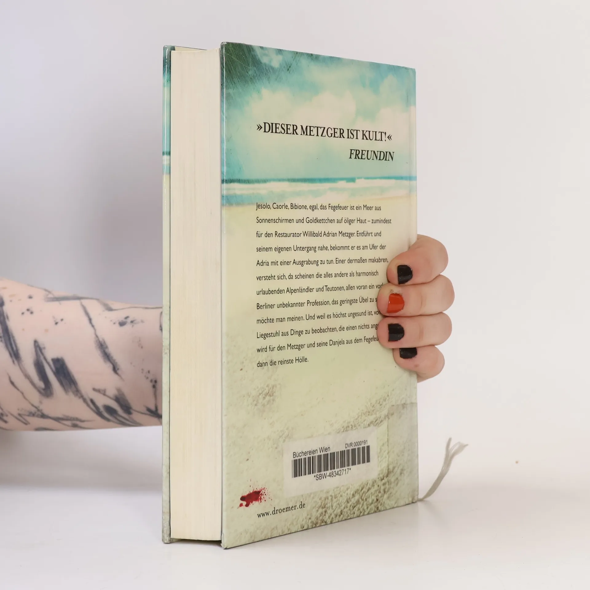 Jesolo, Caorle, Bibione, egal, das Fegefeuer ist ein Meer aus Sonnenschirmen und Goldkettchen auf öliger Haut – zumindest für den Restaurator Willibald Adrian Metzger. Entführt und seinem eigenen Untergang nahe, bekommt er es am Ufer der Adria mit einer Ausgrabung zu tun. Einer dermaßen makabren, versteht sich, da scheinen die alles andere als harmonisch urlaubenden Teutonen und Alpenländer, allen voran ein vorlauter Berliner unbekannter Profession, das geringste Übel zu sein, möchte man meinen. Und weil es höchst ungesund ist, vom Liegestuhl aus Dinge zu beobachten, die einen nichts angehen, wird für den Metzger und seine Danjela aus dem Fegefeuer dann die reinste Hölle.