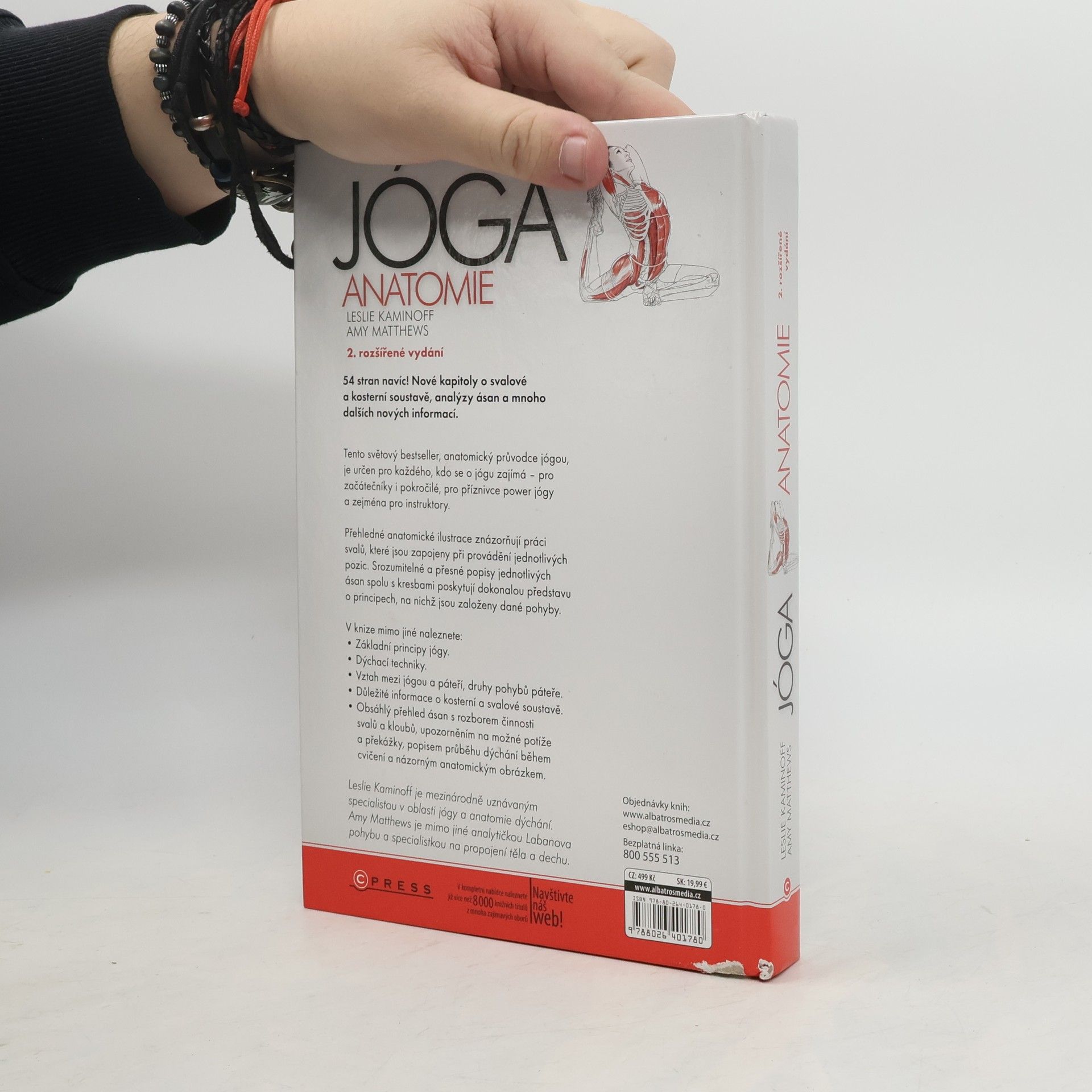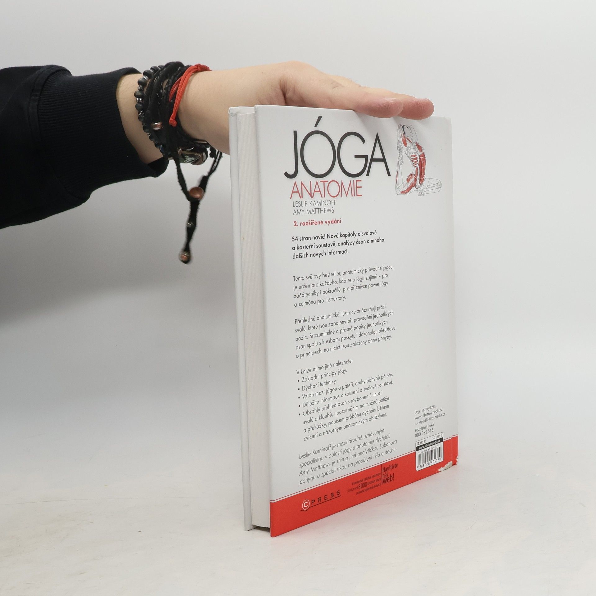 Názorná ilustrovaná publikace určená jak zájemcům o cvičení jógy, tak instruktorům a lektorům. Laické veřejnosti přiblíží význam jógy a její blahodárné působení na svalové skupiny, instruktorům pomůže v jejich práci: kniha představuje jednotlivé pozice - asány - a jejich vliv na svaly, zapojené při provádění daných cviků, s přesnými popisy svalů přímo v ilustraci a srozumitelným slovním vysvětlením. Tento světový bestseller, anatomický průvodce jógou, je určen pro každého, kdo se o jógu zajímá pro začátečníky i pokročilé, pro příznivce power jógy a zejména pro instruktory. Přehledné anatomické ilustrace znázorňují práci svalů, které jsou zapojeny při provádění jednotlivých pozic. Srozumitelné a přesné popisy jednotlivých ásan spolu s kresbami poskytují dokonalou představu o principech, na nichž jsou založeny dané pohyby. V knize mimo jiné naleznete: Základní principy jógy. Dýchací techniky. Vztah mezi jógou a páteří, druhy pohybů páteře. Obsáhlý přehled ásan s rozborem činnosti svalů a kloubů, upozorněním na možné potíže a překážky, popisem průběhu dýchání během cvičení a názorným anatomickým obrázkem. Autor Leslie Kaminoff je mezinárodně uznávaným specialistou v oblasti jógy a anatomie dýchání. Bydlí v USA a pracuje v New Yorku.