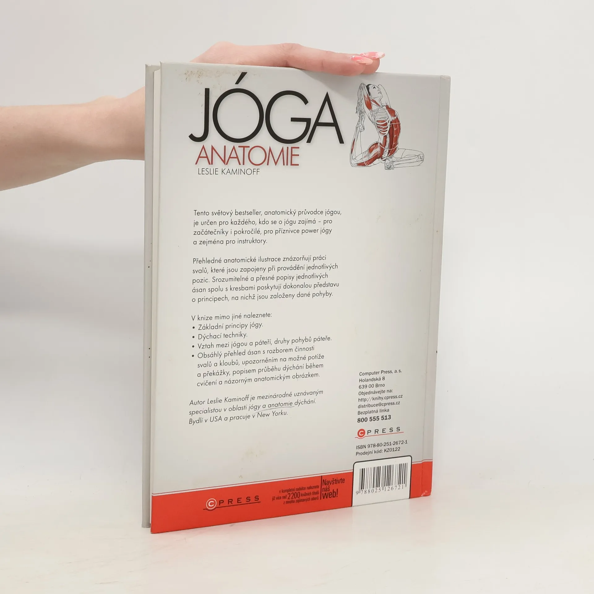 Světový bestseller. Názorná ilustrovaná publikace určená jak zájemcům o cvičení jógy, tak instruktorům a lektorům. Laické veřejnosti přiblíží význam jógy a její blahodárné působení na svalové skupiny, instruktorům pomůže v jejich práci: kniha představuje jednotlivé pozice - asány - a jejich vliv na svaly, zapojené při provádění daných cviků, s přesnými popisy svalů přímo v ilustraci a srozumitelným slovním vysvětlením. Tento světový bestseller, anatomický průvodce jógou, je určen pro každého, kdo se o jógu zajímá pro začátečníky i pokročilé, pro příznivce power jógy a zejména pro instruktory. Přehledné anatomické ilustrace znázorňují práci svalů, které jsou zapojeny při provádění jednotlivých pozic. Srozumitelné a přesné popisy jednotlivých ásan spolu s kresbami poskytují dokonalou představu o principech, na nichž jsou založeny dané pohyby. V knize mimo jiné naleznete: Základní principy jógy. Dýchací techniky. Vztah mezi jógou a páteří, druhy pohybů páteře. Obsáhlý přehled ásan s rozborem činnosti svalů a kloubů, upozorněním na možné potíže a překážky, popisem průběhu dýchání během cvičení a názorným anatomickým obrázkem. Autor Leslie Kaminoff je mezinárodně uznávaným specialistou v oblasti jógy a anatomie dýchání. Bydlí v USA a pracuje v New Yorku.
