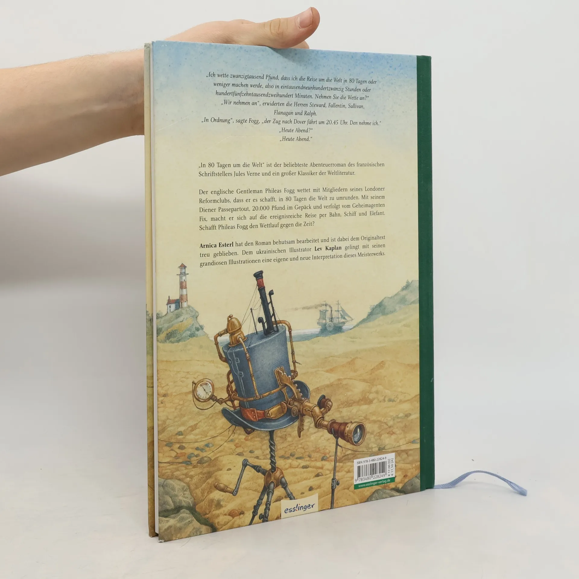 Phileas Fogg wettet, dass er es schafft, in 80 Tagen die Welt zu umrunden. Mit seinem Diener Passepartout und 20.000 Pfund macht er sich auf die abenteuerliche Reise per Bahn, Schiff und Elefant ... Der ukrainische Illustrator Lev Kaplan hat diesen von Arnica Esterl bearbeiteten Abenteuerroman kongenial in Szene gesetzt der Leser ist dabei, beim Wettlauf mit der Zeit.