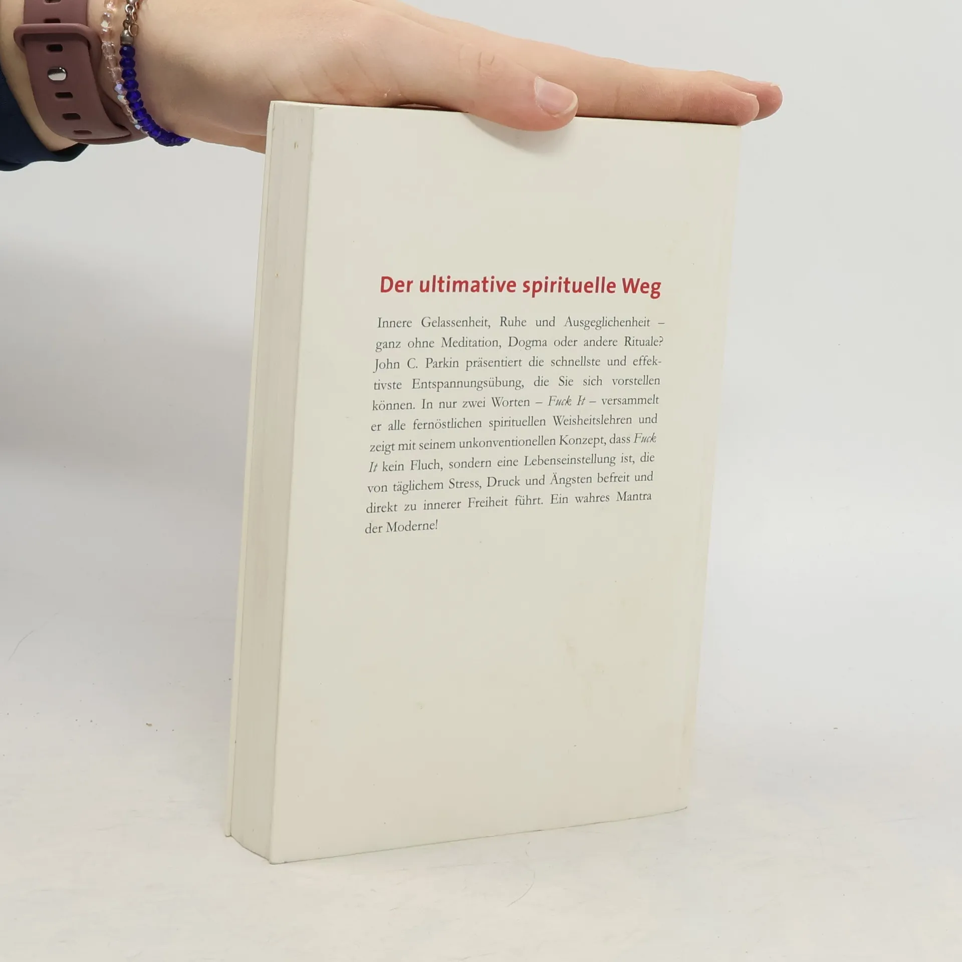 Der ultimative spirituelle Weg Ohne Guru oder jahrelanges Meditieren: John C. Parkin präsentiert die schnellste Entspannungsübung, die man sich vorstellen kann. Es braucht nur zwei Worte, die, laut und voller Überzeugung gesprochen, zu Gelassenheit und innerer Freiheit führen: „Fuck it!“ ist der perfekte Ausdruck der westlichen Welt, der alle fernöstlichen Weisheitslehren in sich vereint. Loslassen, Abstand gewinnen, akzeptieren, was ist, und entspannen. Kurz: „Fuck it!“ ist kein Fluch, sondern eine Lebenseinstellung. Die archaische und anarchische Kraft von „Fuck it!“ hilft dabei, Abstand von den Dingen zu gewinnen, die uns belasten oder die wir uns nicht zutrauen. In all seiner Einfachheit, Klarheit und Effizienz ist es ein spiritueller Weg, der ohne Dogma, meditative Gesänge oder Räucherstäbchen auskommt – und nichtsdestotrotz von unserem täglichen Stress und von Ängsten und Druck befreit. John C. Parkins unkonventionelles Konzept zeigt, wie wir eine neue innere Haltung voller Ruhe und Ausgeglichenheit gewinnen, wenn wir aufhören, alles kontrollieren zu wollen, und lernen, loszulassen. Eine inspirierende Mischung aus Buddhismus und Rebellion, die direkt zu wahrer Freiheit führt. Fernöstliche Weisheit für unseren Alltag, inspirierend und humorvoll.