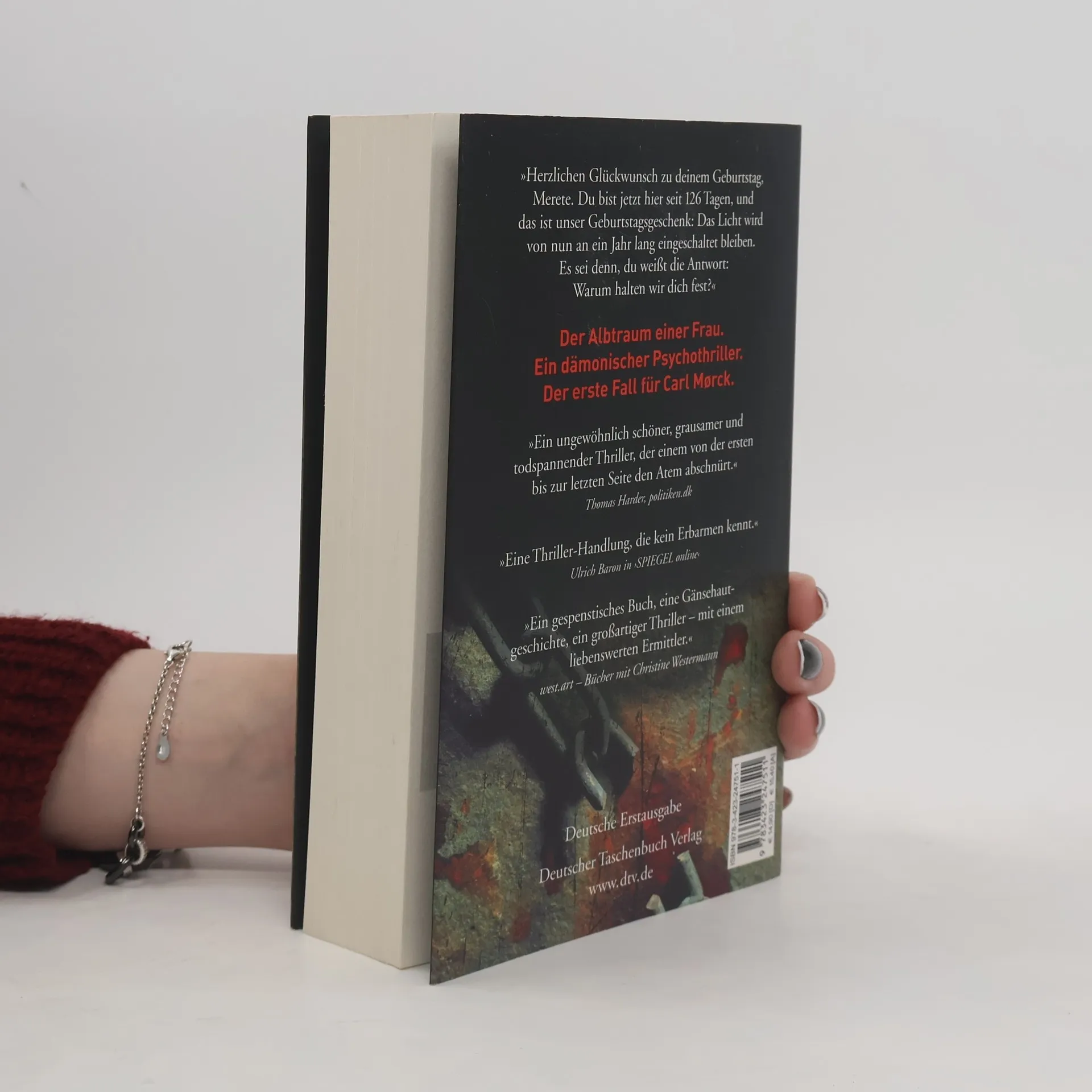 Und dann kam die Angst wie ein schleichendes Gift. Der Albtraum einer Frau.Ein dämonischer Psychothriller.Der erste Fall für Carl Mørckvom Sonderdezernat Q in Kopenhagen. Die verzerrte Stimme kam aus einem Lautsprecher irgendwo im Dunklen: »Herzlichen Glückwunsch zu deinem Geburtstag, Merete. Du bist jetzt hier seit 126 Tagen, und das ist unser Geburtstagsgeschenk: Das Licht wird von nun an ein Jahr lang eingeschaltet bleiben. Es sei denn, du weißt die Antwort: Warum halten wir dich fest?« Am 2. März 2002 verschwindet eine Frau spurlos auf der Fähre von Rødby nach Puttgarden, man vermutet Tod durch Ertrinken. Doch sie ist nicht tot, sondern wird in einem Gefängnis aus Beton gefangen gehalten. Wer sind die Täter? Was wollen sie von dieser Frau? Und: Kann ein Mensch ein solches Martyrium überleben? ››Ein ungewöhnlich schöner und hochspannender Thriller, der einem bis zur letzten Seite den Atem abschnürt.‹‹ politiken. dk Trailer ansehen auf www. adler-olsen. de
