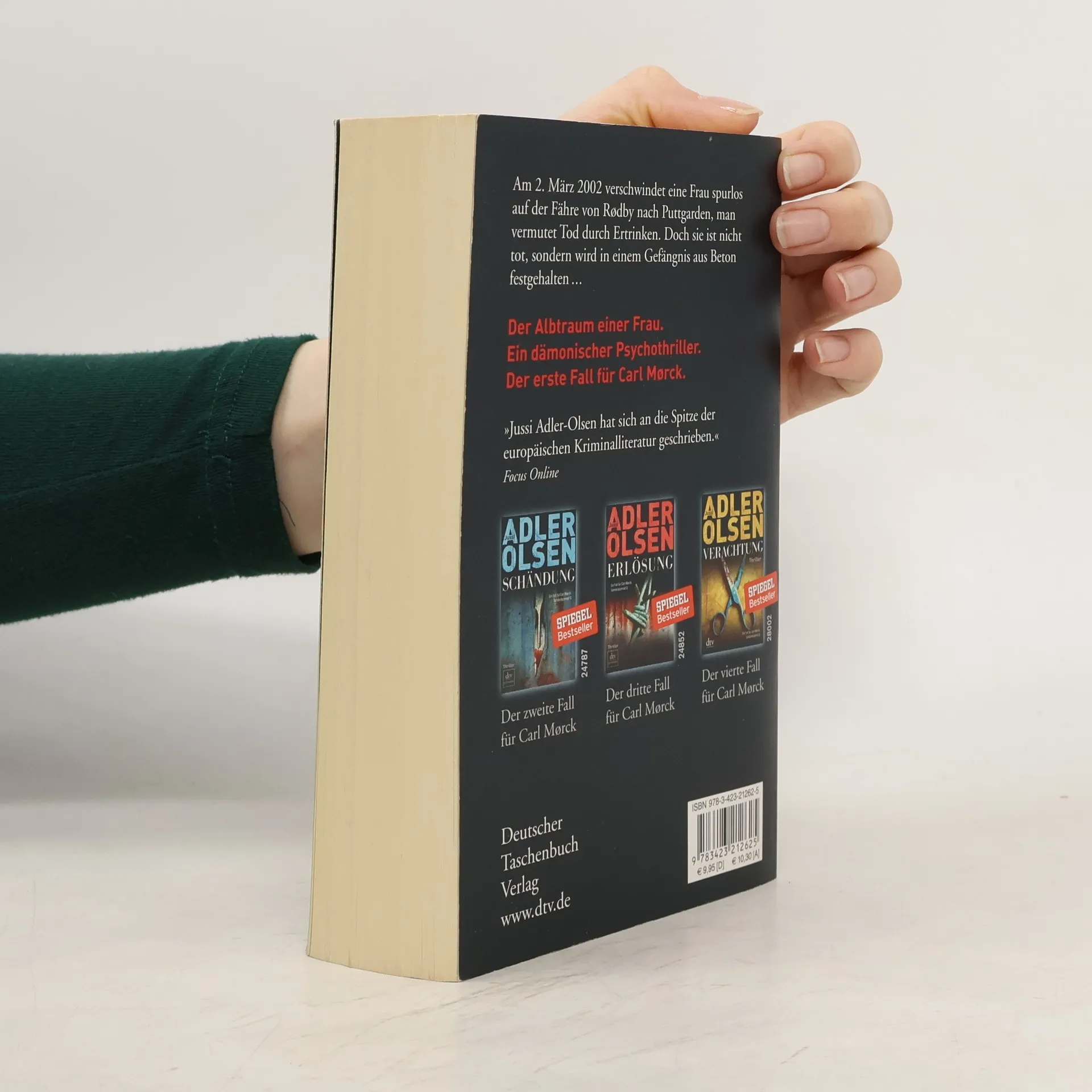 Ein dämonischer Psychothriller und der erste Fall für Carl Mørck vom Sonderdezernat Q für unaufgeklärte Morde der Kopenhagener Polizei. Am 2. März 2002 verschwindet eine Frau auf der Fähre von Rødby nach Puttgarden, und man vermutet, dass sie ertrunken ist. Doch sie lebt und wird in einem Betonverlies gefangen gehalten. Carl Mørck, der neu ernannte Spezialermittler, ist anfangs wenig begeistert von seinem Job, da die Erfolgsquote bei Cold Cases schlecht ist. Sein syrischer Assistent Hafez el-Assad hingegen ist hochmotiviert und entschlossen, den Fall der verschwundenen Politikerin zu lösen. Unbemerkt von ihnen beginnt ein atemloser Wettlauf gegen die Zeit. Der erste Band der Spiegel-Bestseller-Reihe um Carl Mørck und seinen unkonventionellen Assistenten Assad überrascht mit spannenden Wendungen und einem packenden Erzählstil. Kritiker loben das Buch als hart und atmosphärisch dicht, sowie als einen außergewöhnlich spannenden Thriller, der bis zur letzten Seite fesselt. Jussi Adler-Olsen wird mit seiner Erzählweise mit Größen wie Dean Koontz und Stieg Larsson verglichen und begeistert Leser mit seiner Fähigkeit, die Ermittlungen rasant voranzutreiben. Neben der Carl-Mørck-Reihe sind auch weitere Titel des Autors bei dtv erschienen.