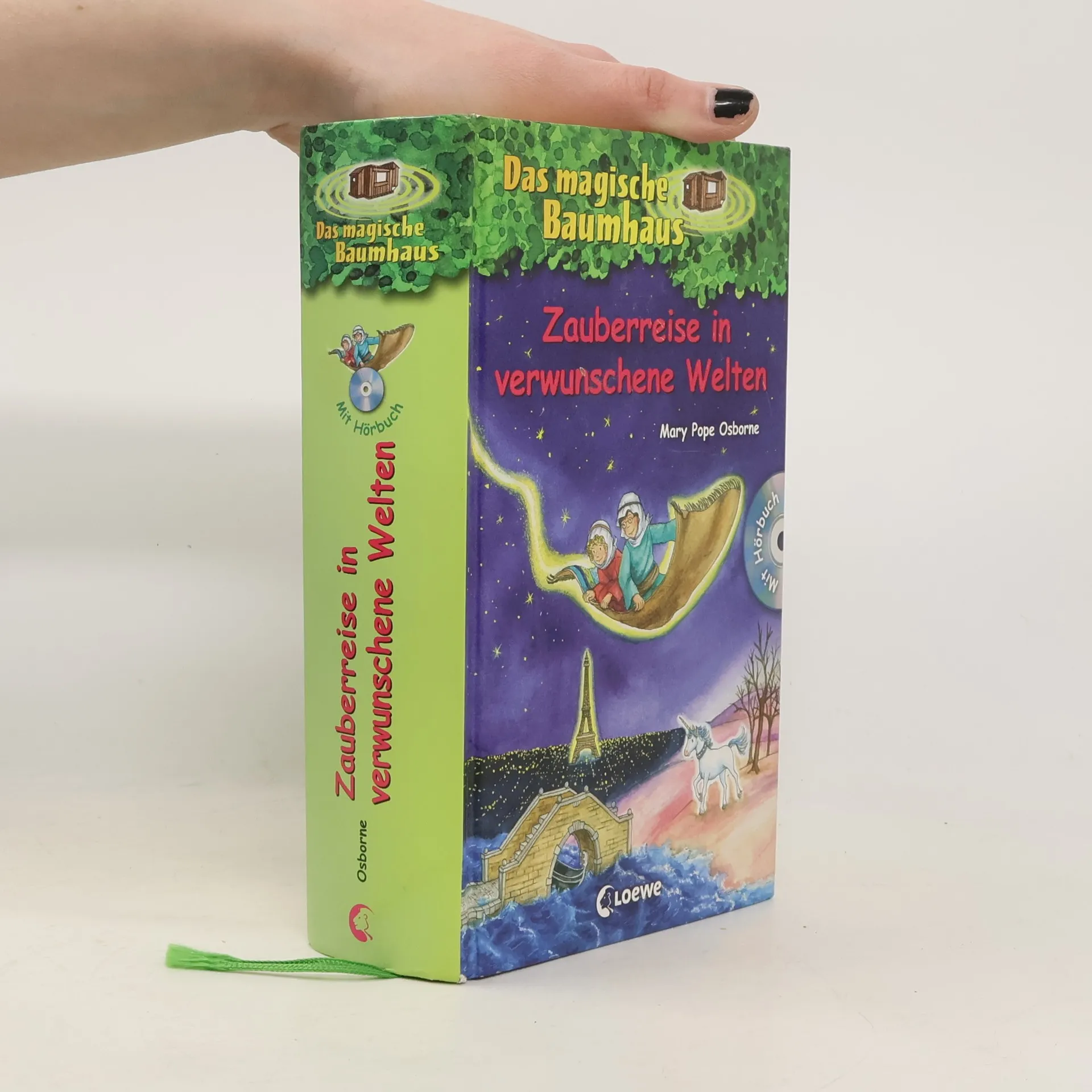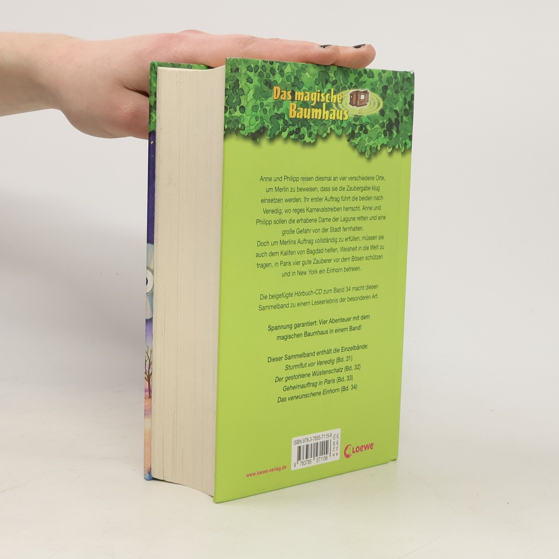 Anne und Philipp reisen diesmal an vier verschiedene Orte, um Merlin zu beweisen, dass sie die Zaubergabe klug einsetzen werden.Ihr erster Auftrag führt die beiden nach Venedig, wo reges Karnevalstreiben herrscht. Anne und Philipp sollen die erhabene Dame der Lagune retten und eine große Gefahr von der Stadt fernhalten.Doch um Merlins Auftrag vollständig zu erfüllen, müssen sie auch dem Kalifen von Bagdad helfen, Weisheit in die Welt zu tragen, in Paris vier gute Zauberer vor dem Bösen schützen und in New York ein Einhorn befreien. Die beigefügte Hörbuch-CD zum Band 34 macht diesen Sammelband zu einem Leseerlebnis der besonderen Art. Dieser Sammelband enthält die Einzelbände:„Sturmflut vor Venedig“ (Bd. 31)„Der gestohlene Wüstenschatz“ (Bd. 32)„Geheimauftrag in Paris“ (Bd. 33)„Das verwunschene Einhorn“ (Bd. 34) Die beliebte Kinderbuch-Reihe von Bestsellerautorin Mary Pope Osborne! Die Geschwister Anne und Philipp reisen mit dem magischen Baumhaus durch die Zeit. Sie erleben spannende Abenteuer, entdecken ferne Länder und lernen viele berühmte Persönlichkeiten kennen.