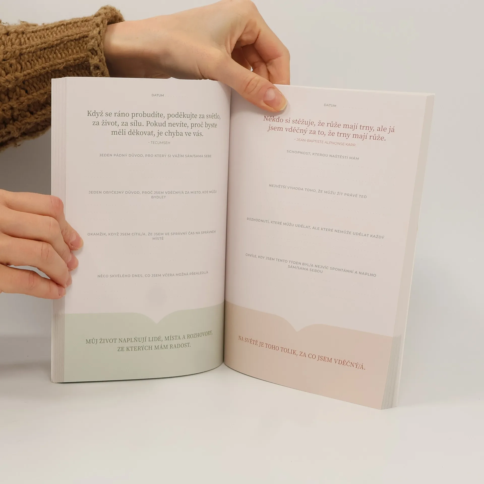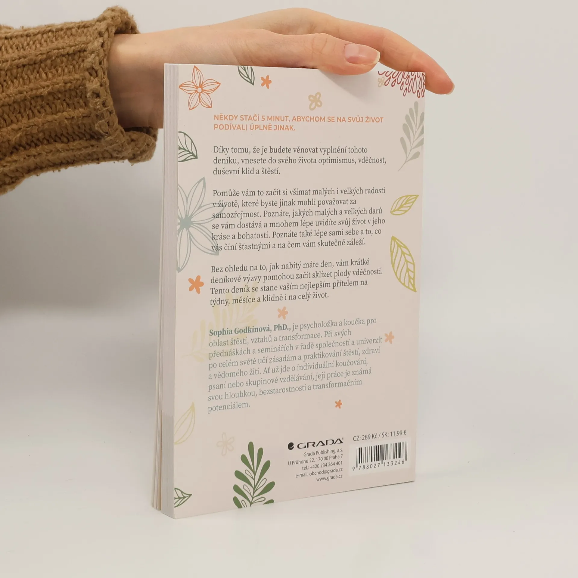 pro více radosti, stěstí a optimismu Někdy stačí 5 minut, abychom se na svůj život podívali úplně jinak. Díky tomu, že je budete věnovat vyplnění tohoto deníku, vnesete do svého života optimismus, vděčnost, duševní klid a štěstí. Pomůže vám to začít si všímat malých i velkých radostí v životě, které byste jinak mohli považovat za samozřejmost. Poznáte, jakých malých a velkých darů se vám dostává a mnohem lépe uvidíte svůj život v jeho kráse a bohatosti. Poznáte také lépe sami sebe a to, co vás činí šťastnými a na čem vám skutečně záleží. Bez ohledu na to, jak nabitý máte den, vám krátké deníkové výzvy pomohou začít sklízet plody vděčnosti. Tento deník se stane vaším nejlepším přítelem na týdny, měsíce a klidně i na celý život.