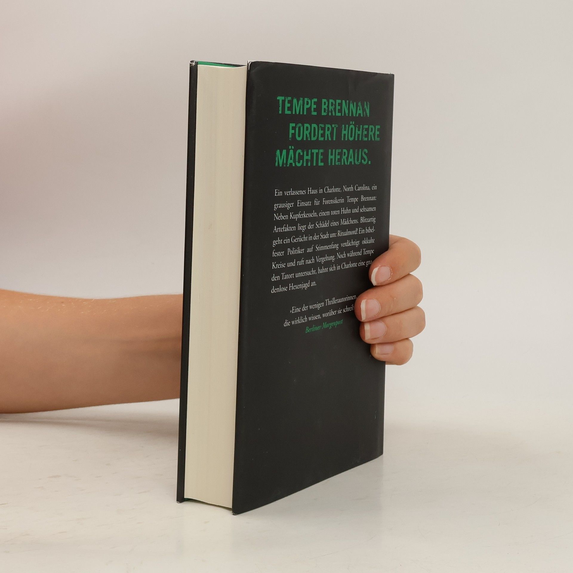 Sie werden ein Opfer bringen – Ihren Schlaf Ein verlassenes Haus in Charlotte, North Carolina, ein grausiger Einsatz für die Forensikerin Tempe Brennan: Neben Kupferkesseln und Vogelschnäbeln liegt der abgetrennte Kopf eines Mädchens. Blitzartig geht ein Gerücht um: Ritualmord! Ein bibelfester Politiker auf Stimmenfang verdächtigt okkulte Kreise und ruft nach Vergeltung. Noch während Tempe die Tatorte untersucht, bahnt sich in Charlotte eine gnadenlose Hexenjagd an. Wie und wo das junge Mädchen zu Tode kam, kann Tempe sich nicht erklären, als sie im Dunkel des Kellers kniet. Genauso wenig wie die Herkunft eines Männertorsos, der wenig später aus dem Catawba-River geborgen wird. Als der Öffentlichkeit einige außergewöhnliche Details von den Fundorten bekannt werden, geraten in North Carolina ansässige, religiöse Kulte in Verdacht: Santería, Wicca, Satanisten. Ein ehemaliger Prediger und wahlkämpfender Politiker denkt nicht daran, Brennans Ermittlungen abzuwarten. Er rät seinen Bürgern, das Gesetz selbst in die Hand zu nehmen. Und Tempe gerät zwischen die Fronten eines Kampfes zwischen höheren, finsteren Mächten.