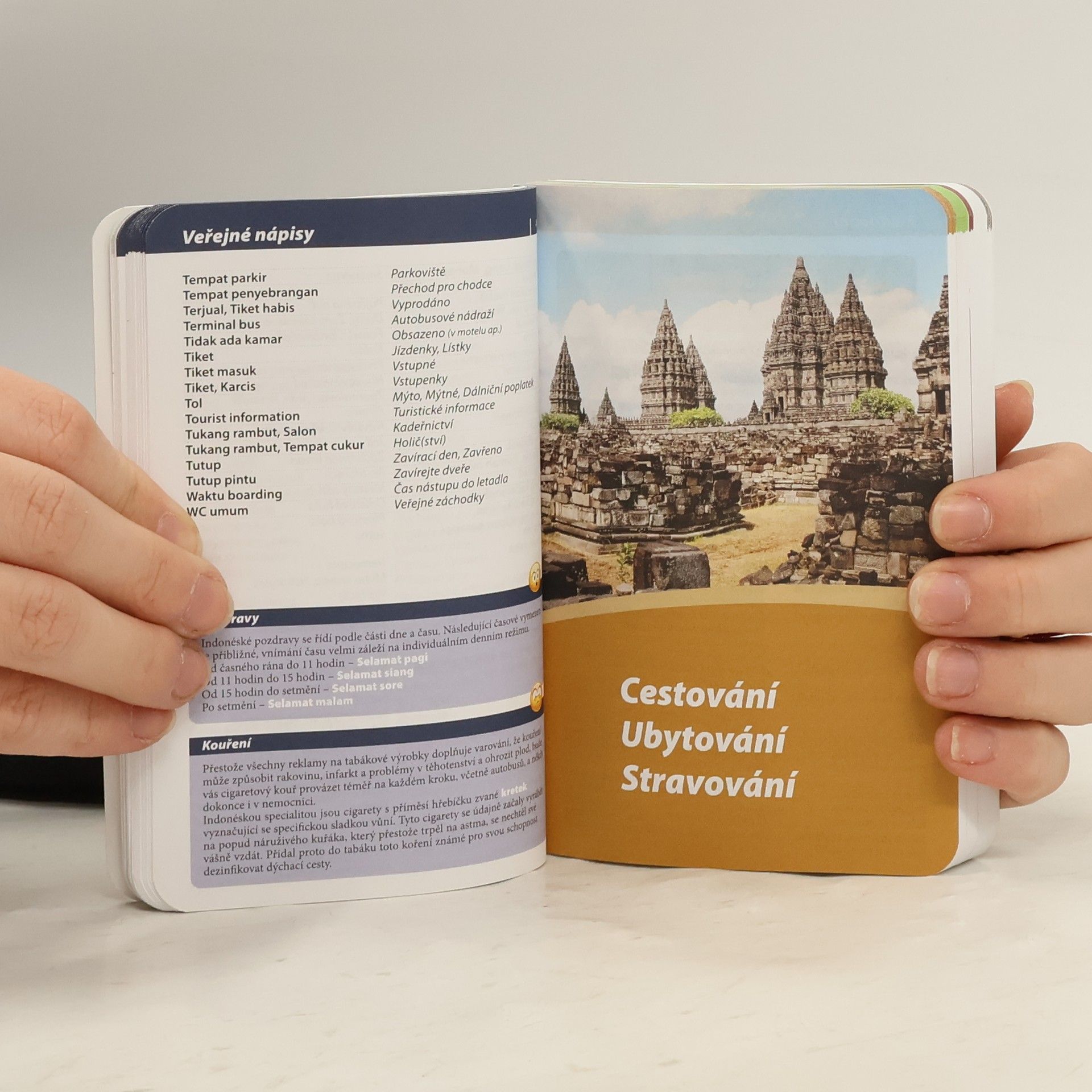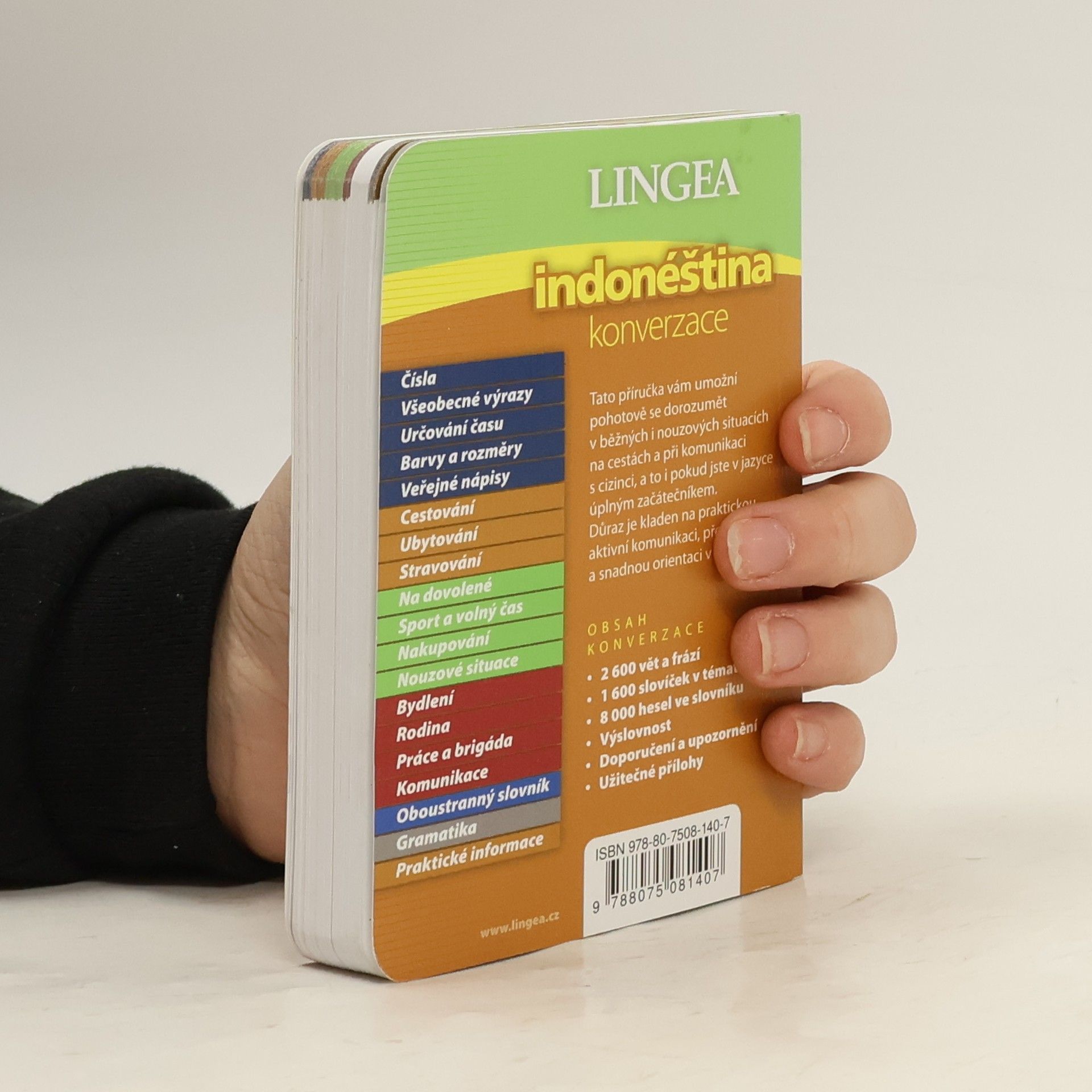 Indonéština patří k vzdálené malajsko-polynéské jazykové skupině. Vyznačuje se velmi jednoduchou gramatikou bez času a pádů, snadnou výslovností a píše se latinkou. Její základy lze při určitém úsilí zvládnout již za pár týdnů, které zbývají před odjezdem za exotikou. Součástí příručky je i oboustranný slovník a základní přehled gramatiky. 2 600 vět a frází, 1 600 slovíček v tématech 6 000 hesel ve slovníku (pouze v knize) Doporučení a upozornění Přepis výslovnosti všech frází 19 stran gramatiky 12 stran praktických informací o zemi