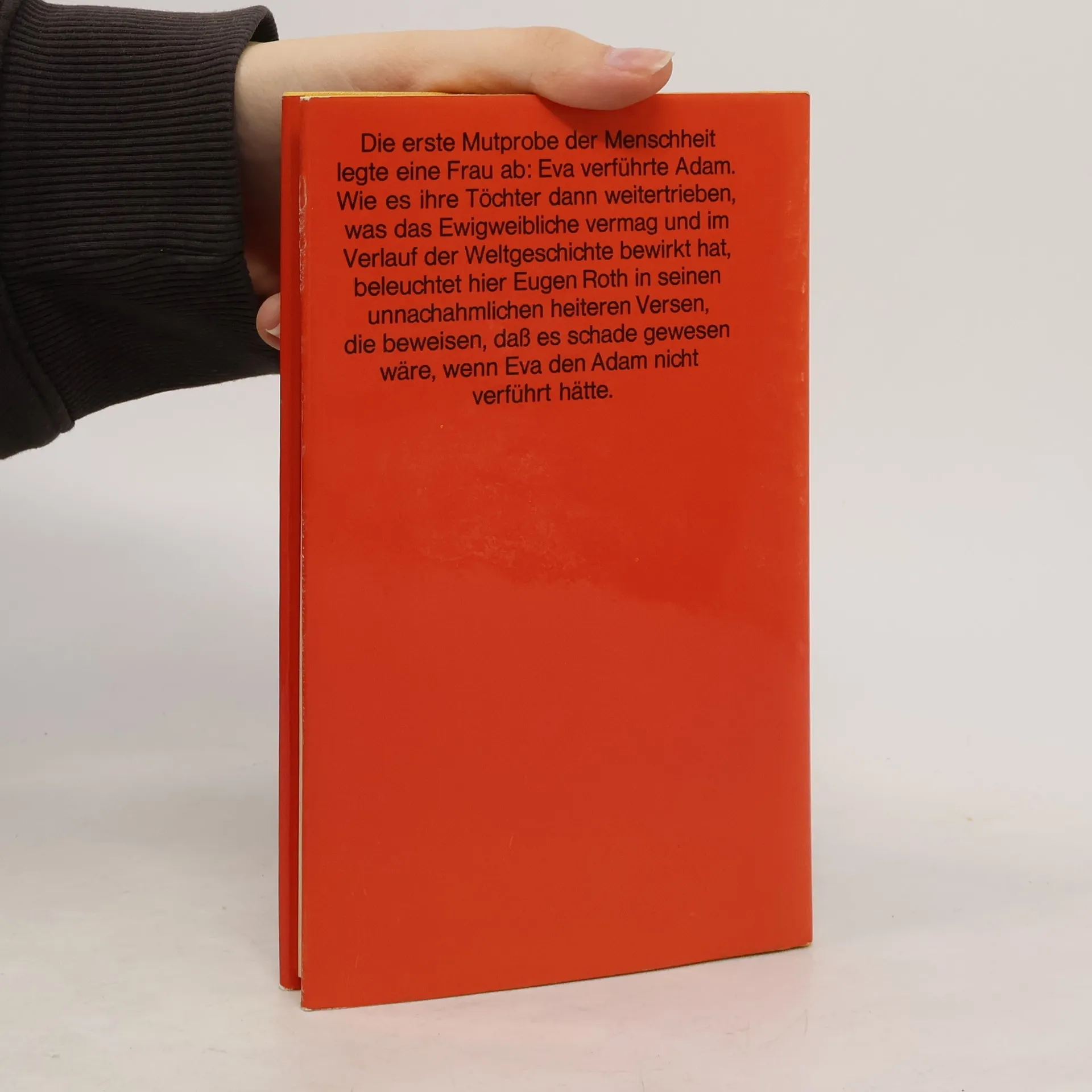 Die erste Mutprobe der Menschheit legte eine Frau ab: Eva verführte Adam. Wie es ihre Töchter dann weitertrieben, was das Ewigweibliche vermag und im Verlauf der Weltgeschichte bewirkt hat, beleuchtet hier Eugen Roth in seinen unnachahmlichen heiteren Versen, die beweisen, daß es schade gewesen wäre, wenn Eva den Adam nicht verführt hätte.