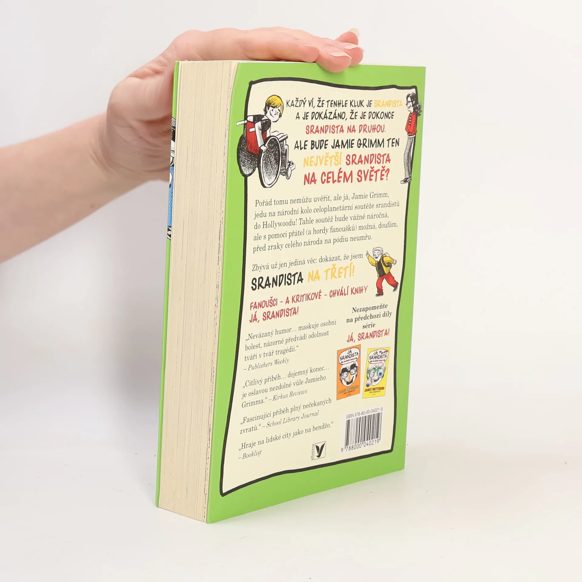 Třetí díl té nejsrandovnější série od Jamese Pattersona! Každý ví, že tenhle kluk je srandista. A je dokázáno, že je dokonce srandista na druhou. Ale bude Jamie Grimm ten největší srandista na celém světě? Pořád tomu nemůžu uvěřit, ale Já, Jamie Grimm, jedu na národní kolo celoplanetární soutěže srandistů do Hollywoodu! Tahle soutěž bude vážně náročná, ale s pomocí přátel (a hordy fanoušků) možná, doufám, před zraky celého národa na pódiu neumřu. Zbývá už jen jediná věc: dokázat, že jsem Srandista na třetí!